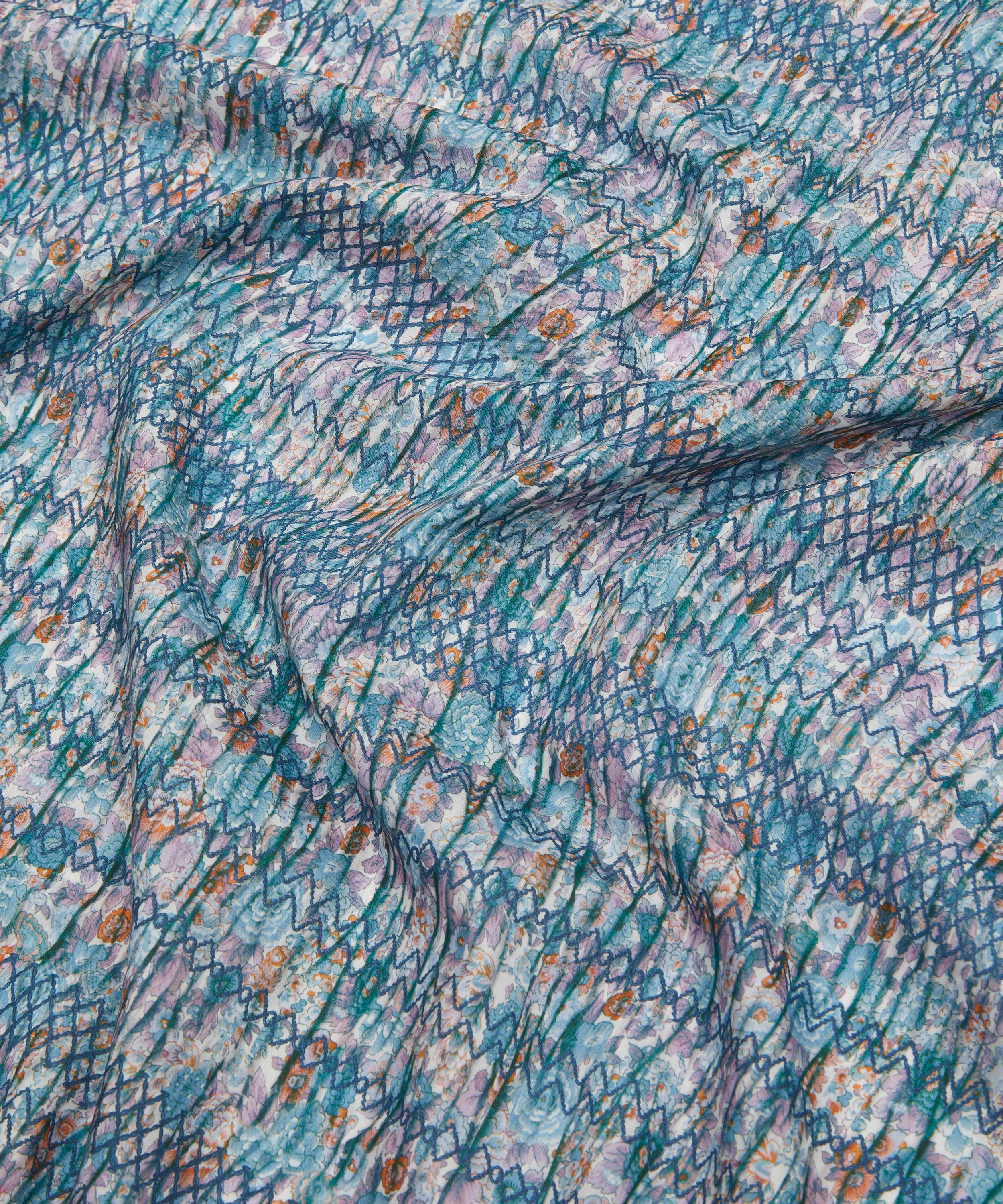 Looking back to Liberty’s 1887 childrenswear department and the enduring charm of smocked dresses from that era, this unusual pattern is a fresh take on our beloved classic, Elysian. Delicate diamond-shaped stitches create a series of textured pleats and folds, creating the illusion of a beautifully nostalgic floral fabric gathered into a garment. This print is part of the Craftsmanship narrative of this collection, exploring the creative process from within the Liberty archive, from print impressions and embroidered studies, to ceramics, jewellery, and furniture. Uncover the origins of the designers’ musings through artworks inspired by their sketchbooks and prototypes.