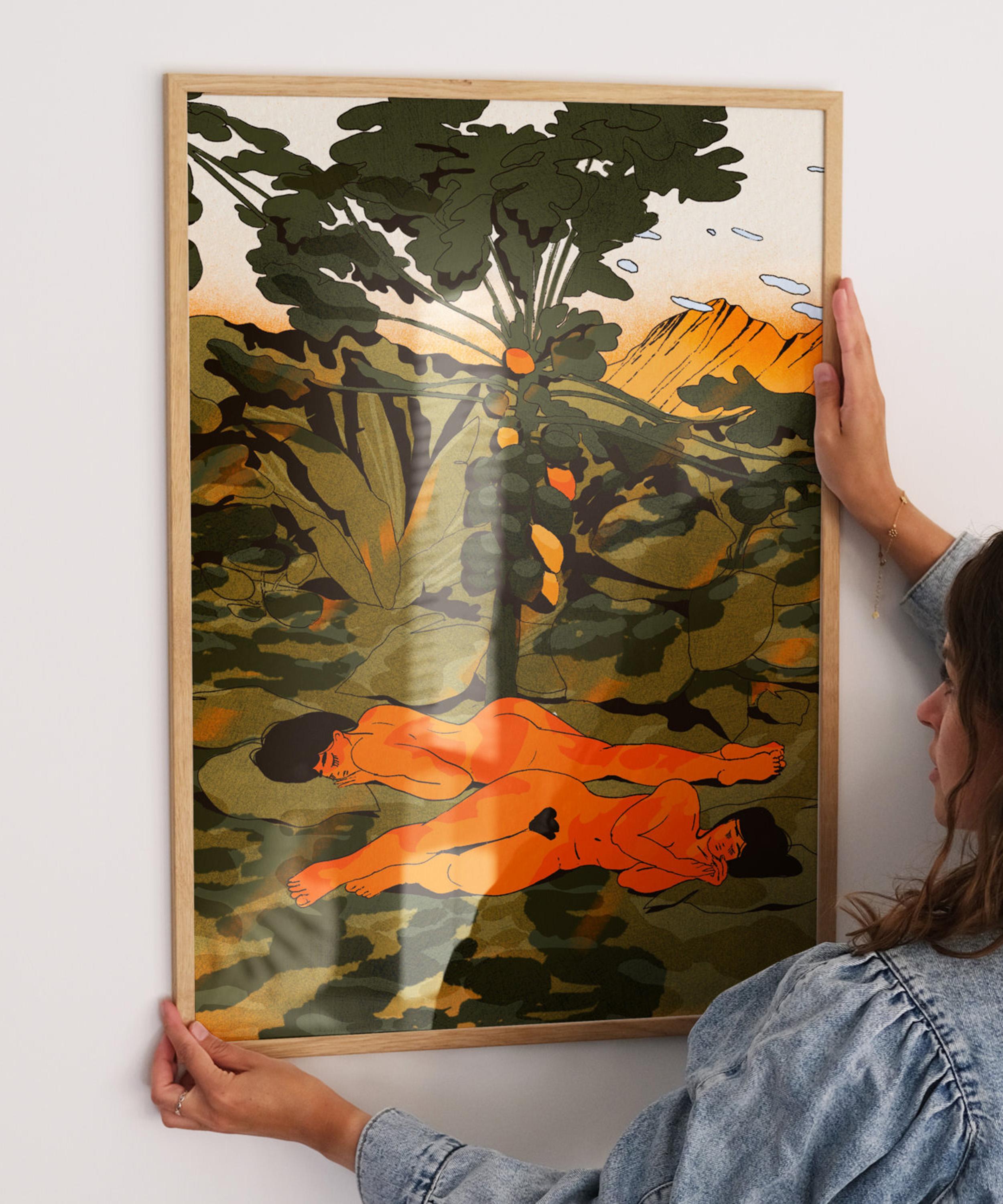 Offering an online emporium of premium posters and art exhibition prints, PSTR Studio seeks to enhance and restore unique vintage works, and present unique pieces by brilliant upcoming as well as historically renowned artists. This piece showcases vivid papayas nestled among lush green, blending vibrant colours with botanical charm. Enikő Eged, a Budapest-based illustrator, crafts unique narratives through her simplistic yet evocative designs, inspired by her mood and experiences. Hang it in an office, hallway or incorporate it into a gallery wall to bring delicate magic to your living space.