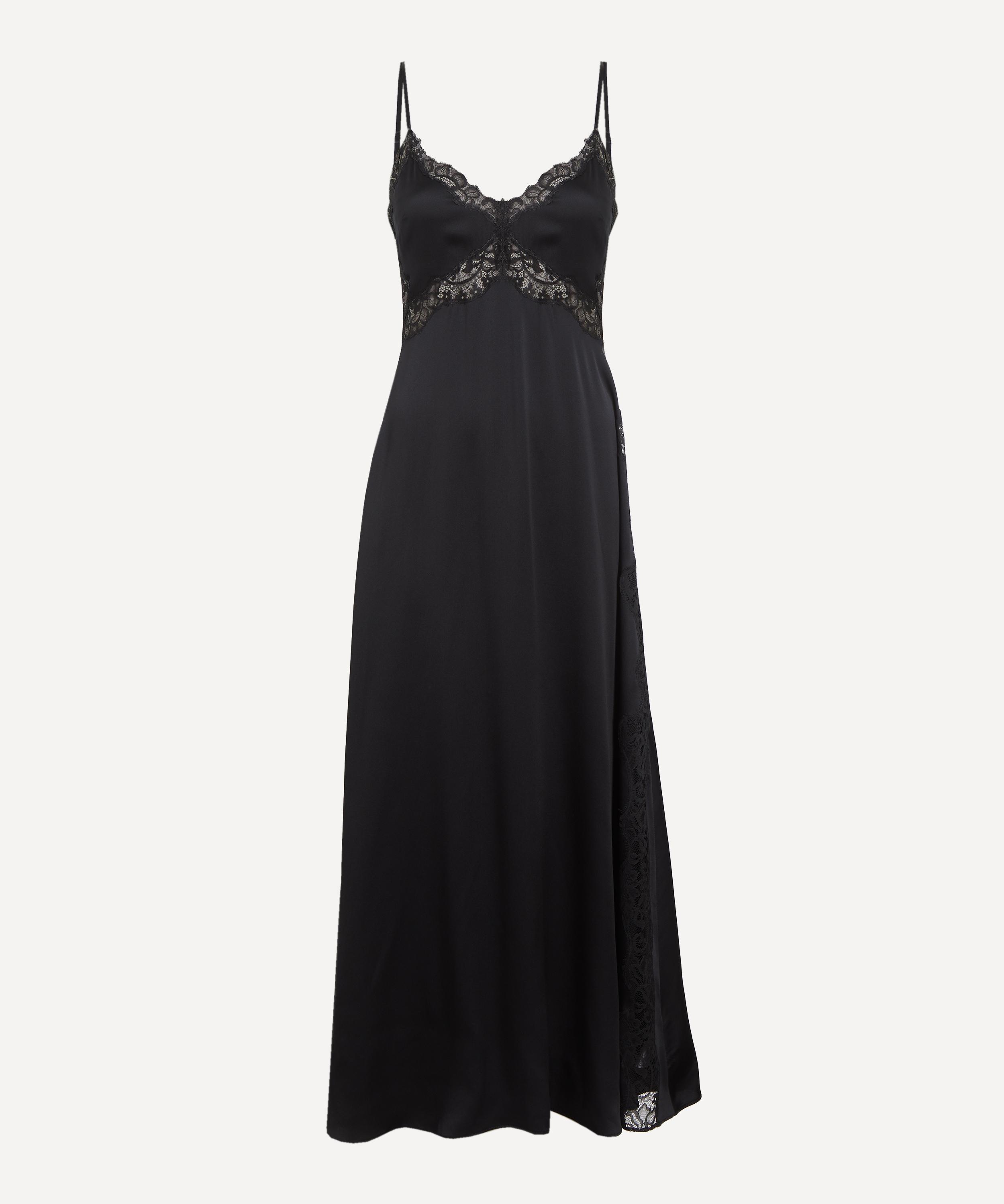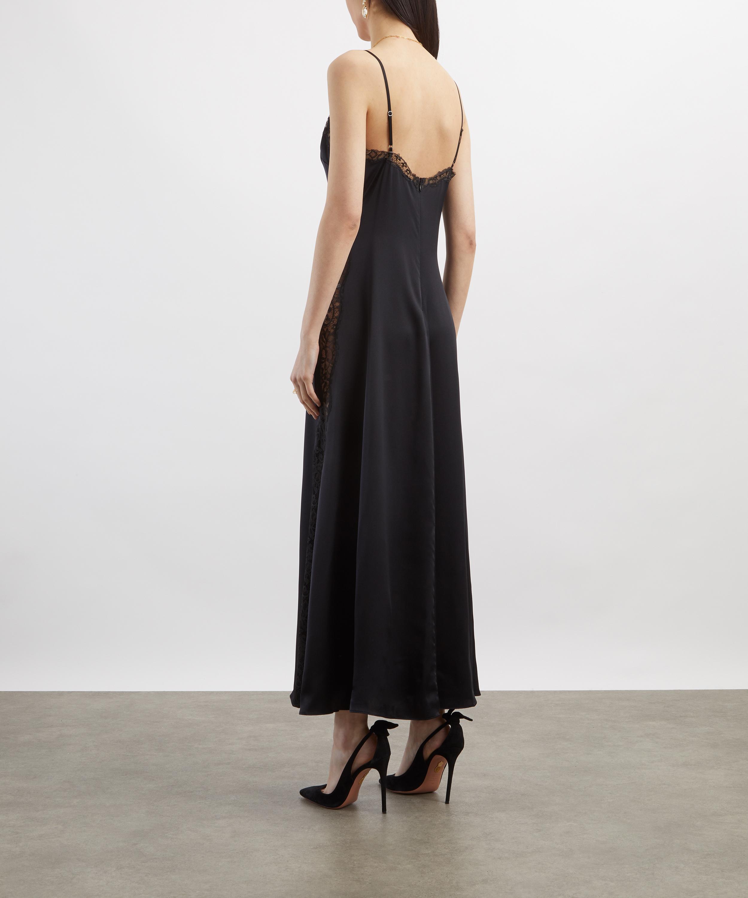 Crafted from lightweight silk charmeuse, this sleek slip dress embodies understated refinement. Designed with a slim, ankle-skimming silhouette, it features a sweetheart neckline and empire waist, finished with delicate lace trims for a softly romantic touch.