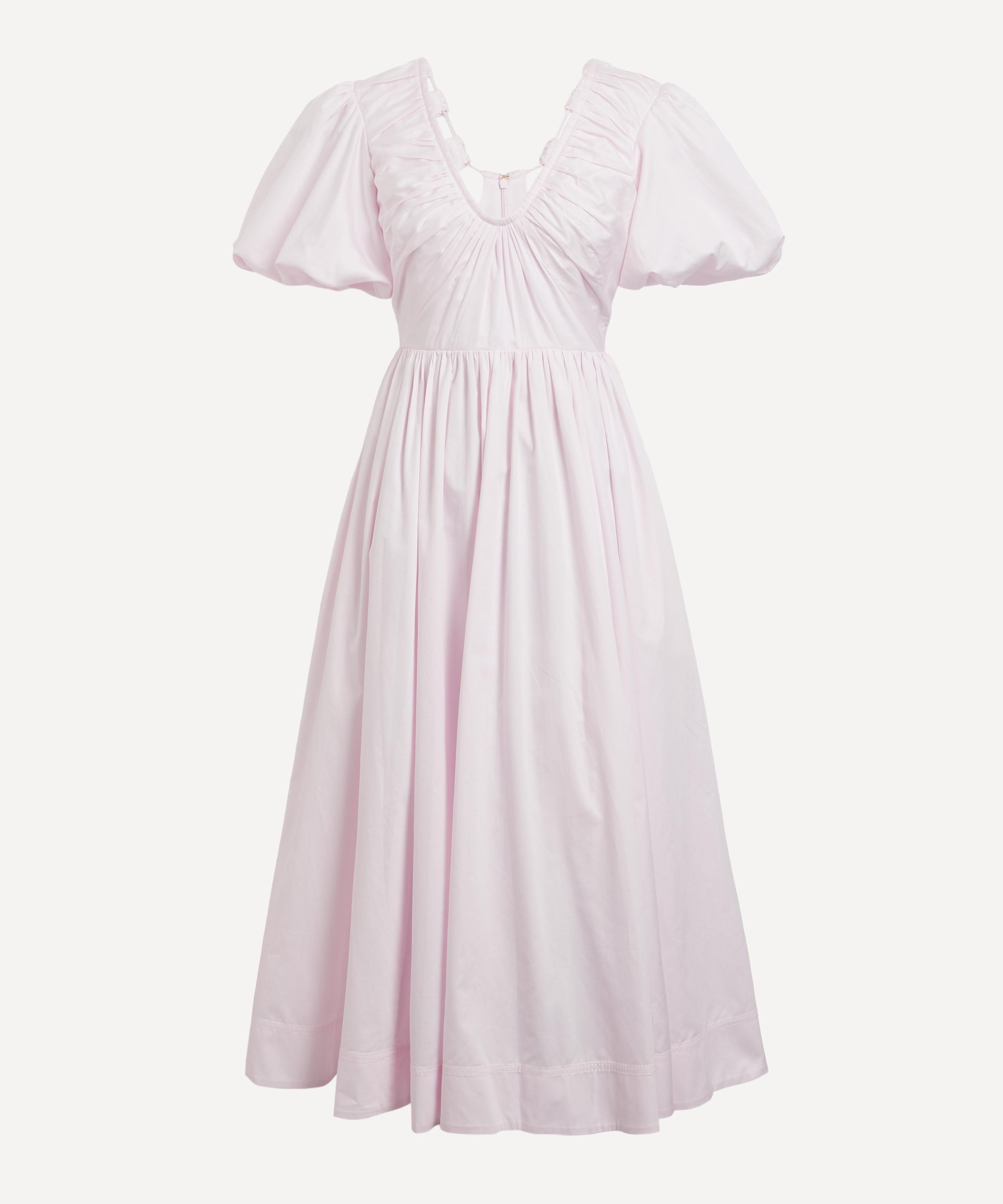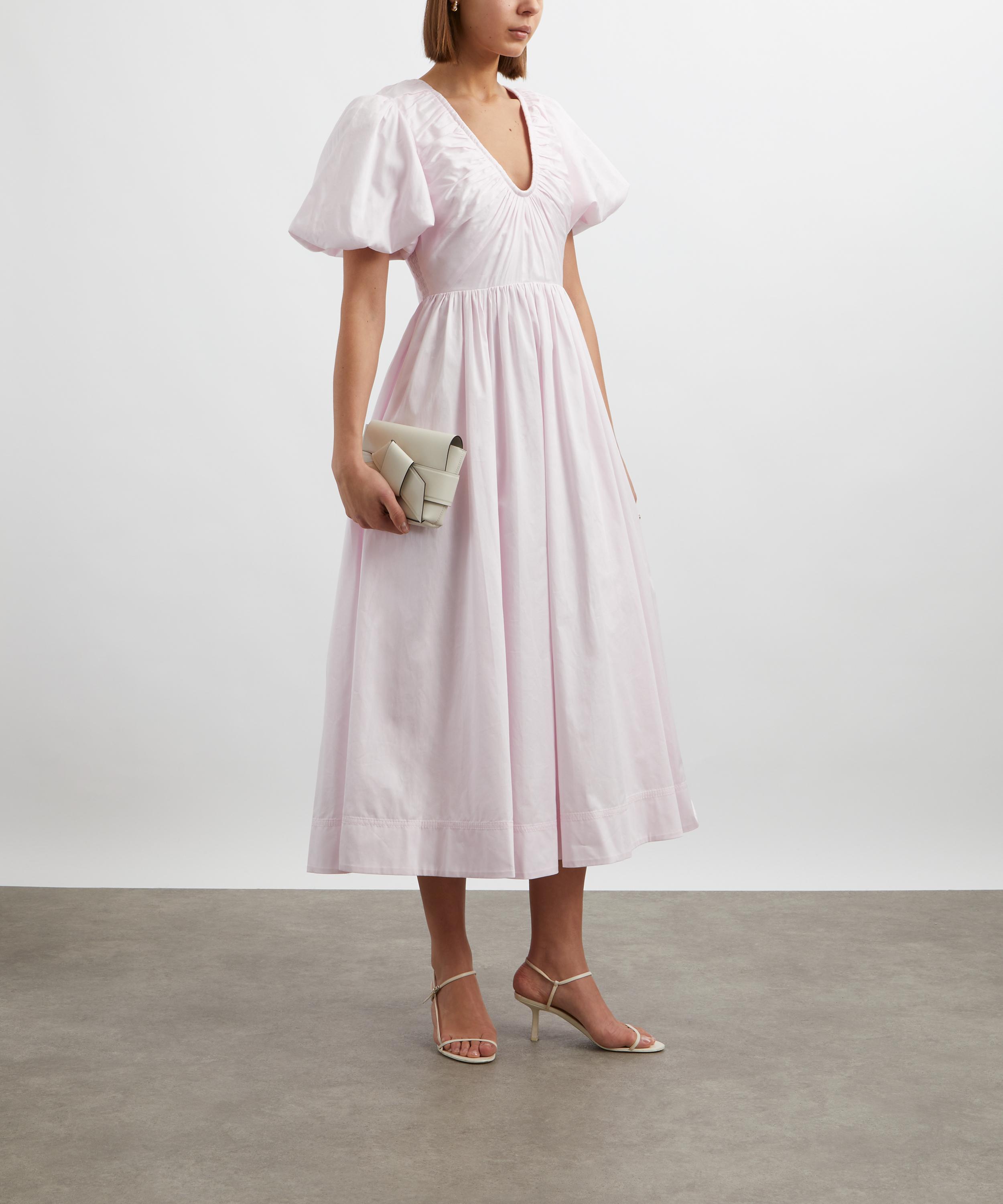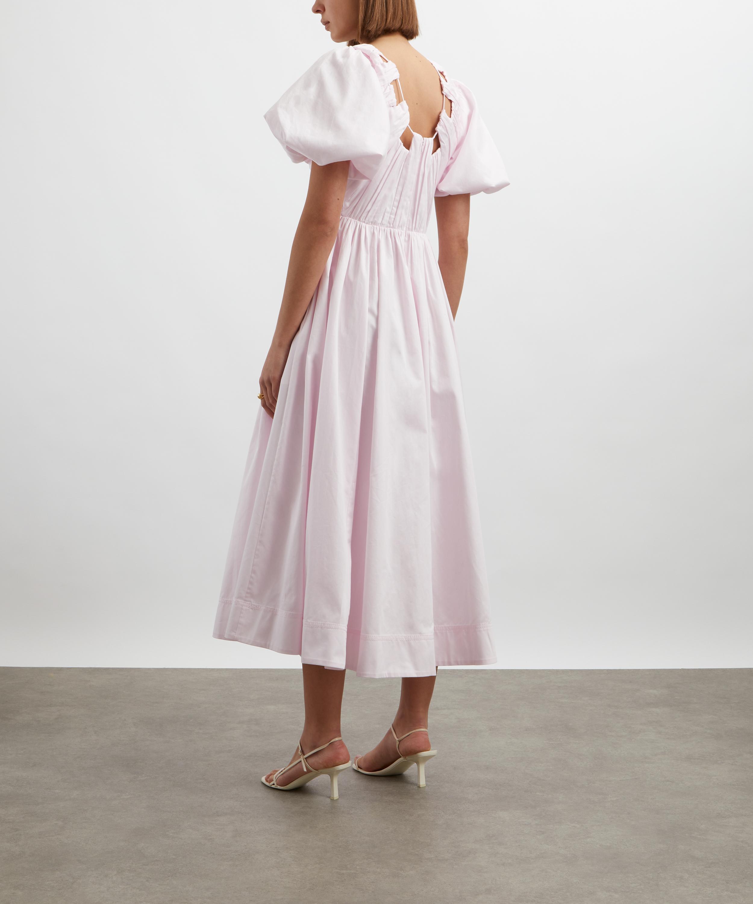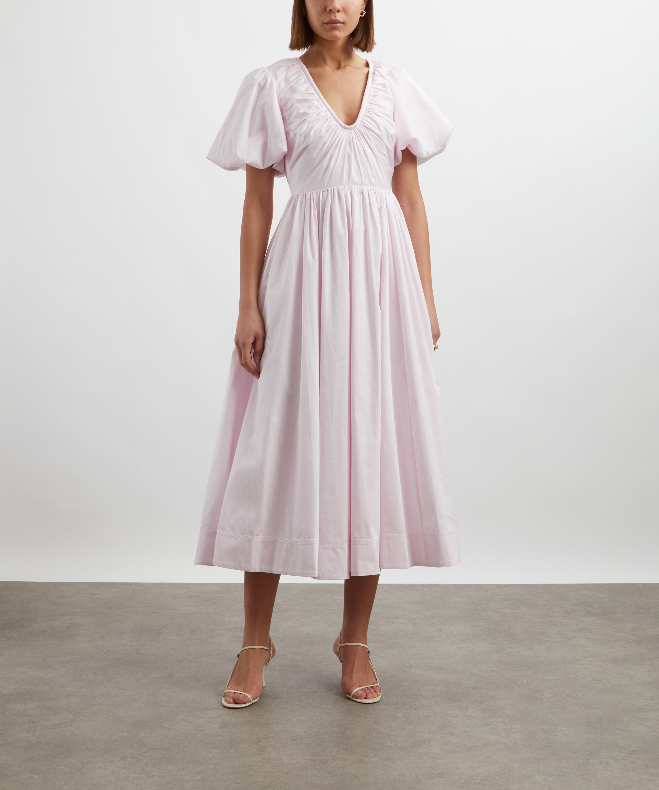 With its flattering fit-and-flare silhouette, short puff sleeves, and low scoop neckline, the Esmerie dress exudes timeless femininity. Crafted from soft cotton, this pale-pink dress is beautifully accented with delicate ruched detailing for a refined finish.