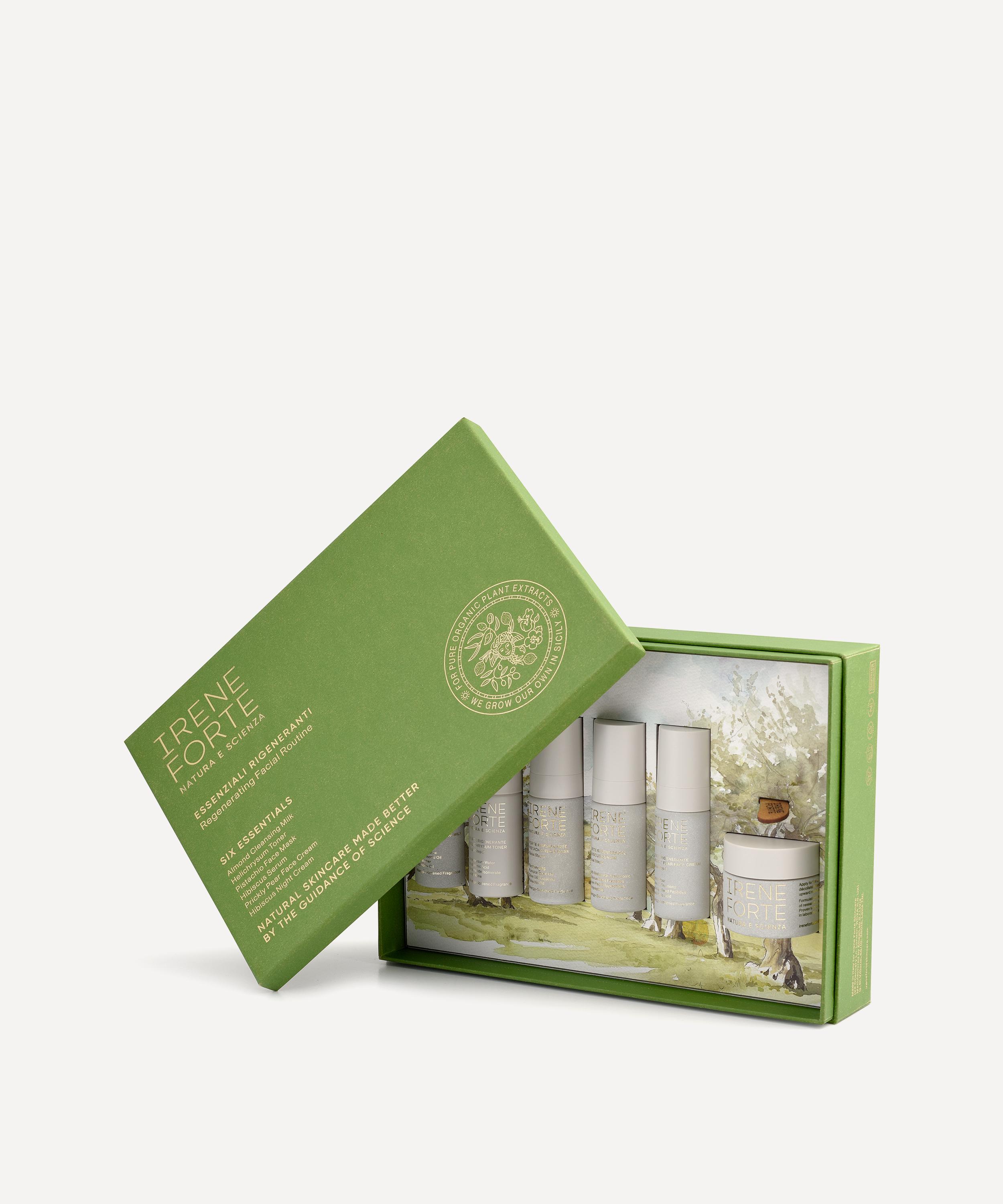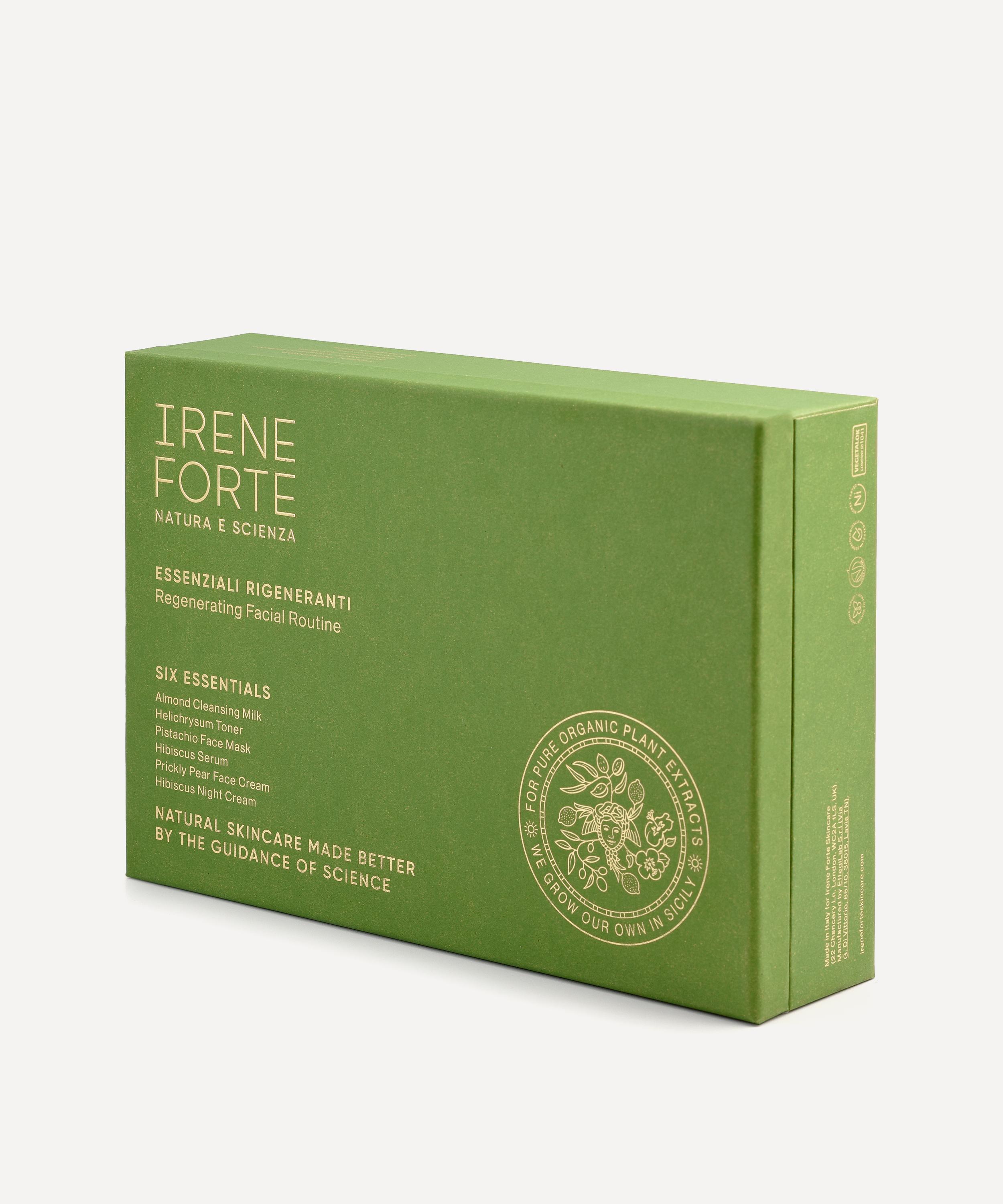 - Essenziali Rigeneranti Kit includes: Almond Cleansing Milk 15ml, Helichrysum Toner 30ml, Pistachio Face Mask 15ml, Hibiscus Serum 15ml, Prickly Pear Face Cream 15ml, Hibiscus Night Cream 30ml