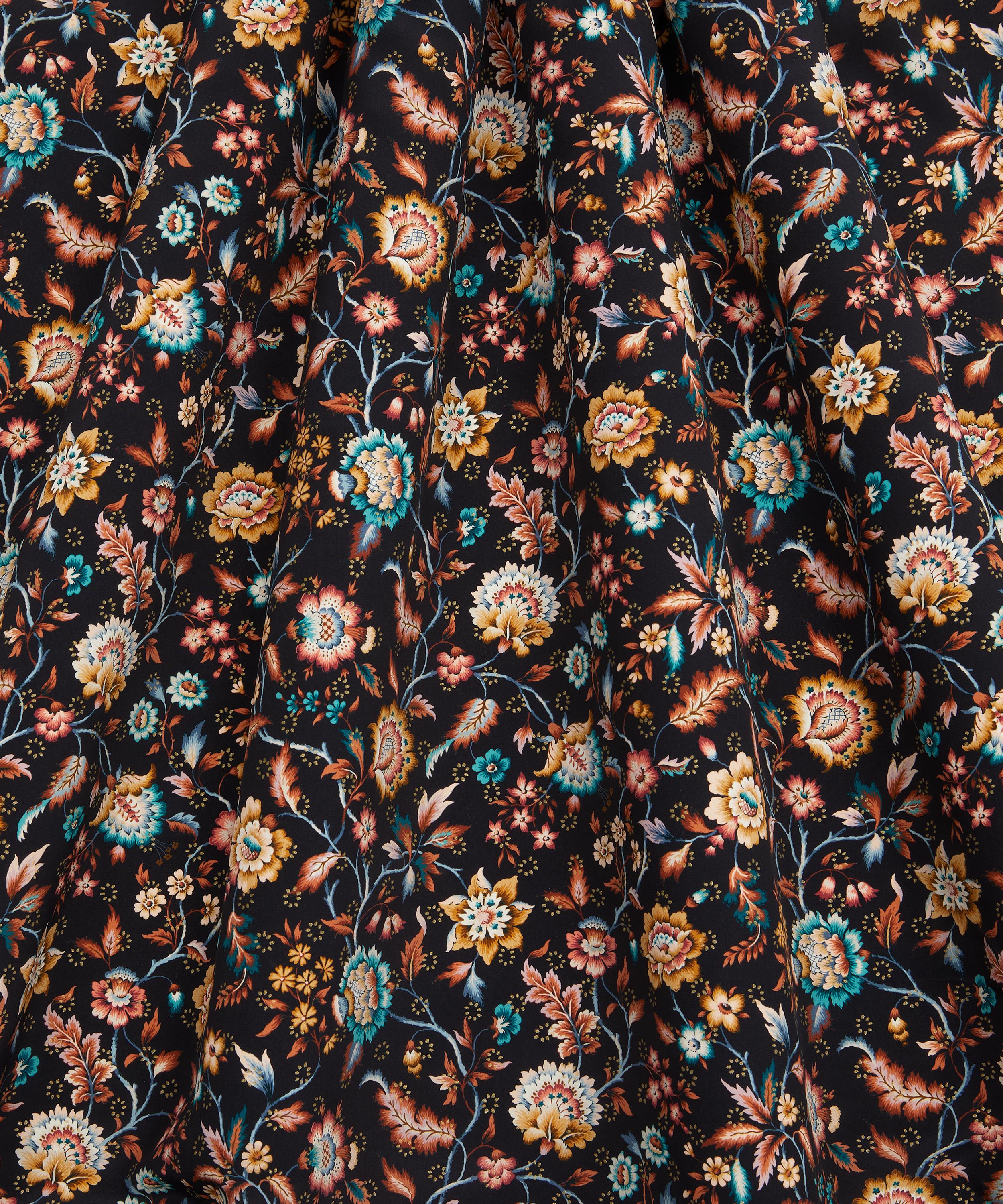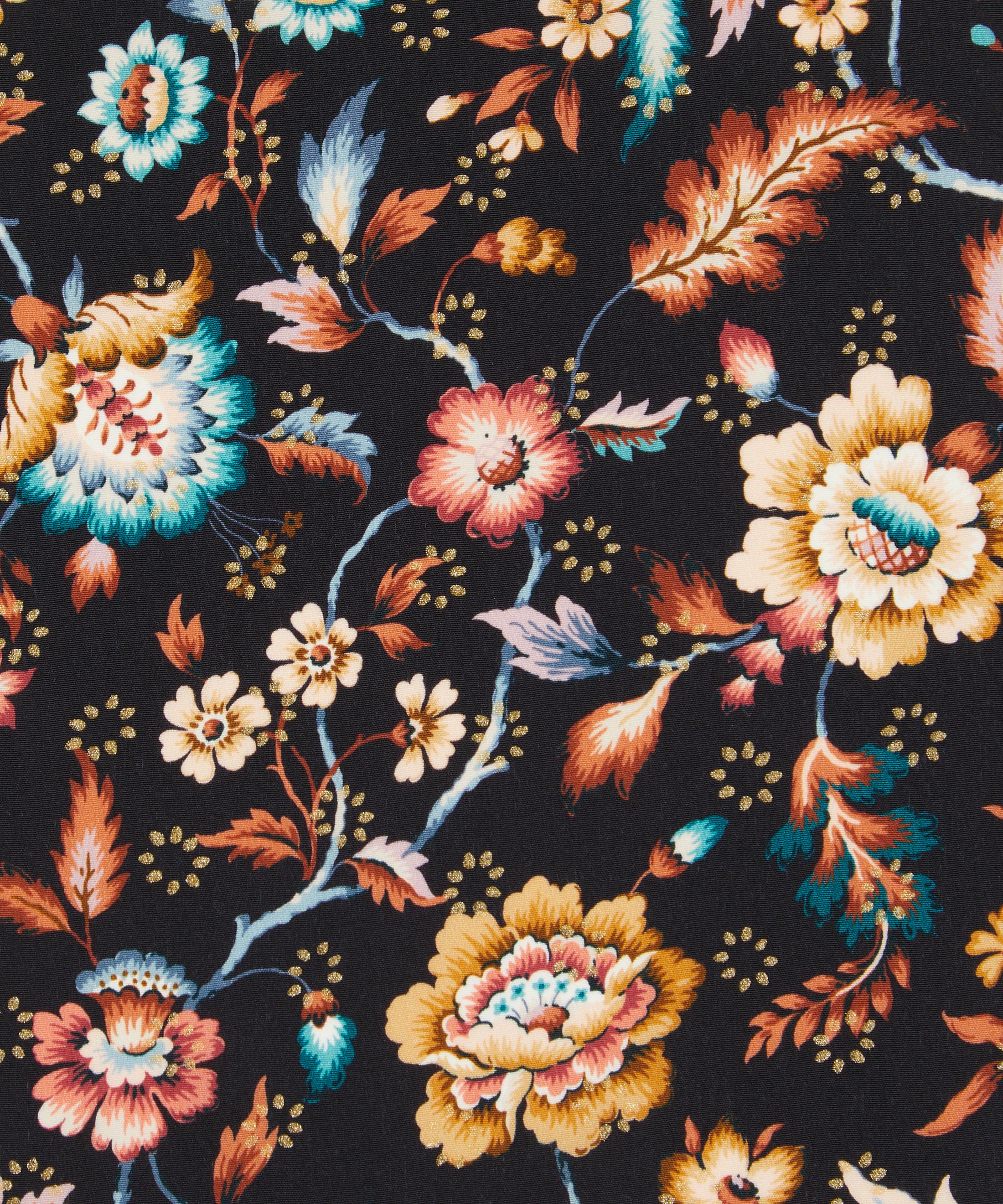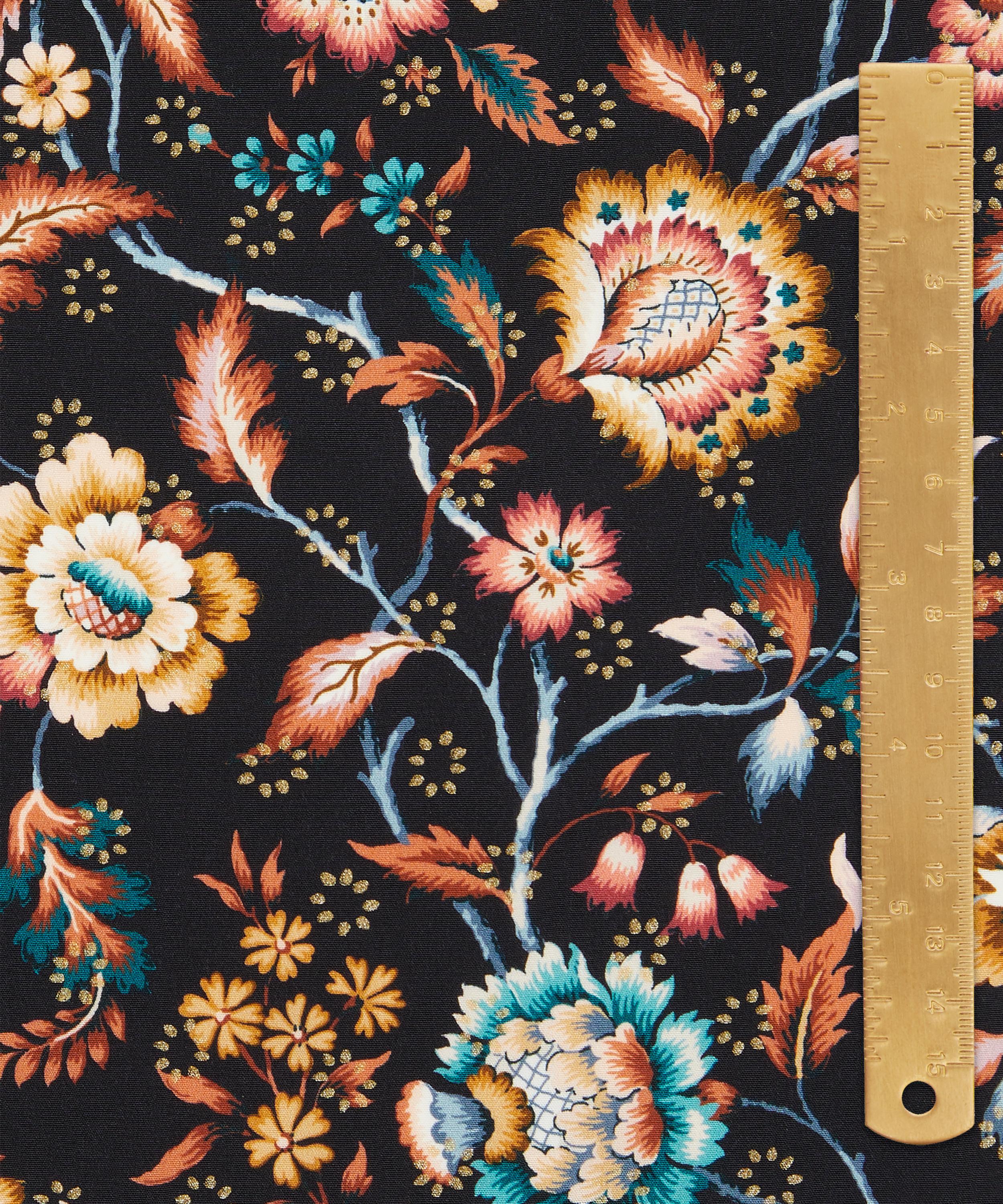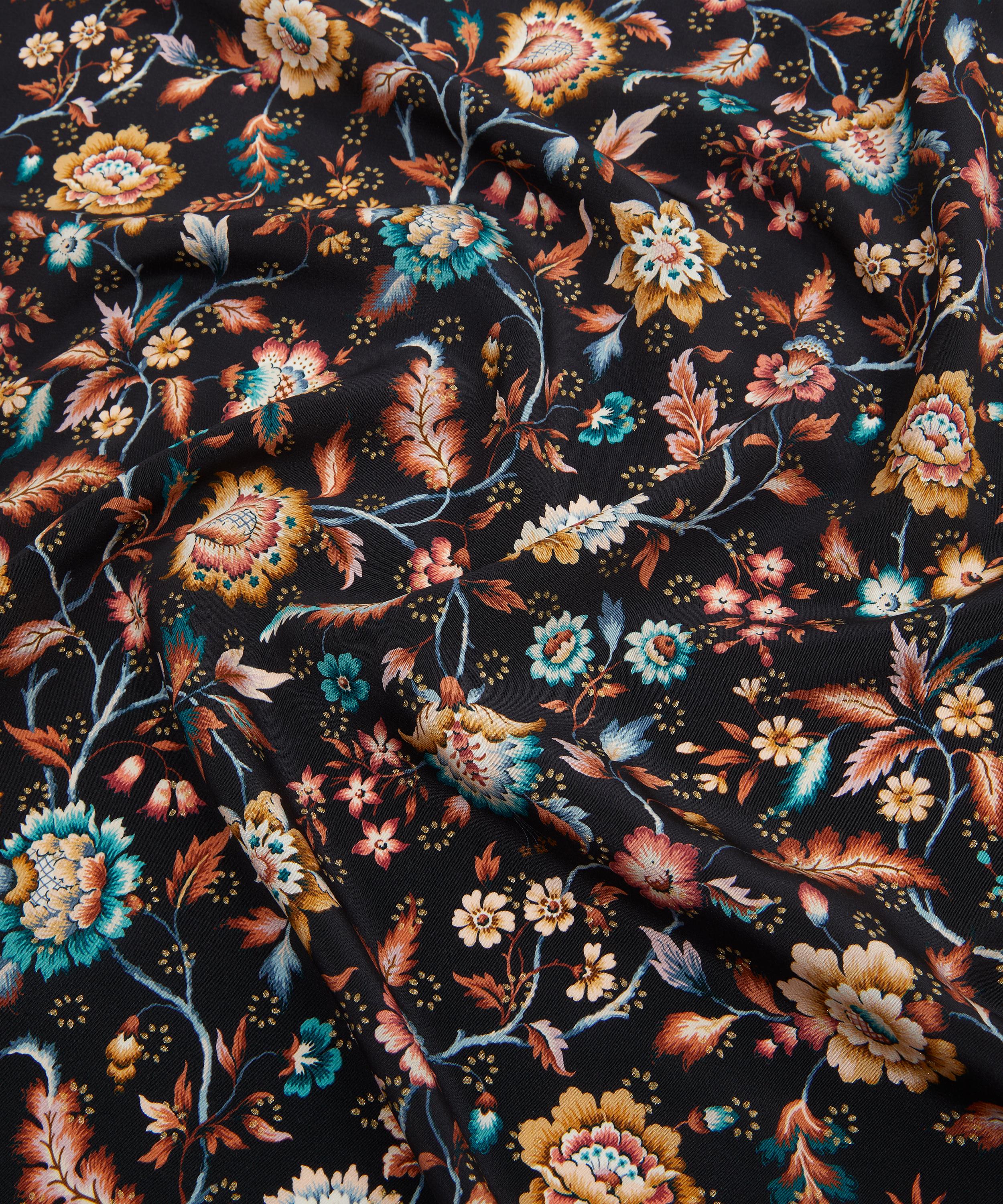 Eva Belle Metallic is inspired by a design from the Liberty archive, originally created between the 1910s and 1930s in Jacobean needlework style. A Tree of Life arrangement, it features stylised florals with winding leaves, intricately shaded petals in soft jewel-tone colourways, and subtle bursts of metallic colour.