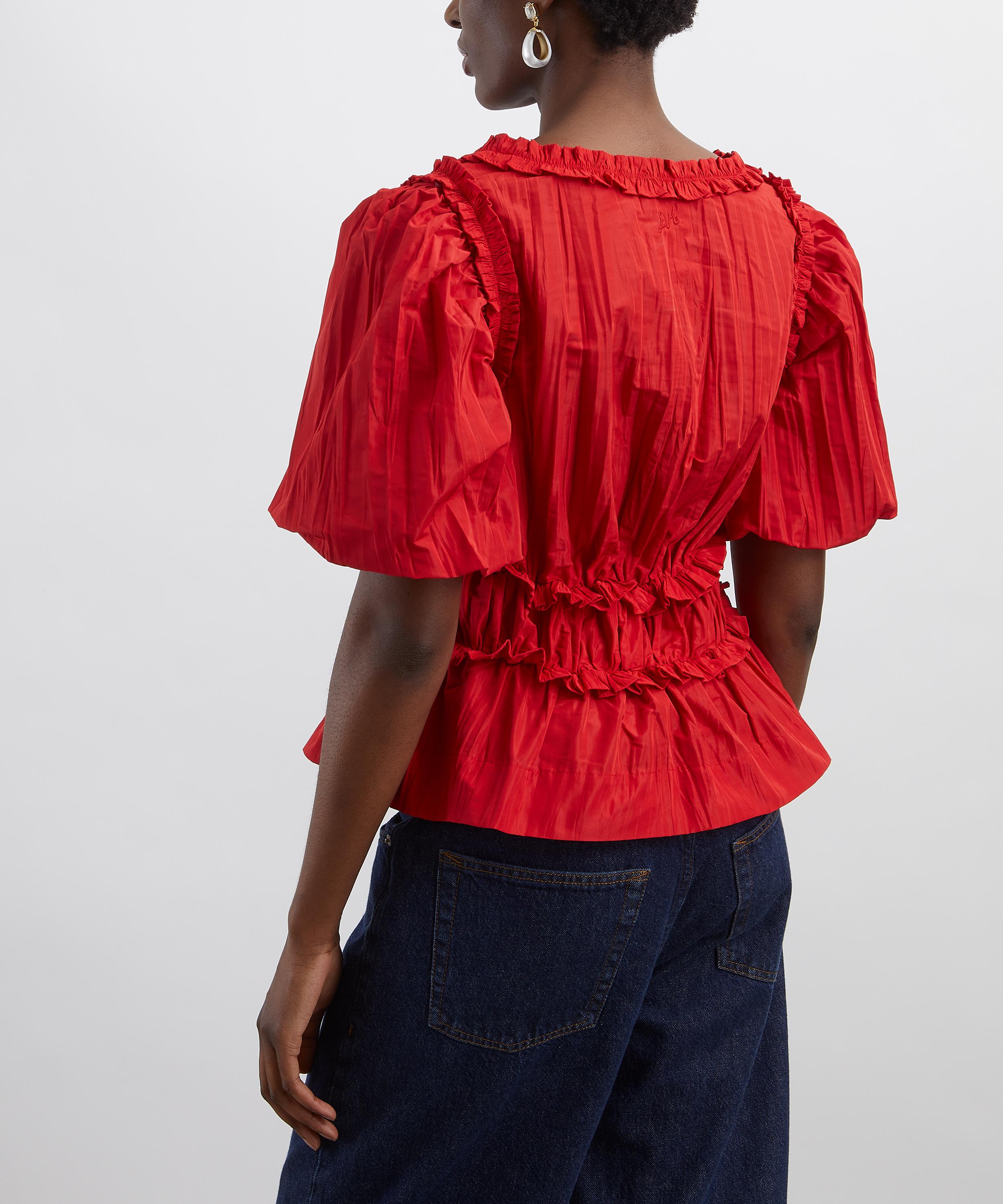 Crafted from lustrous red taffeta, this adaptable blouse showcases a two-in-one silhouette with removable puff sleeves. A graceful scoop neckline and refined ruffle detailing at the waist cascade into a flared peplum hem.