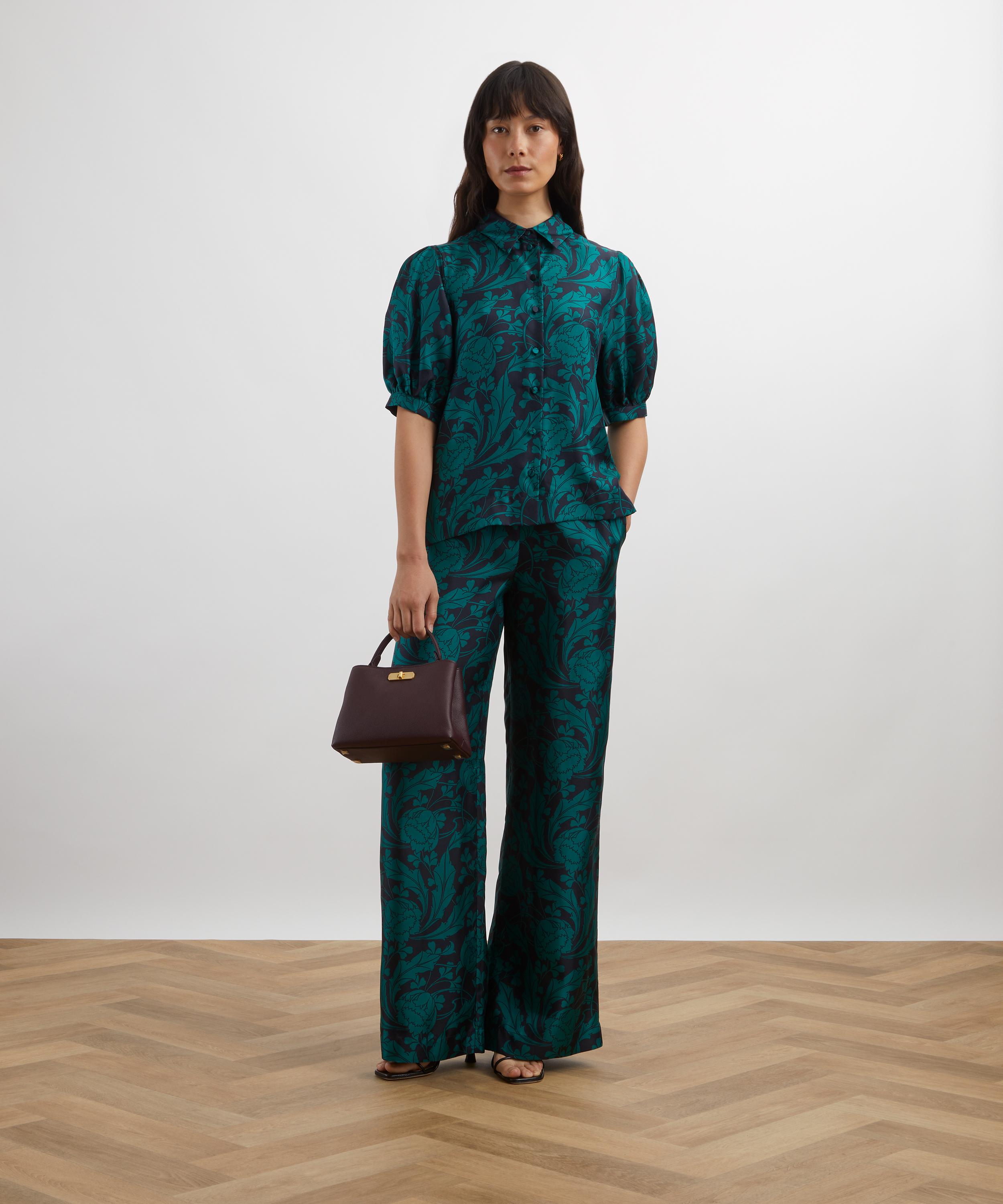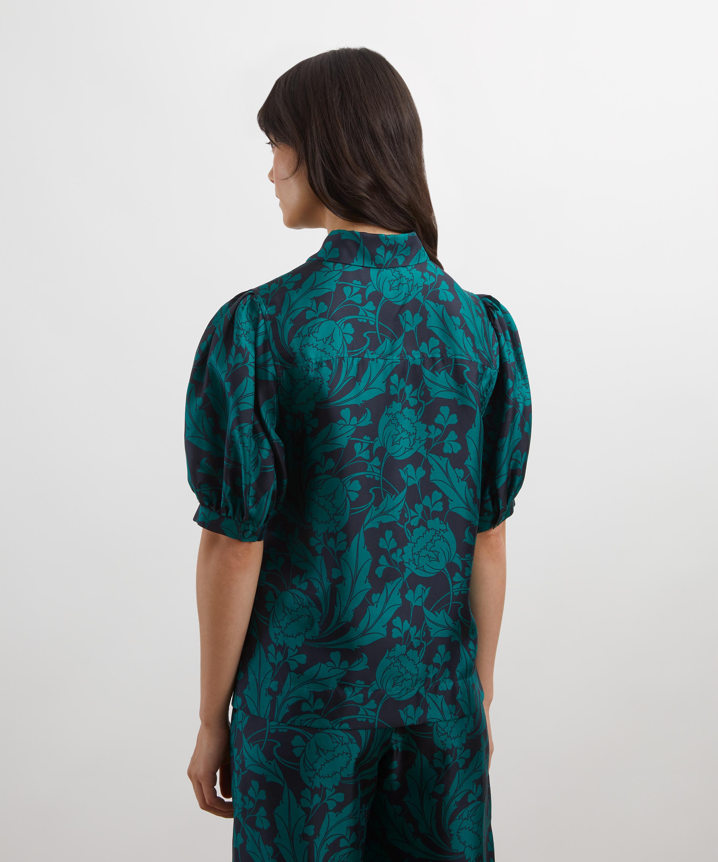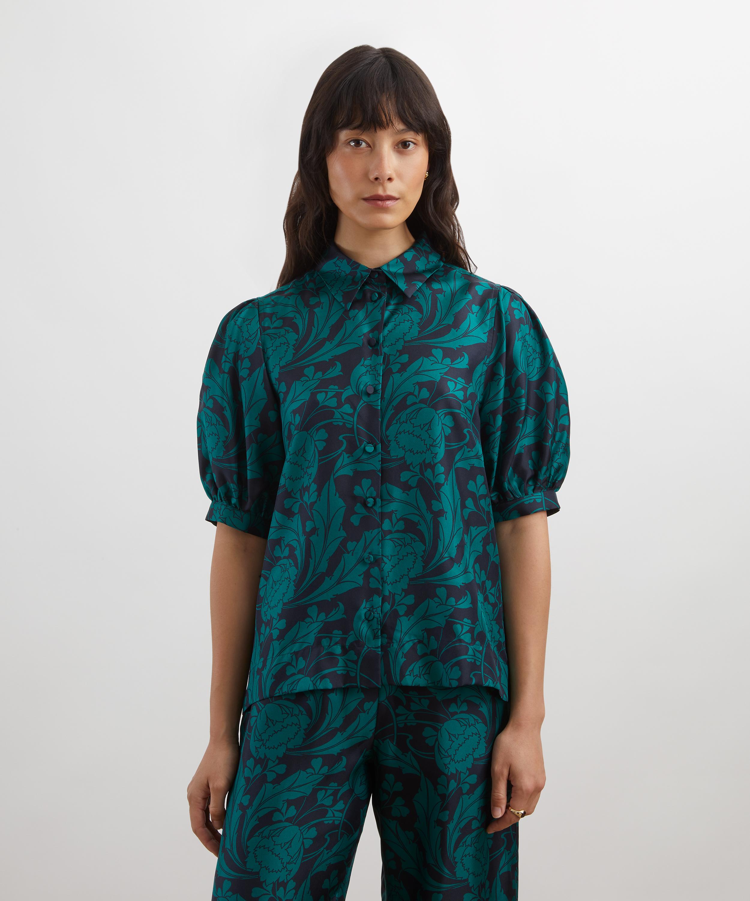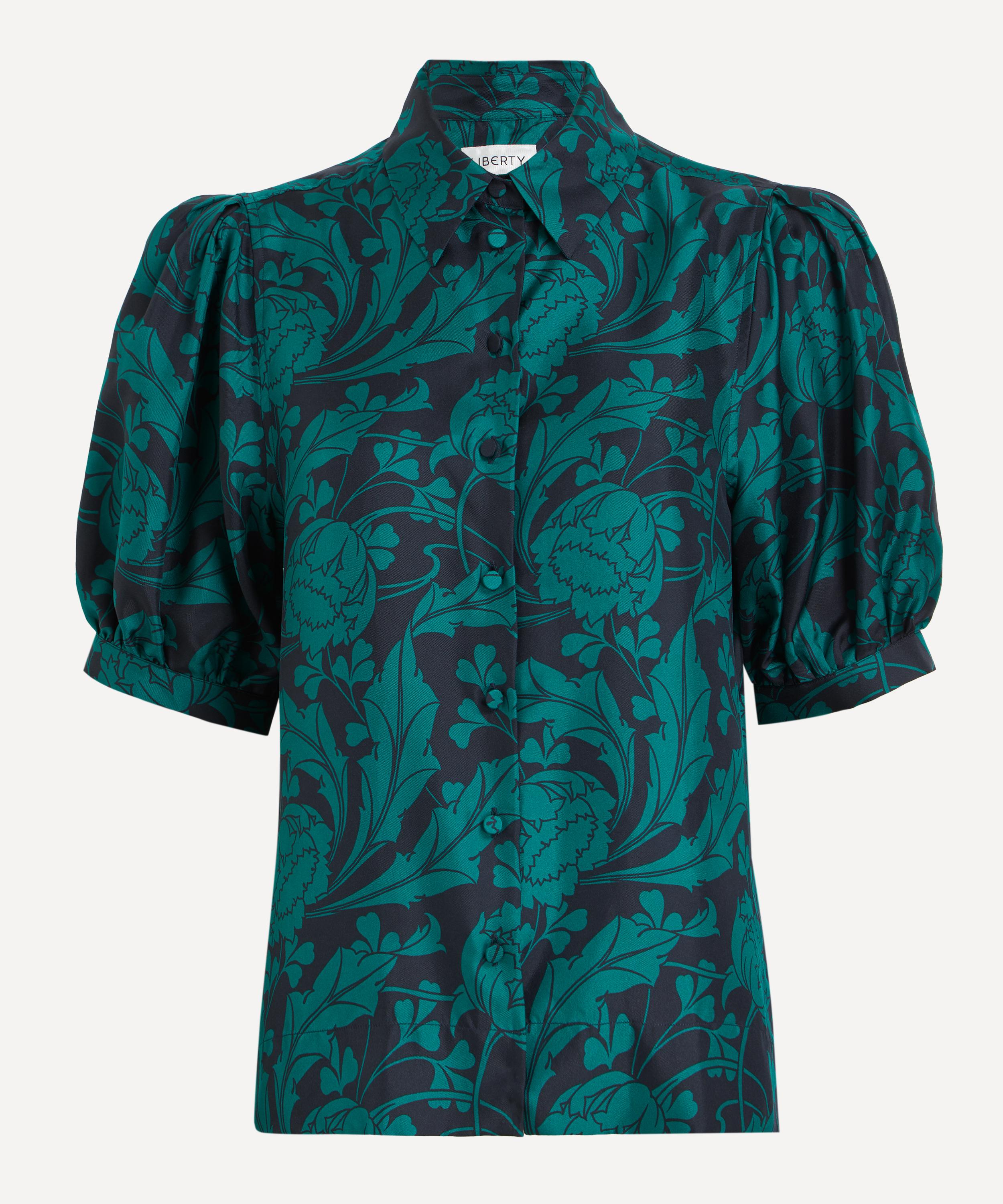 Crafted from silk twill, this shirt is brought to life with our Ezra Venus print. Ezra Venus was inspired by an unfinished Art Nouveau artwork discovered in the Liberty archive. Meticulously retraced into a trailing repeat, its striking tulips sweep into whiplash curves before blossoming into scrolling, leafy vines. Fashioning an ultramodern aesthetic, the bold linework and monochrome silhouettes accentuate the design’s fluidity and dynamic movement.
