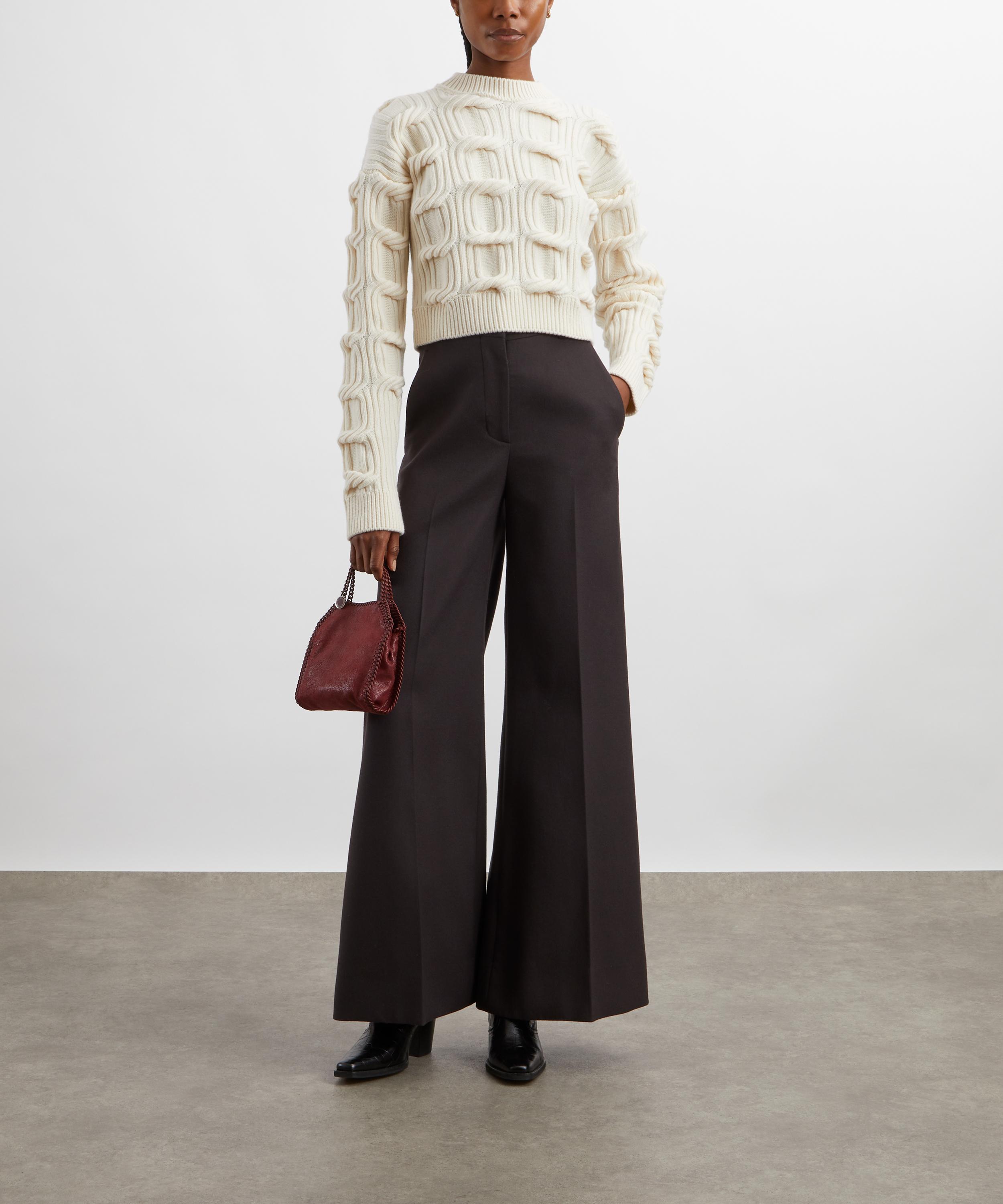 Knitted from luxurious virgin wool, this sculptural jumper features a striking cable-knit design inspired by Stella McCartney’s iconic Falabella chain. Finished with a classic crew neck and ribbed trims, the waist-length hem effortlessly complements high-waisted skirts or jeans for versatile styling.