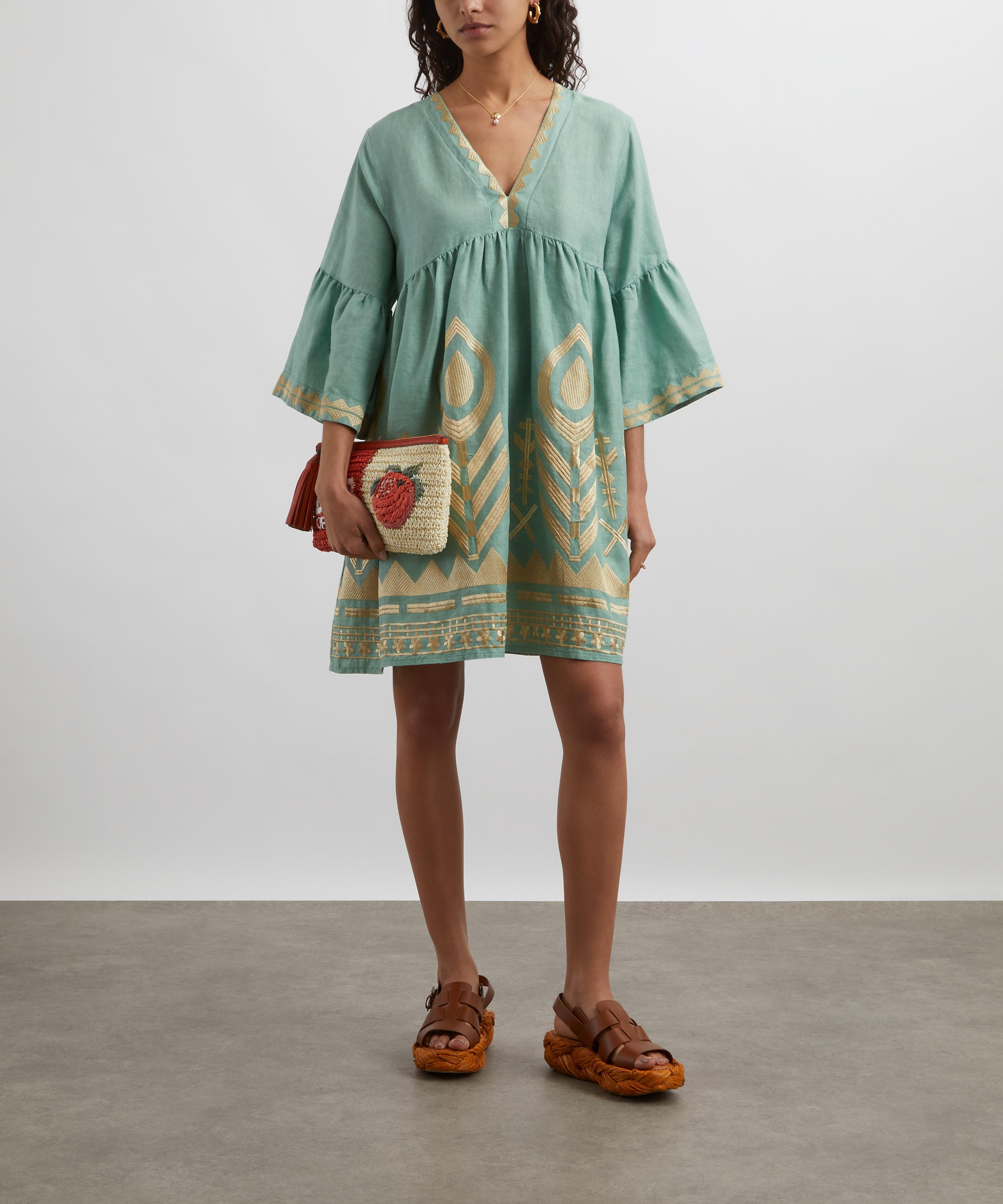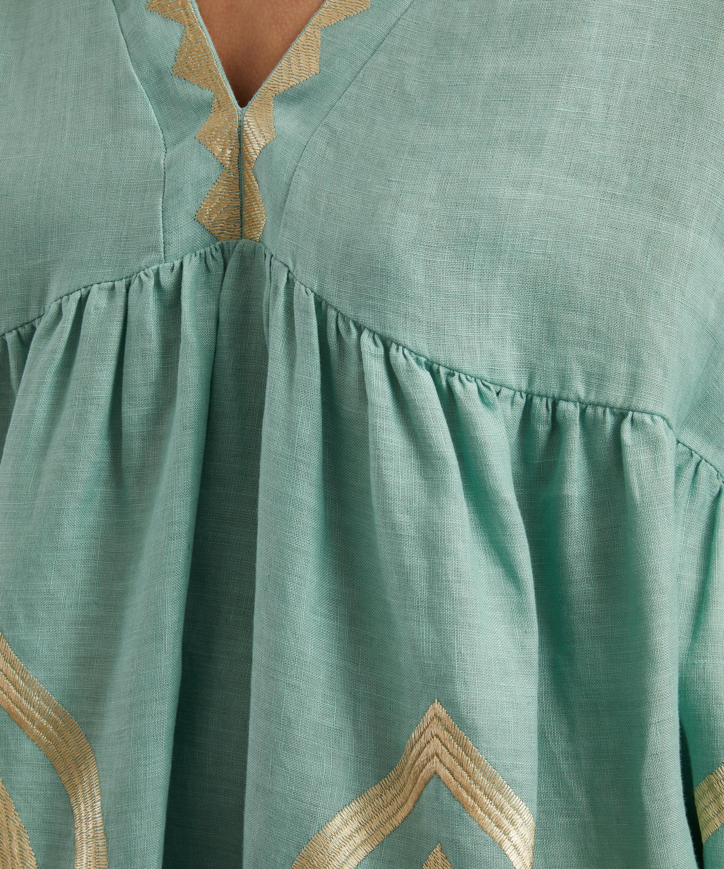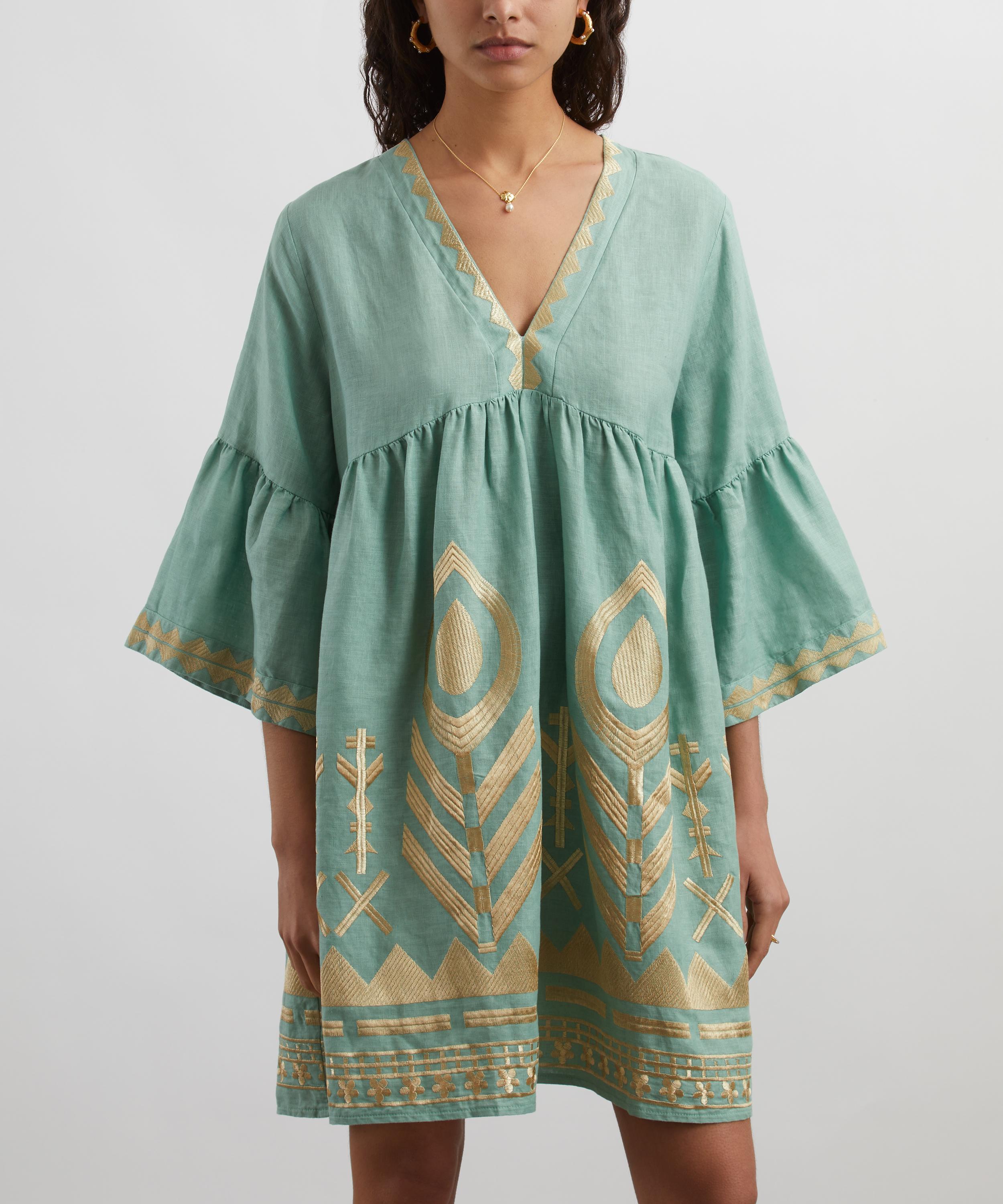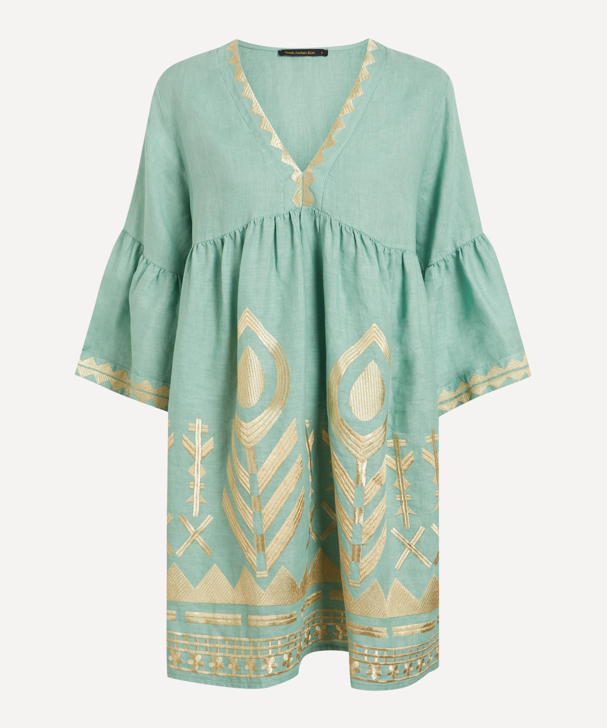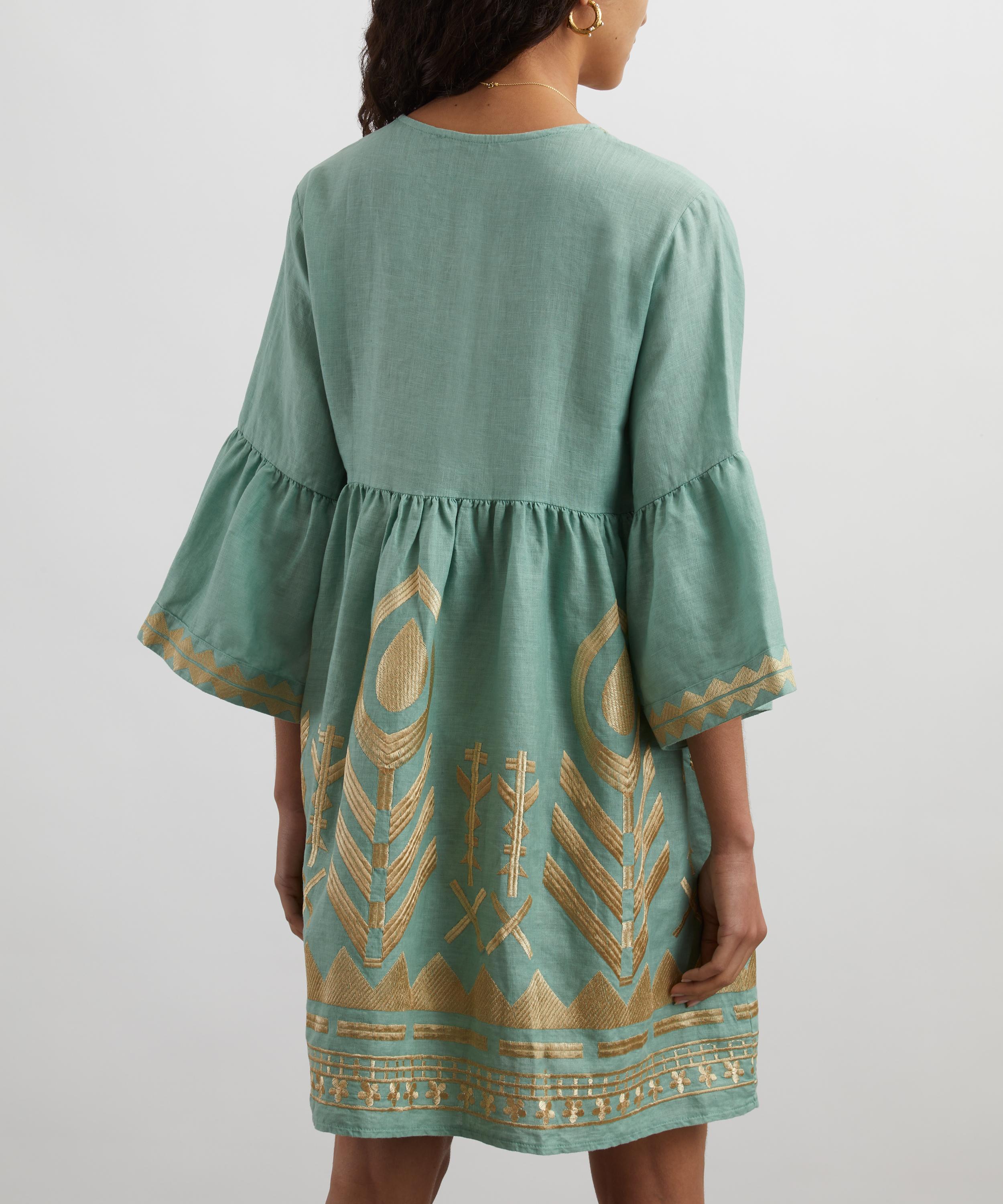 Lightweight and airy, this breezy linen mini dress radiates effortless elegance with its V-neckline, gathered empire waist, flowing bell sleeves, and shimmering gold feather embroidery throughout.