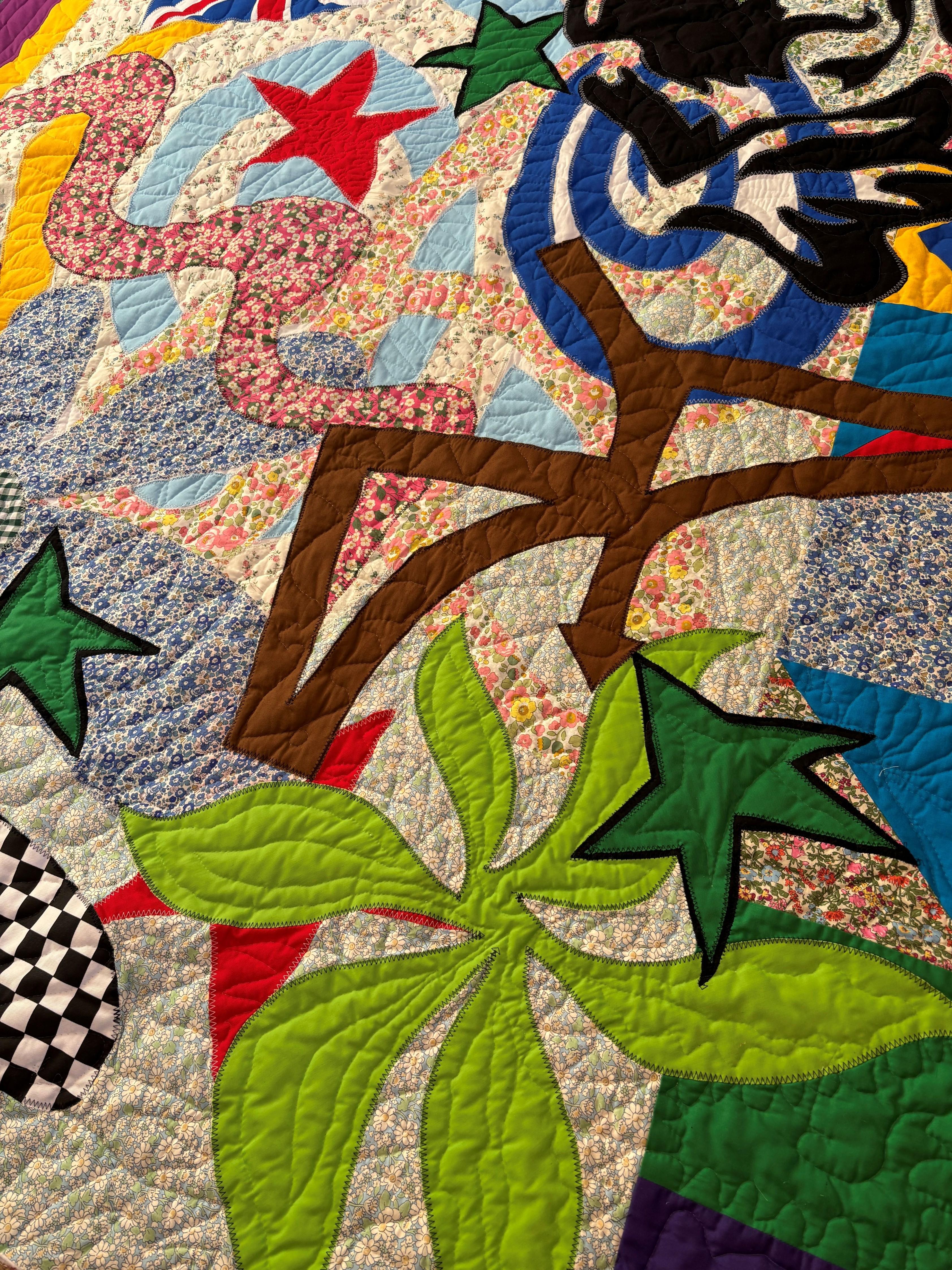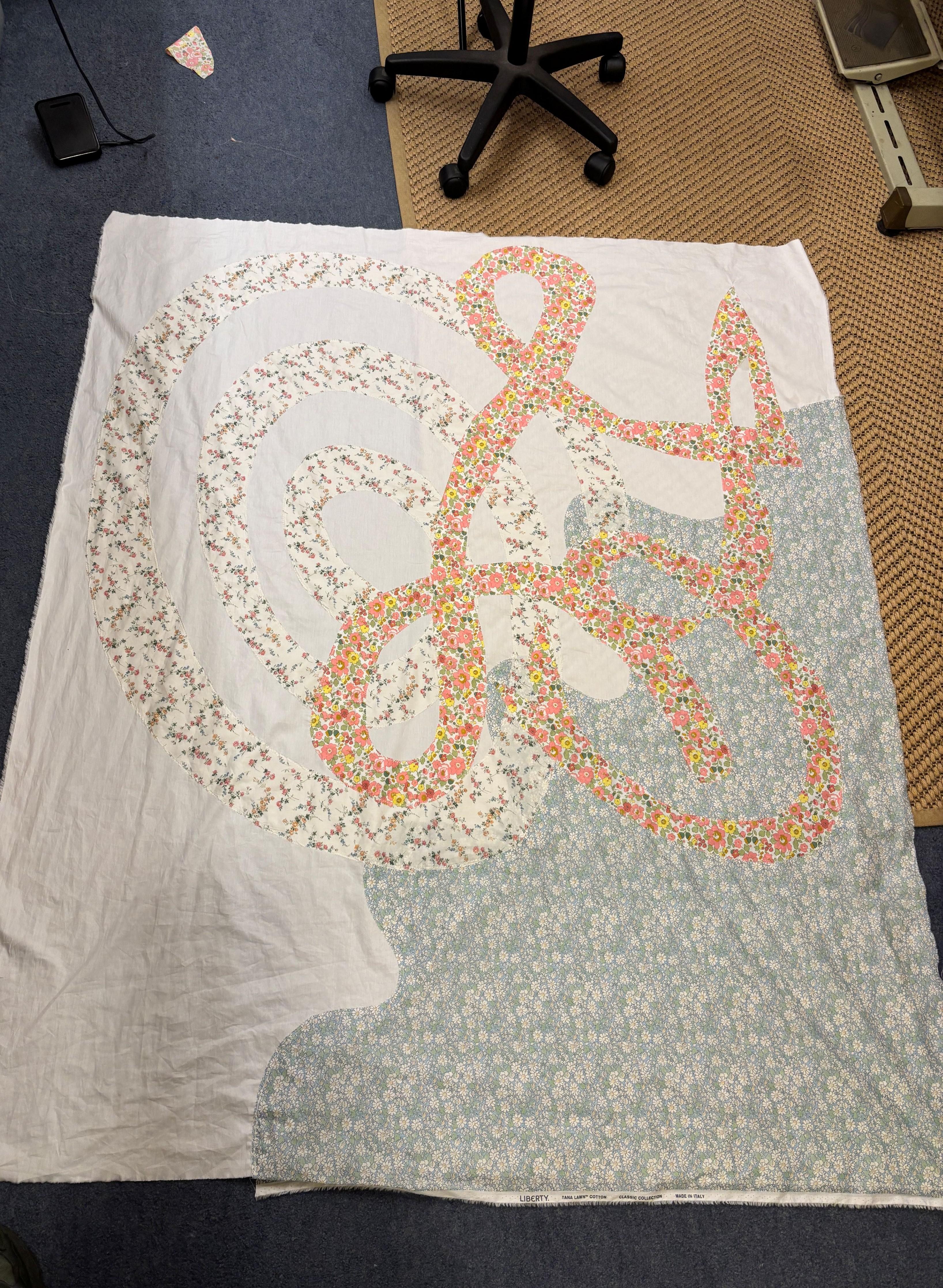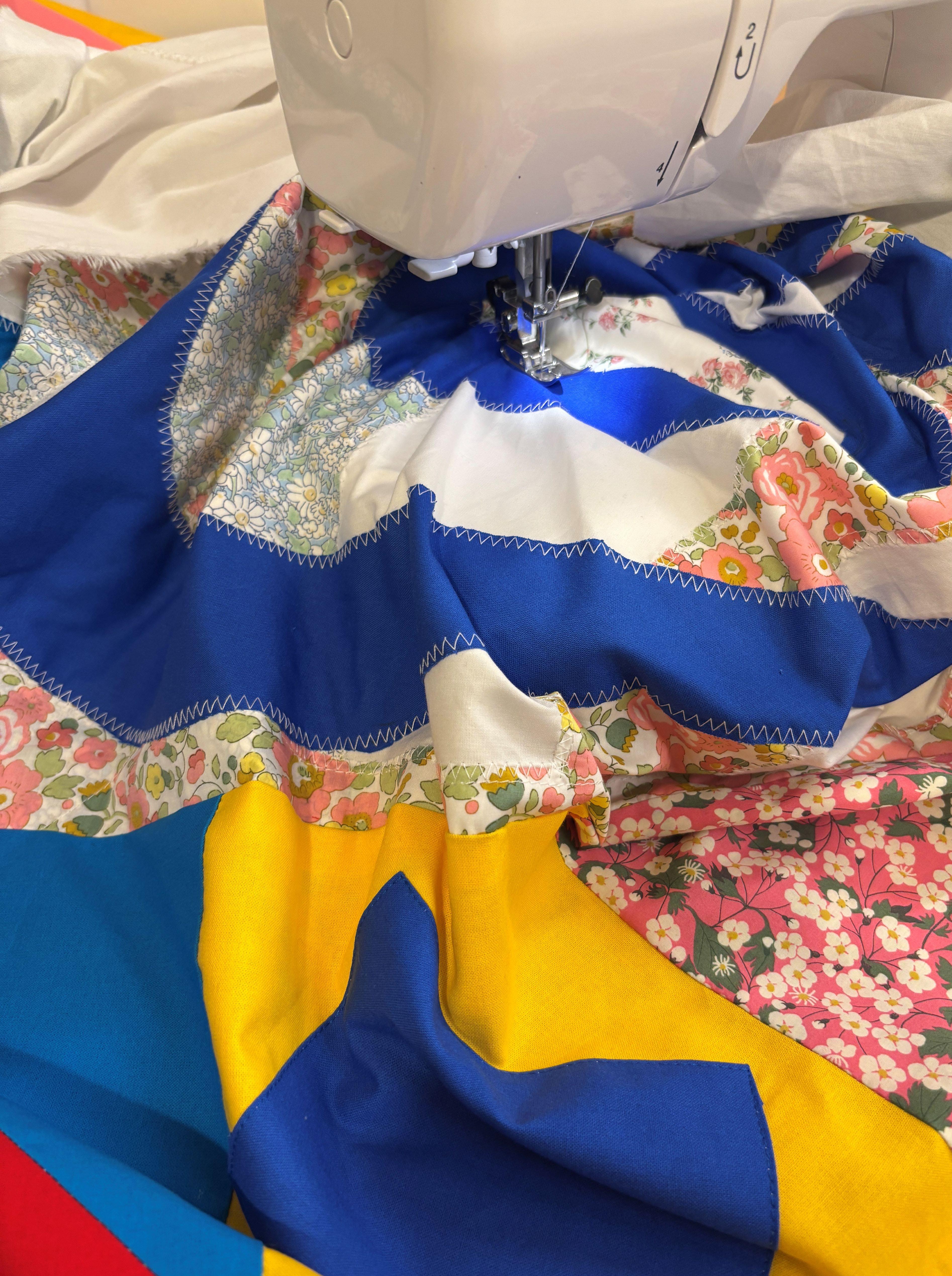 Once a significant portion of the white base layer is covered, stitch a row of patchwork squares along one side of the quilt. This adds a classic quilting element to contrast with the free-flowing appliqué shapes.