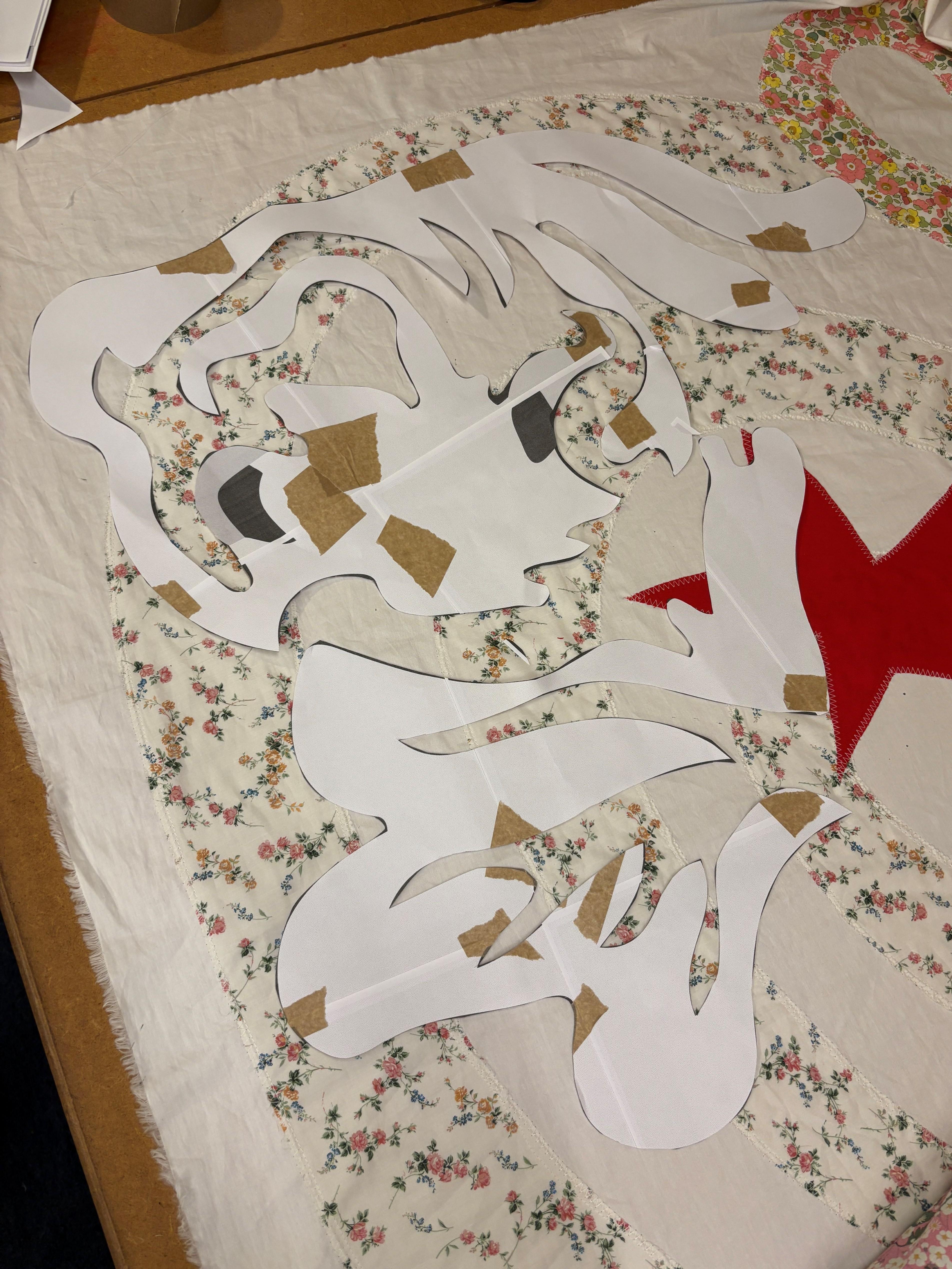 • Use a white chalk pencil to trace the template onto black fabric, cut out the shape, apply spray glue, and carefully attach it to the quilt. Stitch it in place.