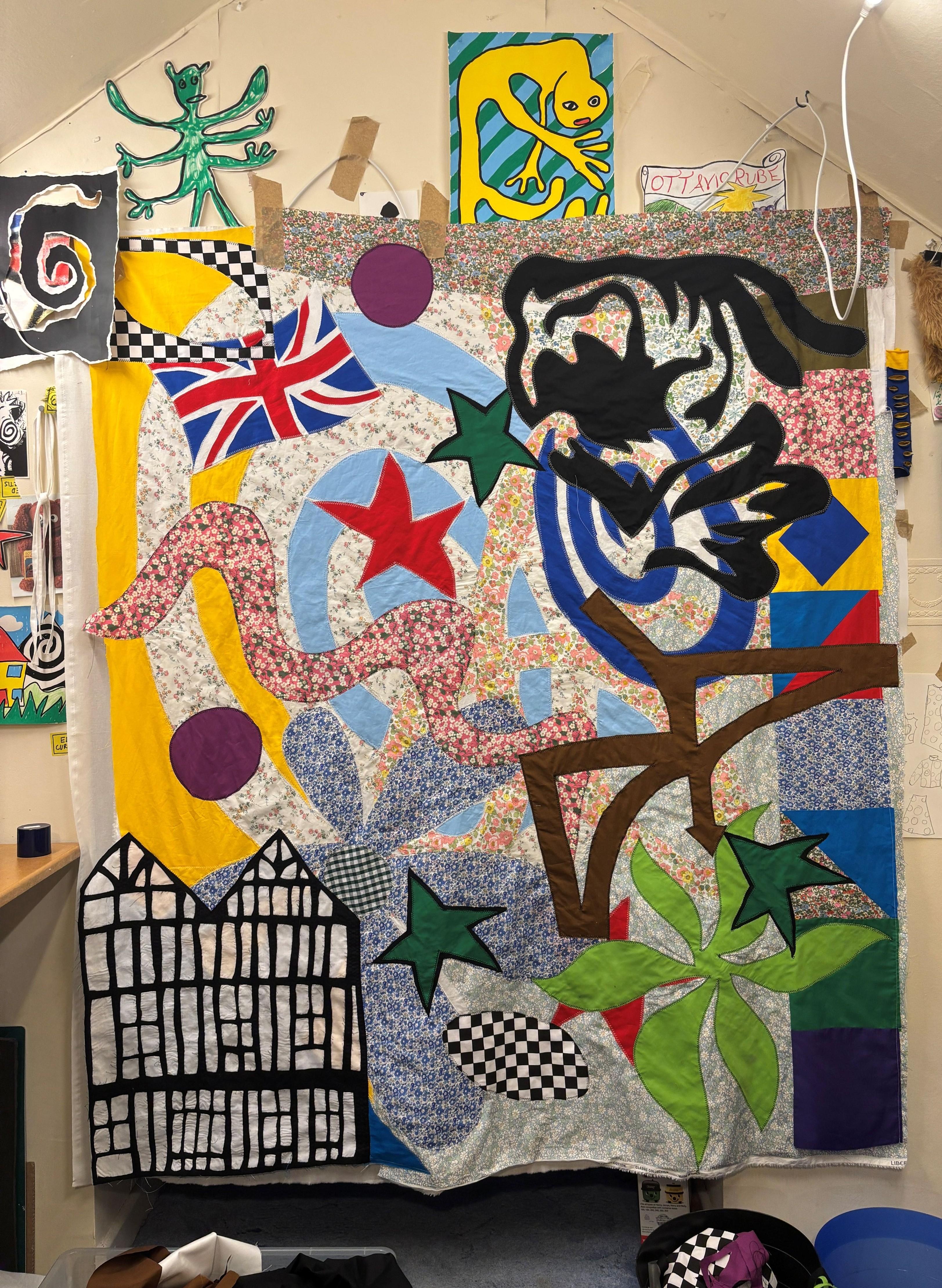 Continue layering and stitching shapes until the white gaps are filled and the overall composition feels balanced.