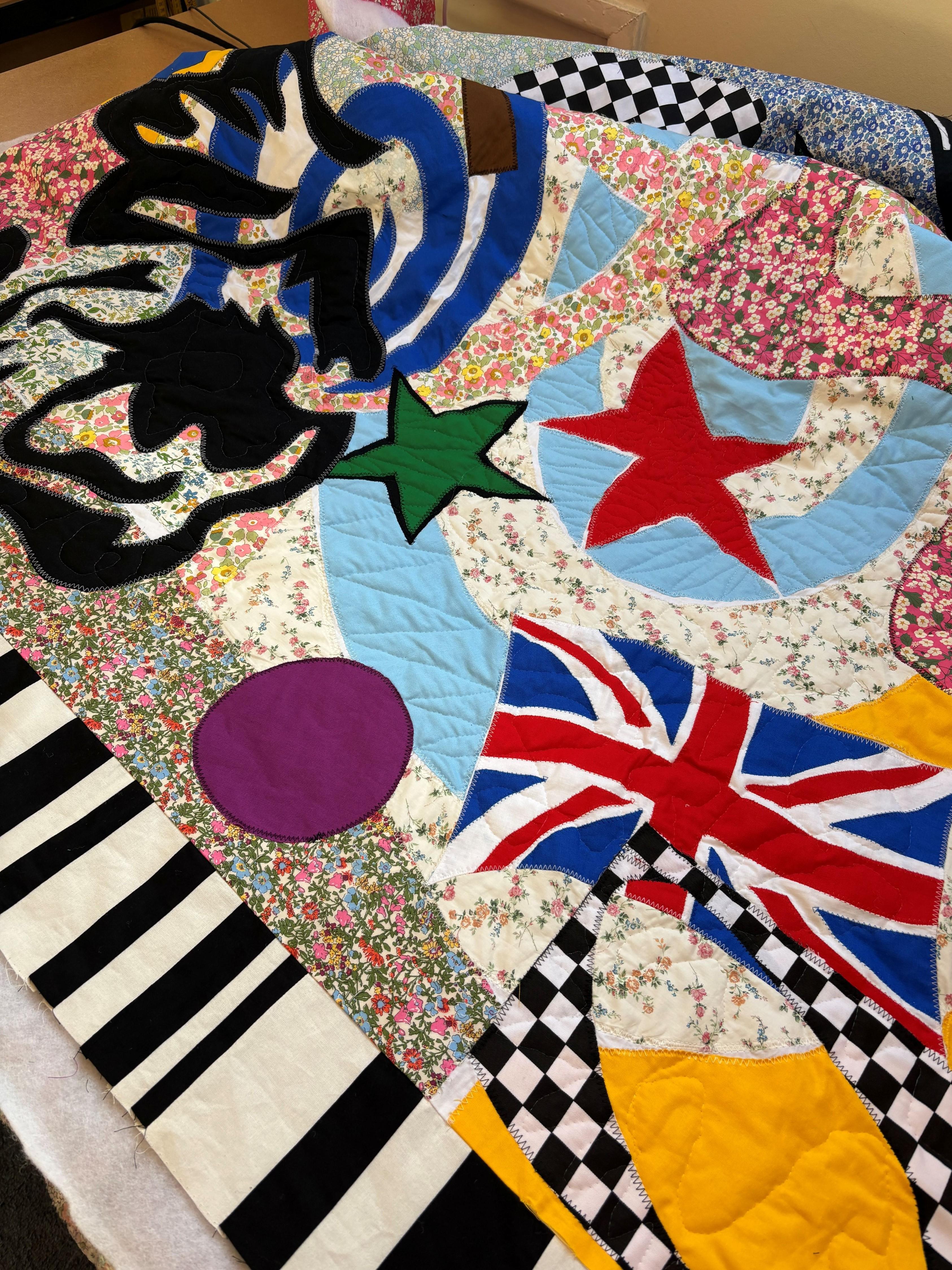 Overlay star and spiral shapes using an appliqué spray glue, then stitch them down.