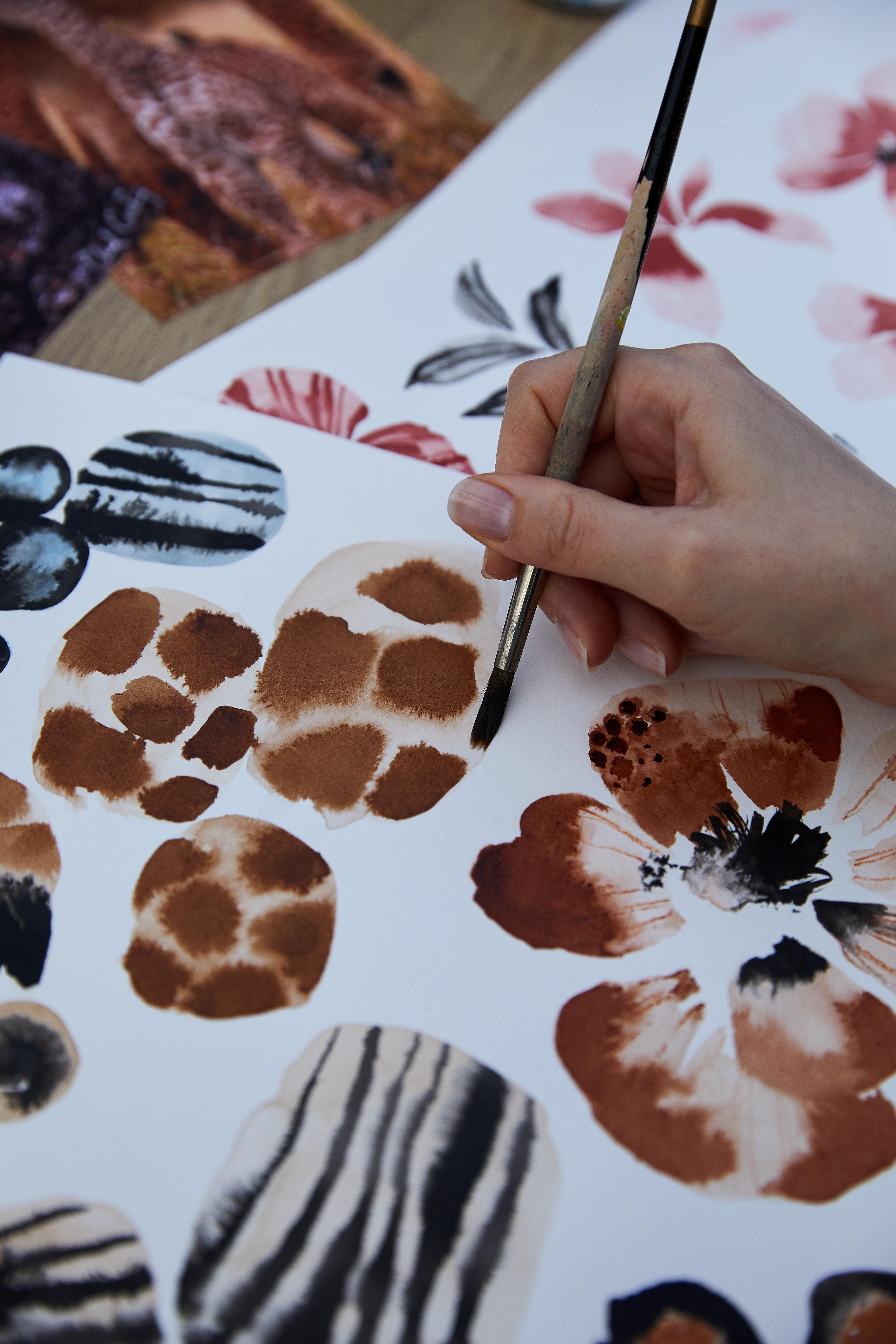 Traditionally, the design team embark on seasonal research trips around the country to gather inspiration for new seasonal collections, with past influences including Eltham Palace, Brighton Pavilion and Kew Gardens. Designers will draw out each individual artwork by hand in the studio, working with a wide variety of materials ranging from pencils and water colours to gouache, crayons and collaged paper to create a diverse yet cohesive collection of prints that tells a powerful story. The hand-drawn artworks are translated into digital repeats using advanced software, allowing the studio to create multiple colourways and differently-sized scale interpretations of their prints.
