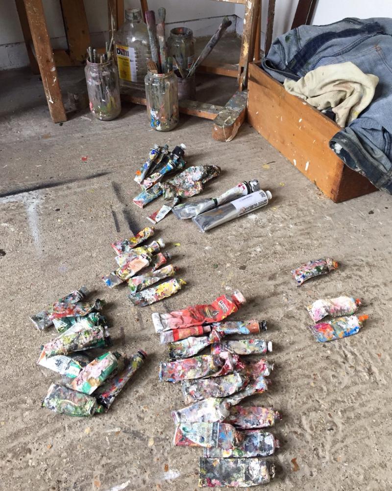 I mainly use oil paint, and I have recently been using spray paint; this creates an interesting tension on the surface between the soft powdery spray paint next to the built up, hard, impasto oil.
