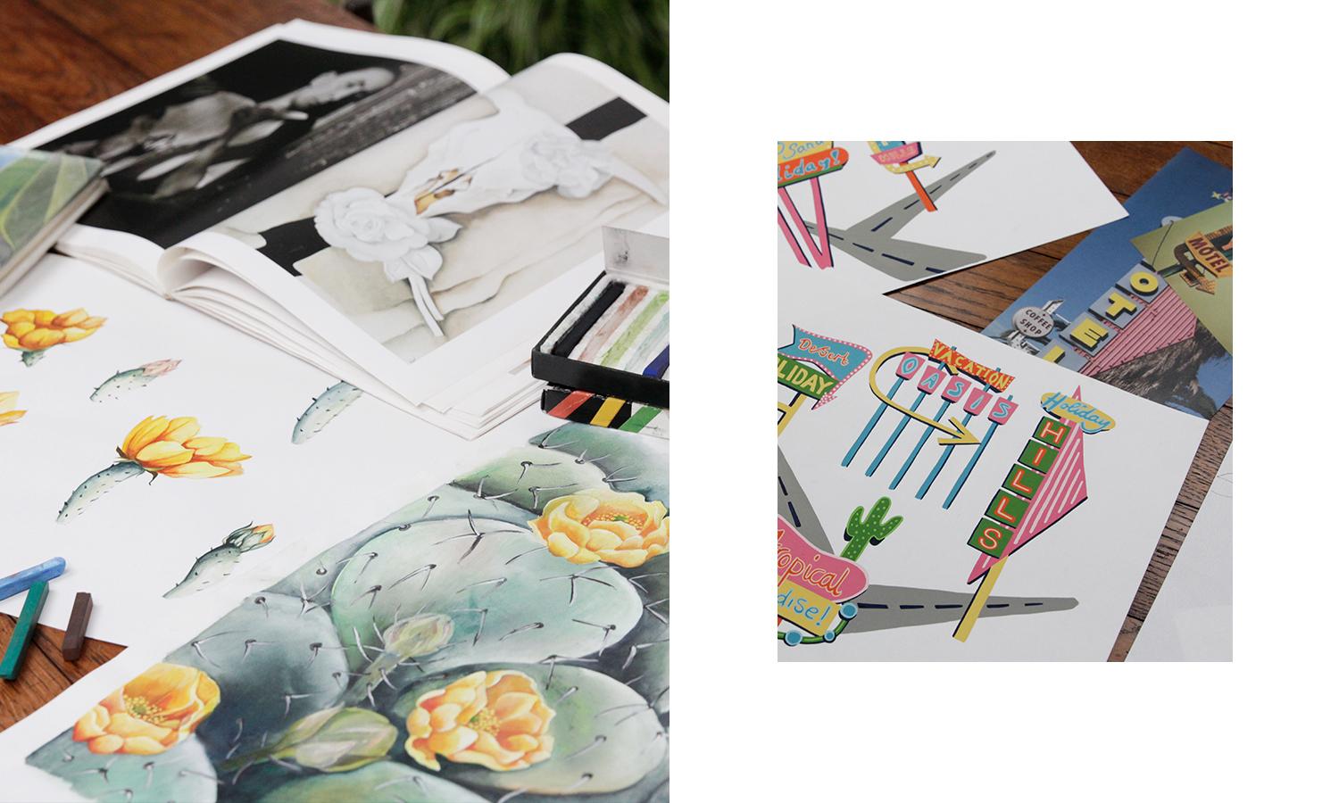 Conversational prints of neon motel adverts and road signs sit alongside photo-real artworks of prickly pear and flowering cacti, all capturing a sense of shimmering heat and adventurous possibility.