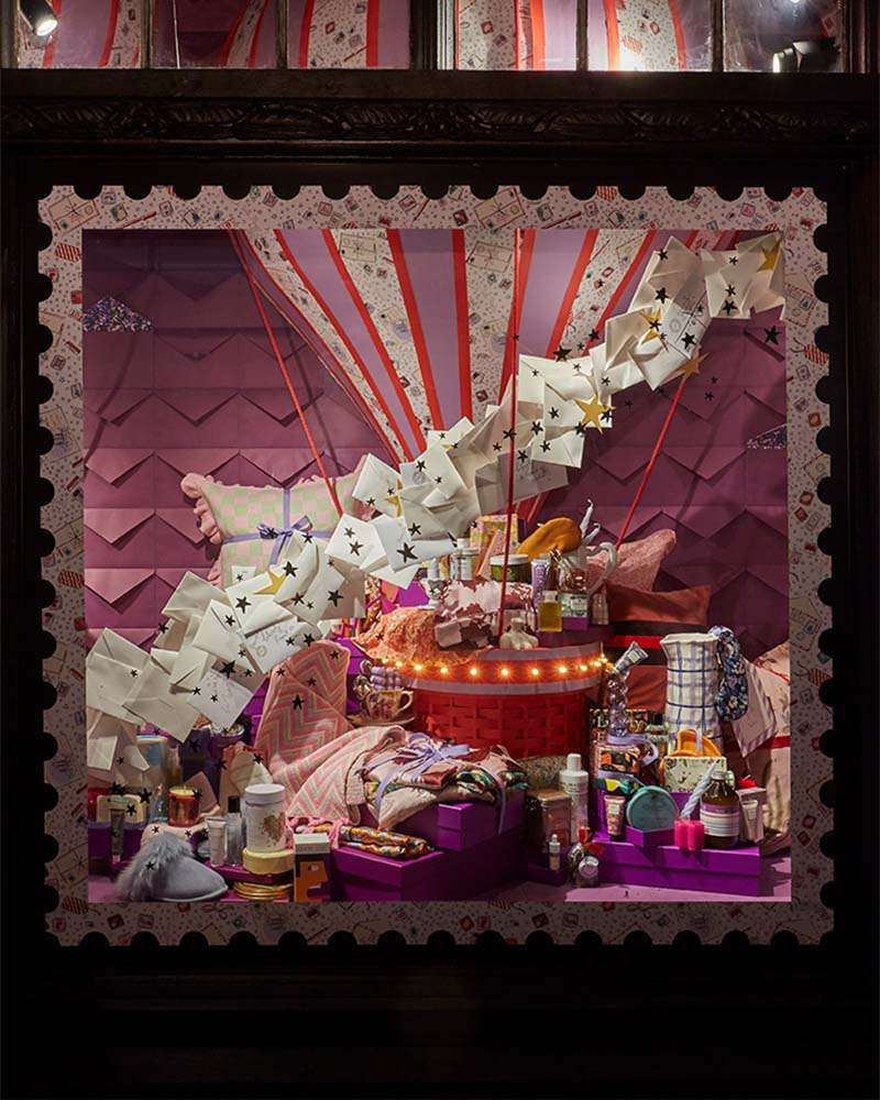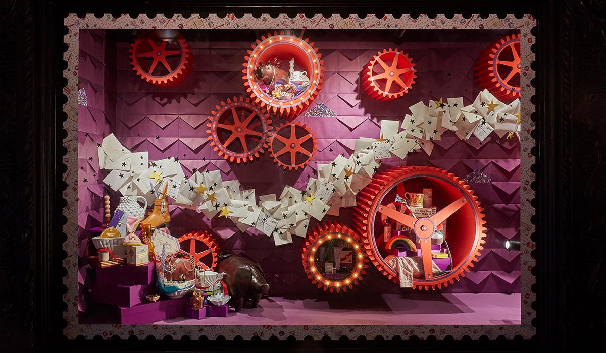 This Christmas centres on sending joy to friends and family - choosing a gift with love and stamping it with magic. In the windows, this is translated as a display of bespoke letters, swirling around whimsical hot air balloons and cogs stuffed with presents. The plastic-free, hand-made build is an ode to the Royal Mail of yesteryear, looking back to a simpler time before Next Day Delivery. Here, Lead Creative Hannah Perse-Cottle shares the story behind the nostalgic display.