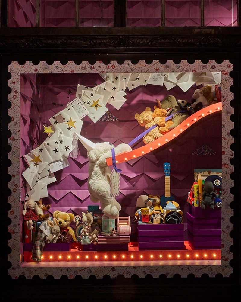 “Looking on to Regent Street, our journey begins with a magical post box that whisks the letters through the air and on their merry voyage. The campaign was heavily inspired by old photos of the Royal Mail depos; this is where our slides laden with gifts came from - although the windows are stationary we wanted to create the idea of movement everywhere.”