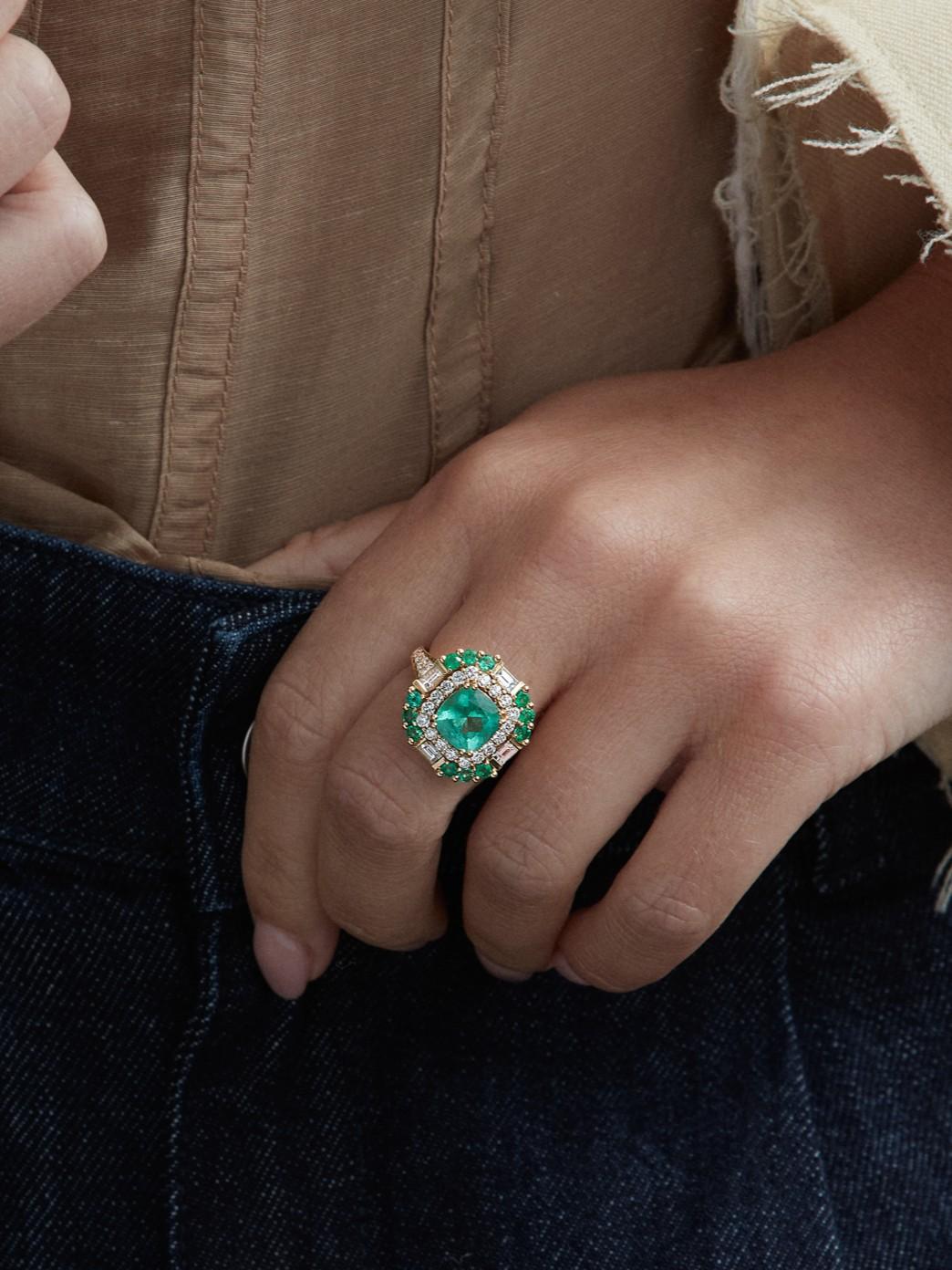 "Our Emerald Carmen Ring is the queen of all our ring designs, a true symphony of gemstones. Emeralds and natural diamonds come together in perfect harmony, set in radiant 18k gold. Each stone is hand-cut, featuring chamfered baguette diamonds and emeralds alongside a myriad of complementary cuts that make this a real show-stopper. The craftsmanship is exceptional, every detail considered to achieve balance and brilliance. It’s an incredible showcase of emeralds and diamonds, their colours working together beautifully to create a truly special piece. The emeralds, sourced from both Brazil and Zambia, have been carefully colour-matched to ensure perfect cohesion and depth.