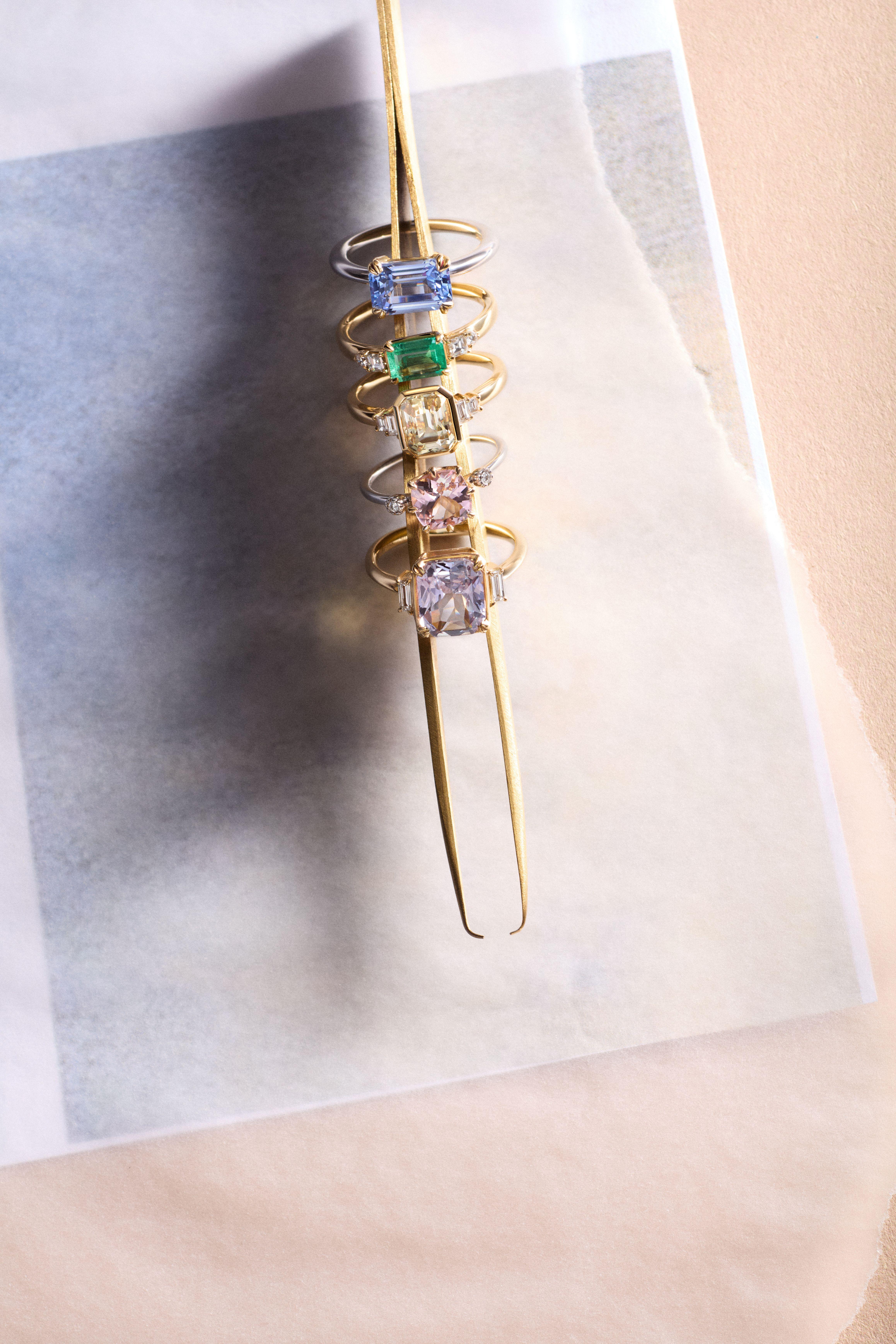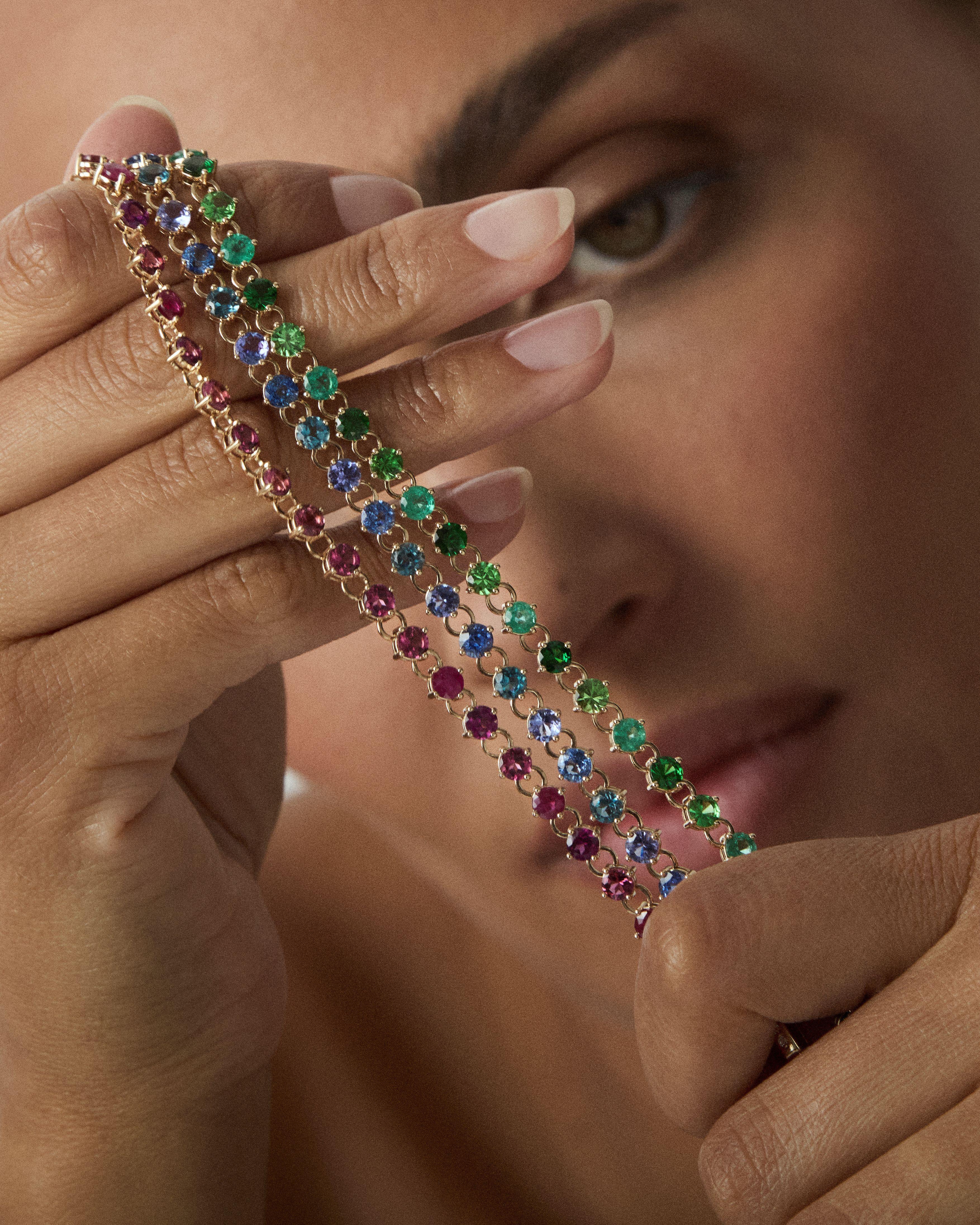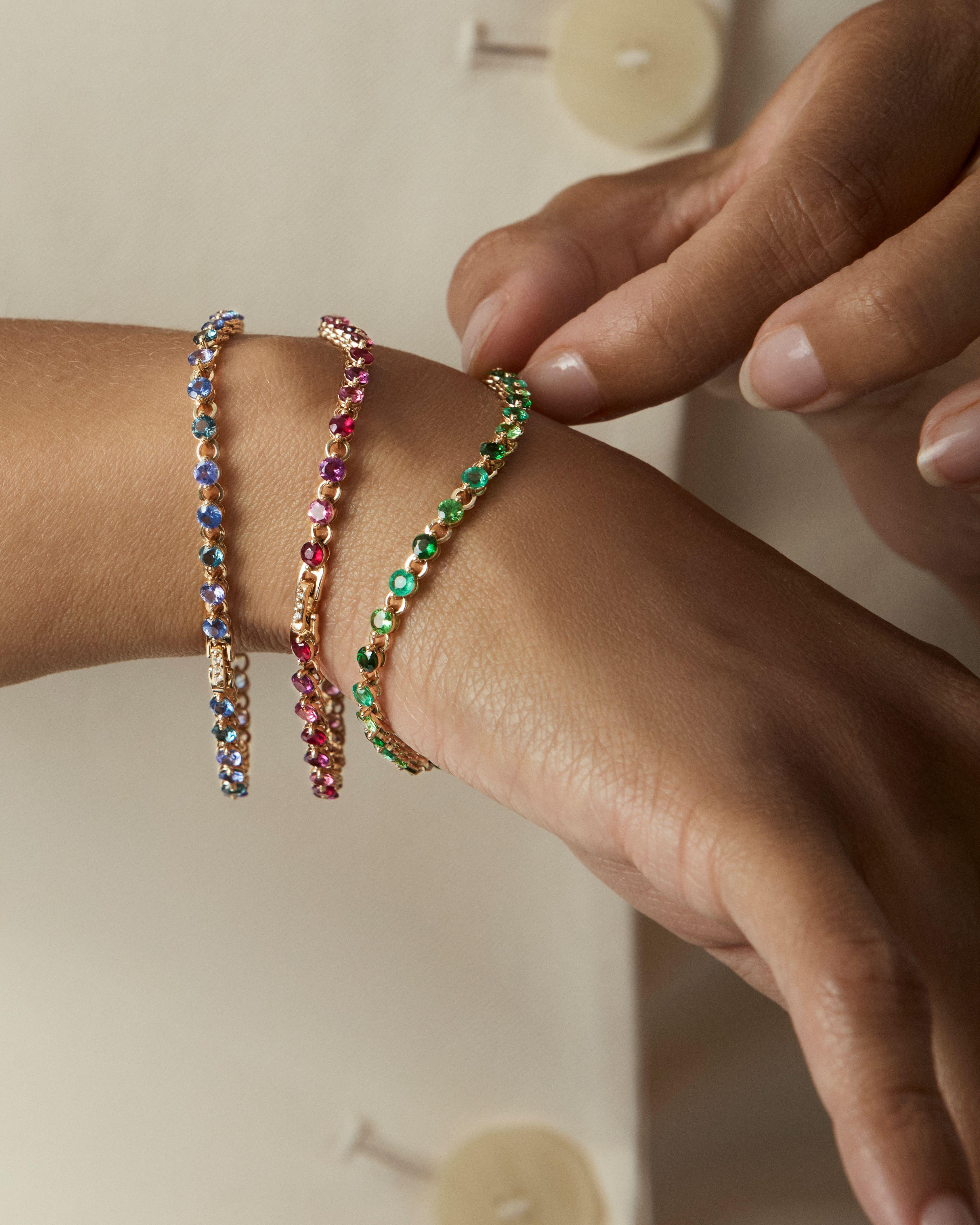 "For our green precious gemstone tennis bracelet, we carefully selected three harmonious shades of green, each chosen to complement the others without any one stone overpowering the design. We used emerald for its rich luminosity, a vibrant deep-green tsavorite (a variety of green garnet) and a paler tsavorite to bring balance and lightness.