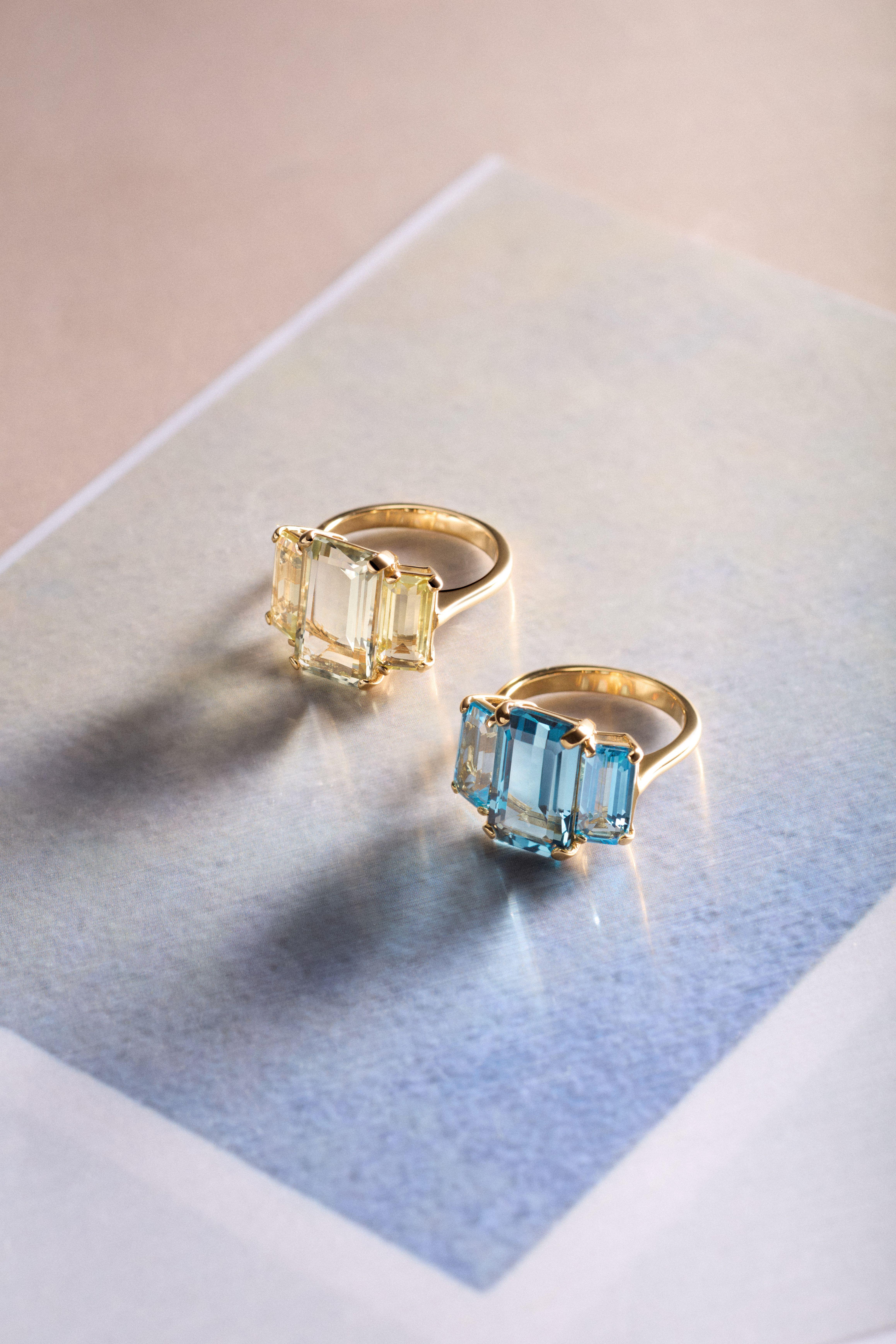 "Our Trinny ring, featuring London Blue and Swiss Blue topaz sourced from Africa, has become one of our absolute bestsellers. She is a bold, colourful cocktail ring featuring large baguette-cut stones, each one hand-cut exclusively for us.