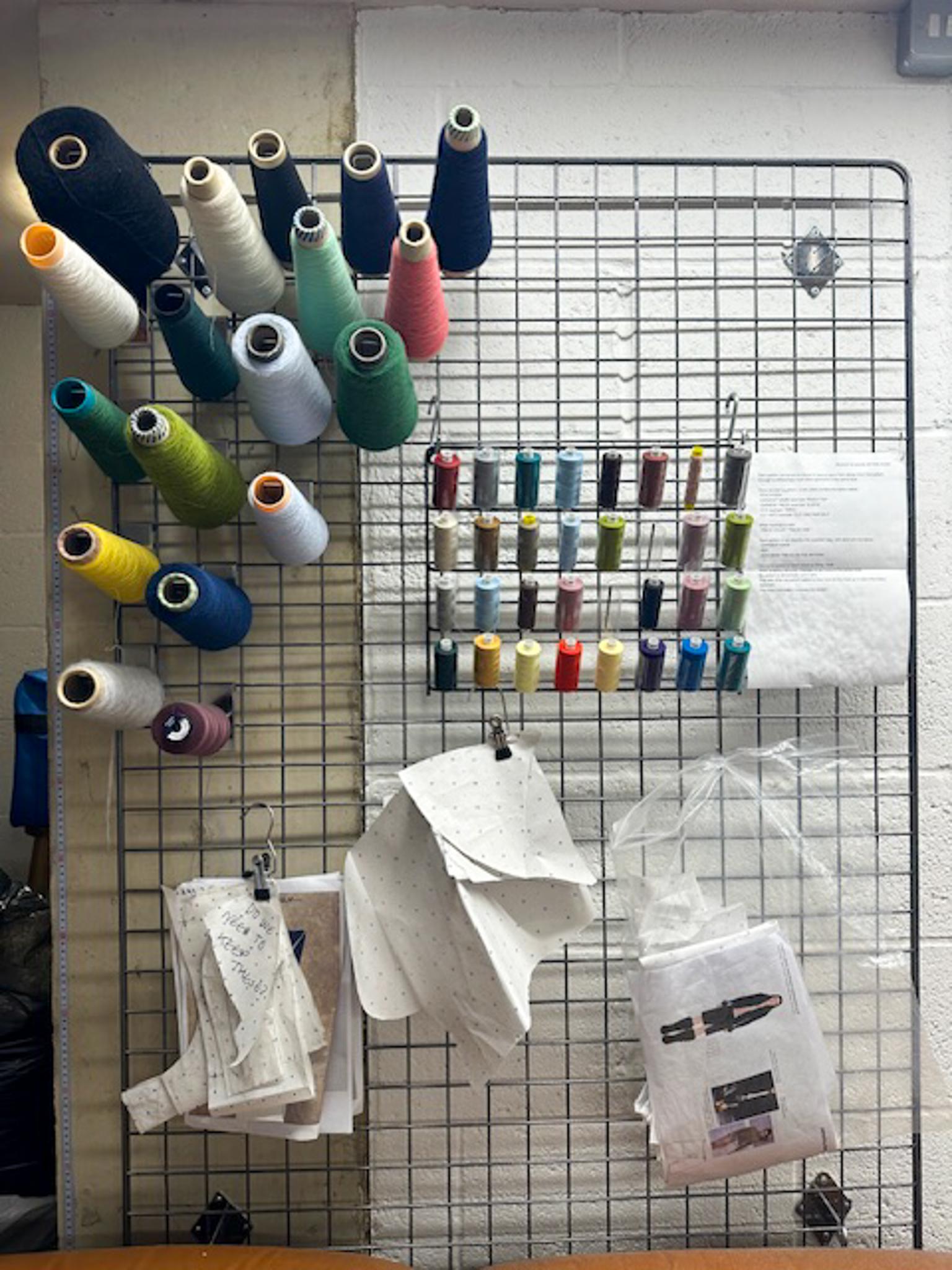 Threads on the wall of Peachy Den's in-house atelier