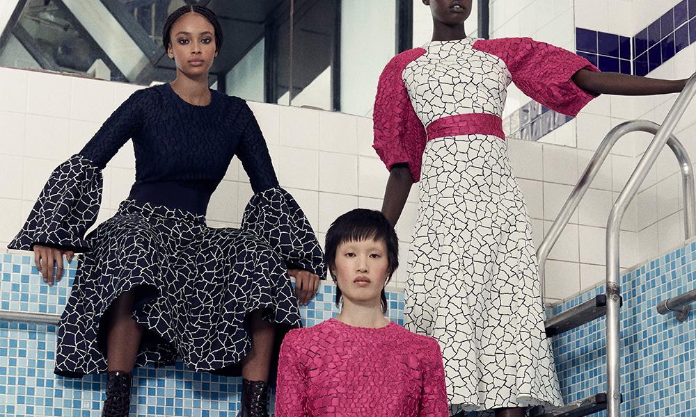 Teatum and Jones are also big on sustainability, developing their own eco-friendly fabrics and seeking out innovative ways to combat the problem of waste. “Many of the ways in which we have answered this has been through employing craft and artisanal techniques to push forward innovations in our textiles development,” Teatum says. “In 2016, we were the first ever British brand to win the International Woolmark Prize awarded for our innovations with merino wool lace. We then went on to be nominated for Eco Age’s Green Carpet Awards for our constant drive to innovate and develop textiles and processes that will be kinder to the planet and leave a better legacy.”