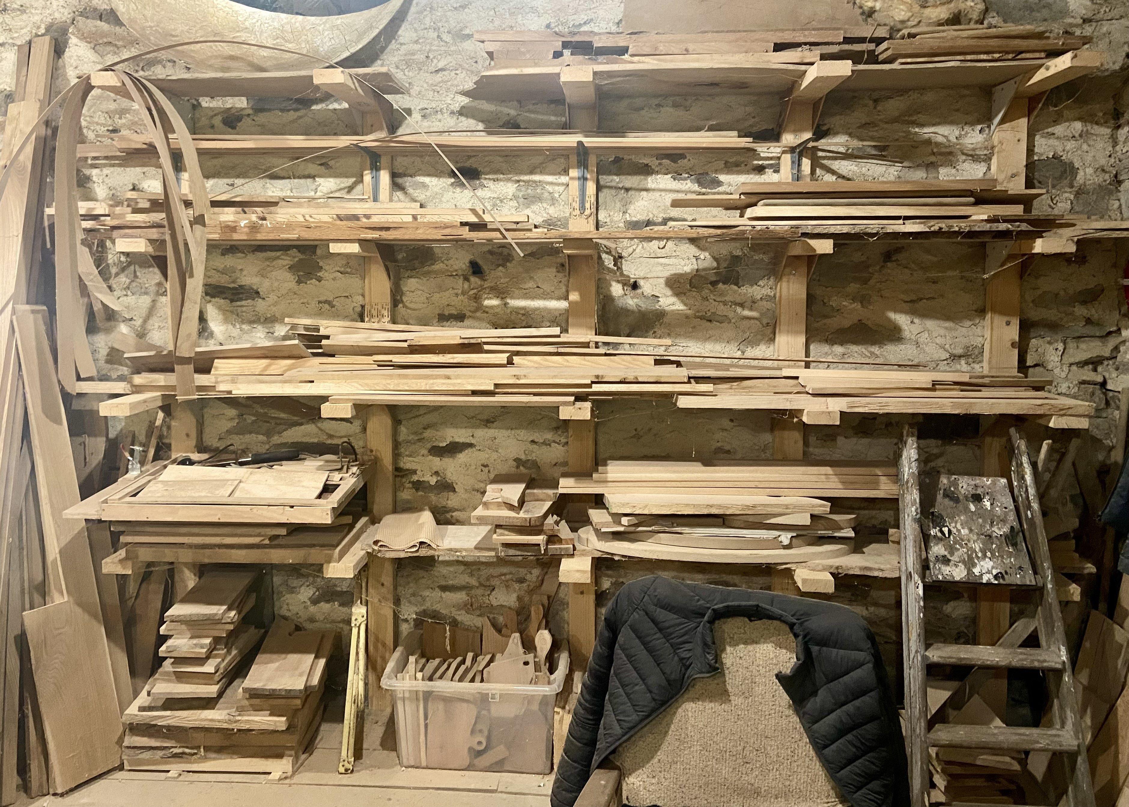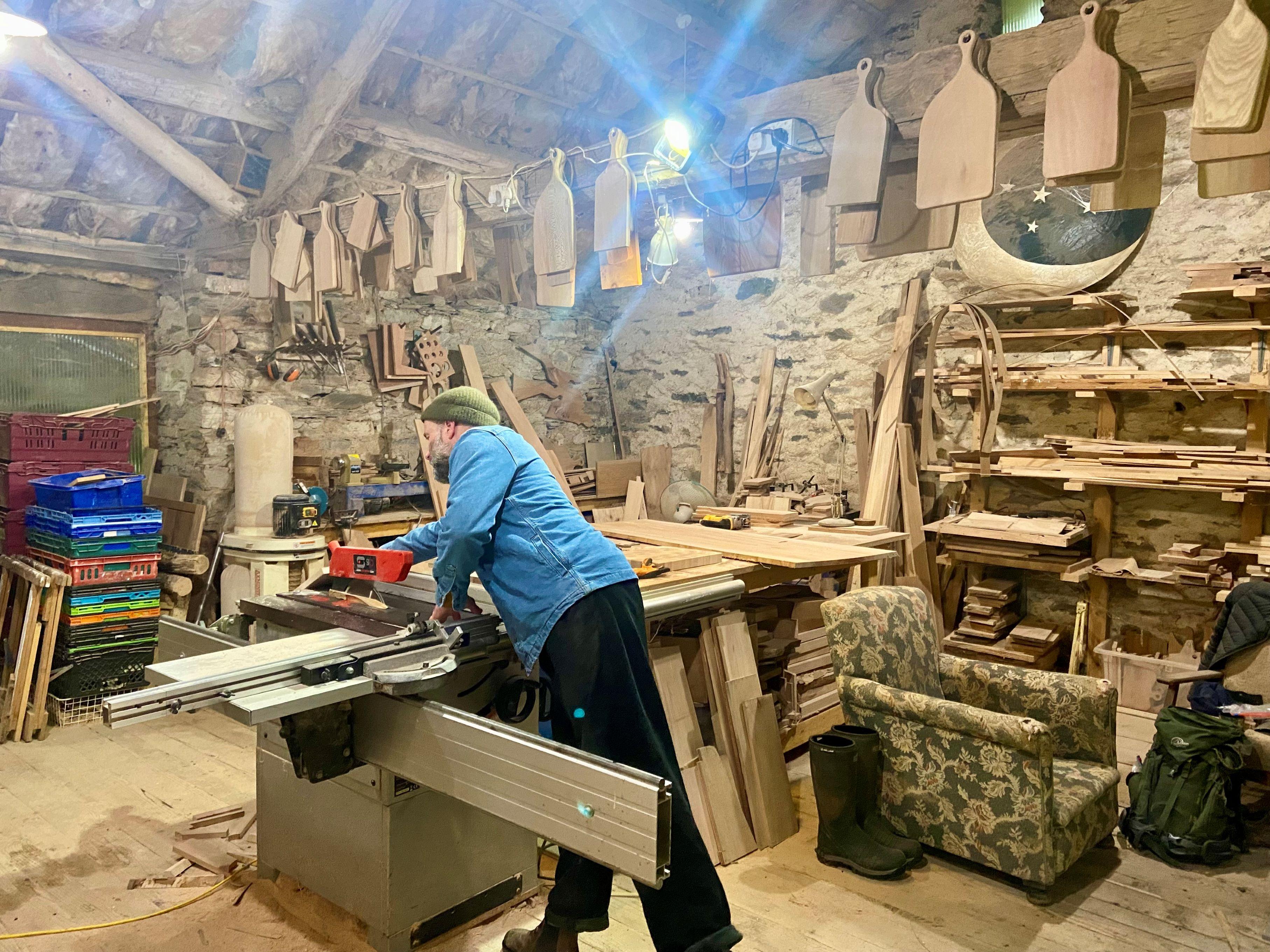 Over the machinery: saws, drills and sanders: a selection of the brand’s boards is hung proudly from an exposed beam. Yet to be cut timbers line the walls, pale golden cobwebs drip from the ceiling, encrusted in the inescapable fine sawdust and a woodburning stove crackles in the corner.