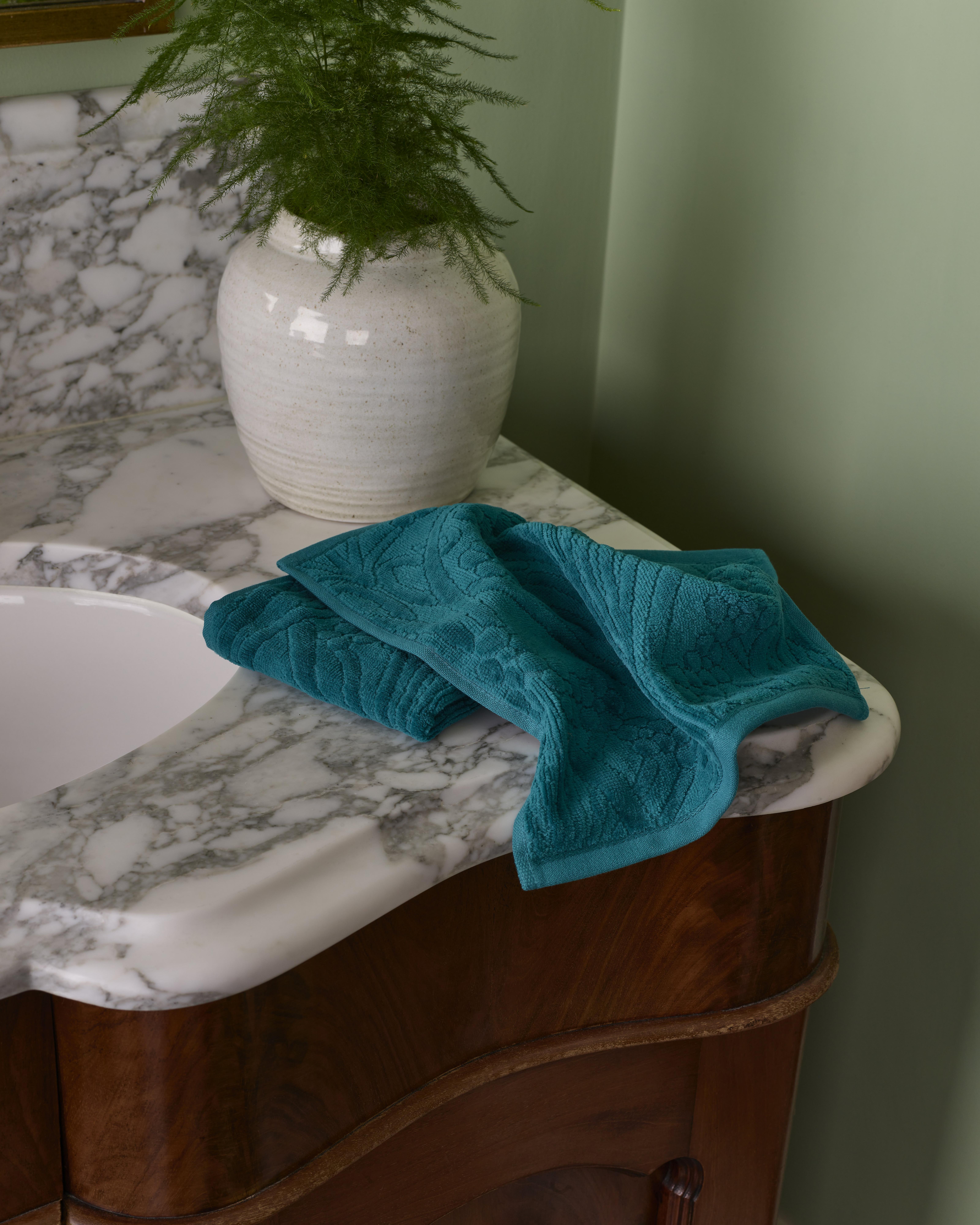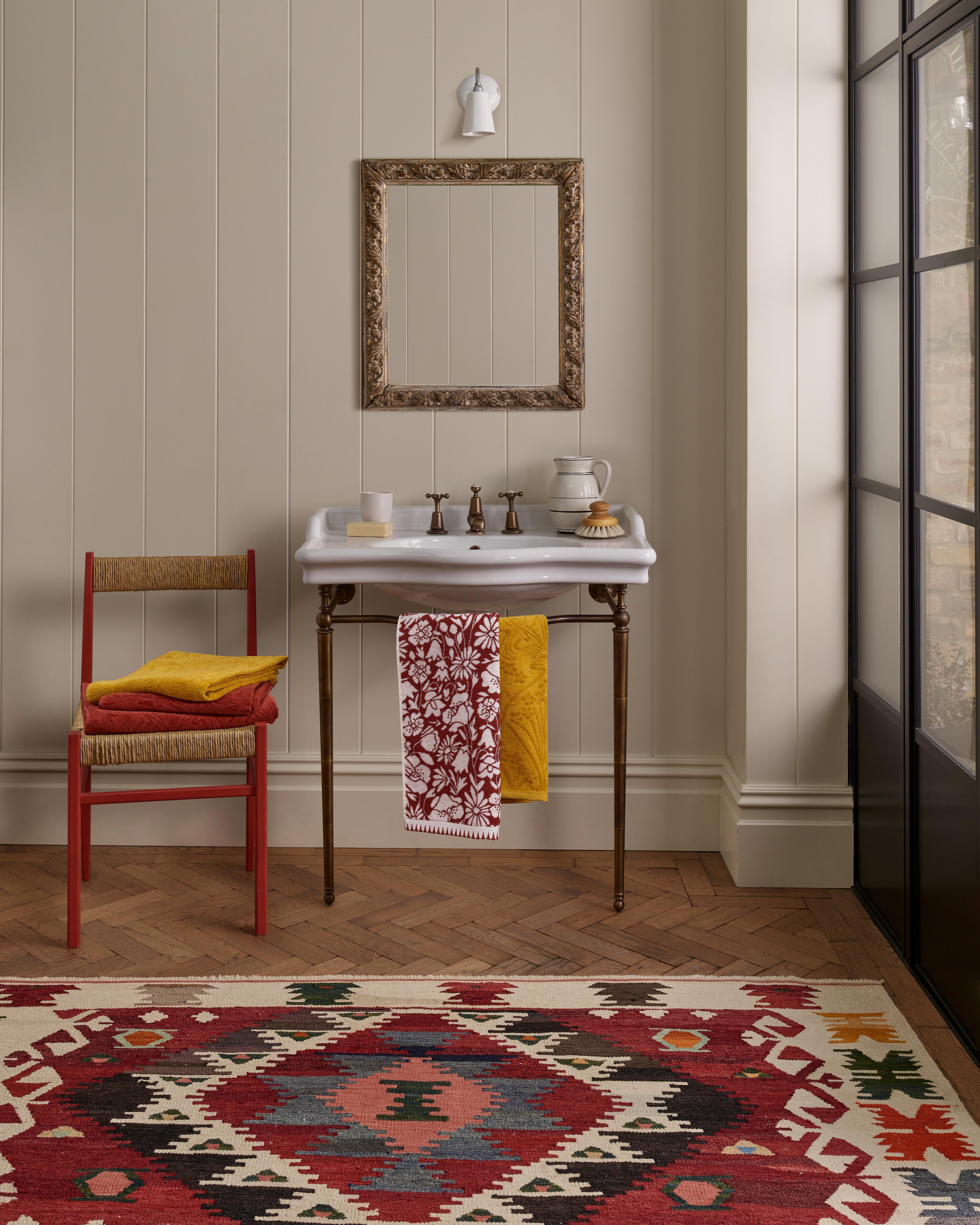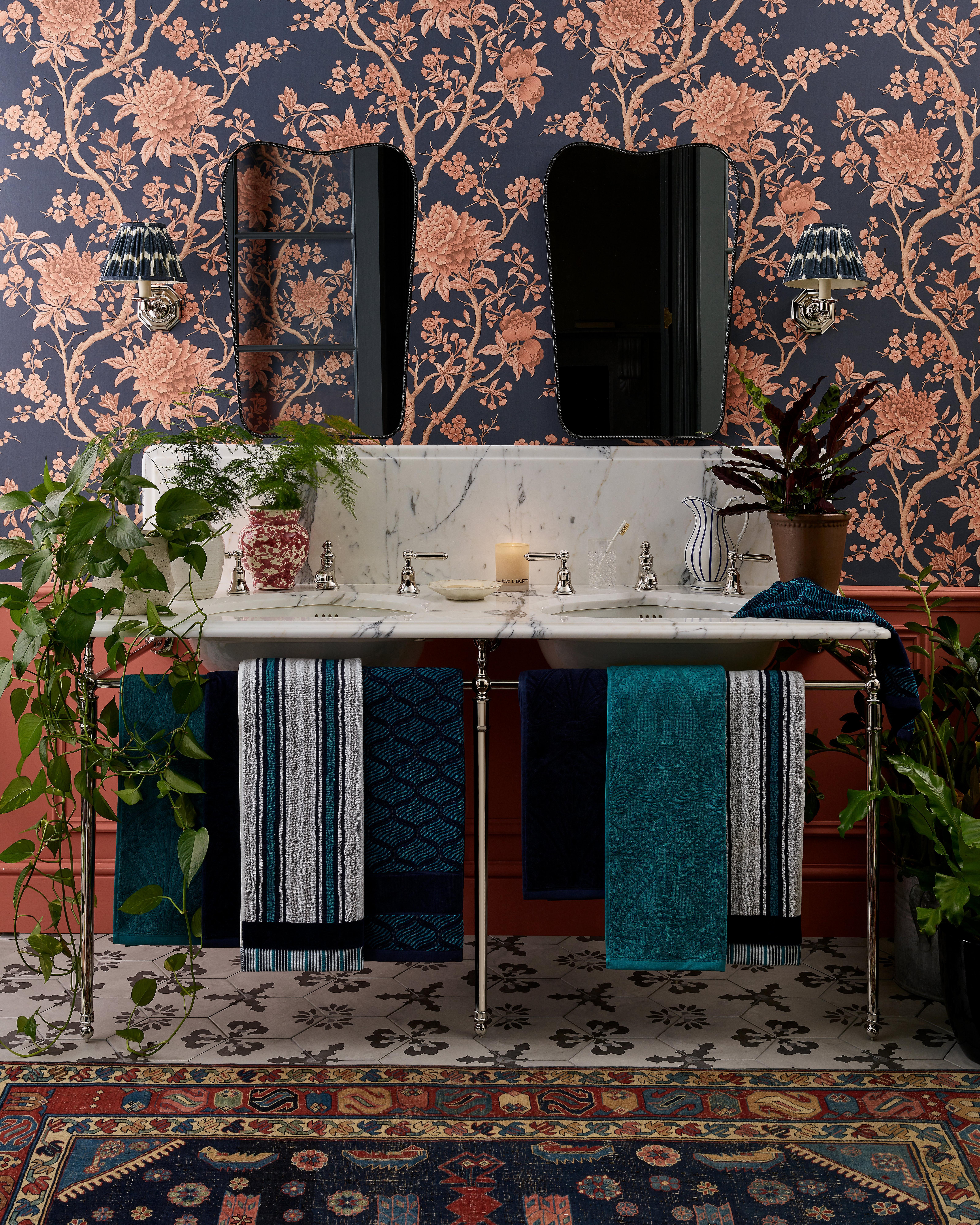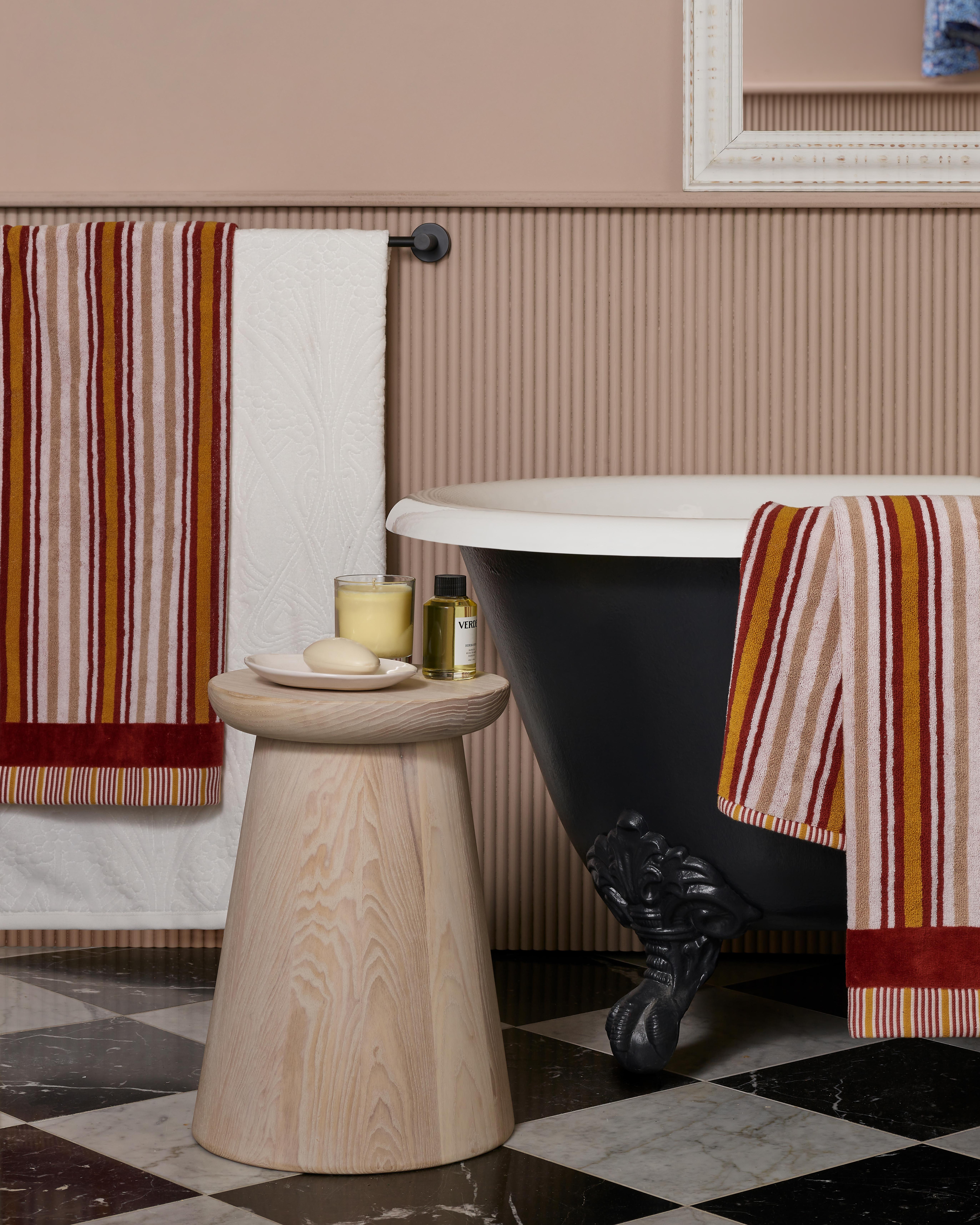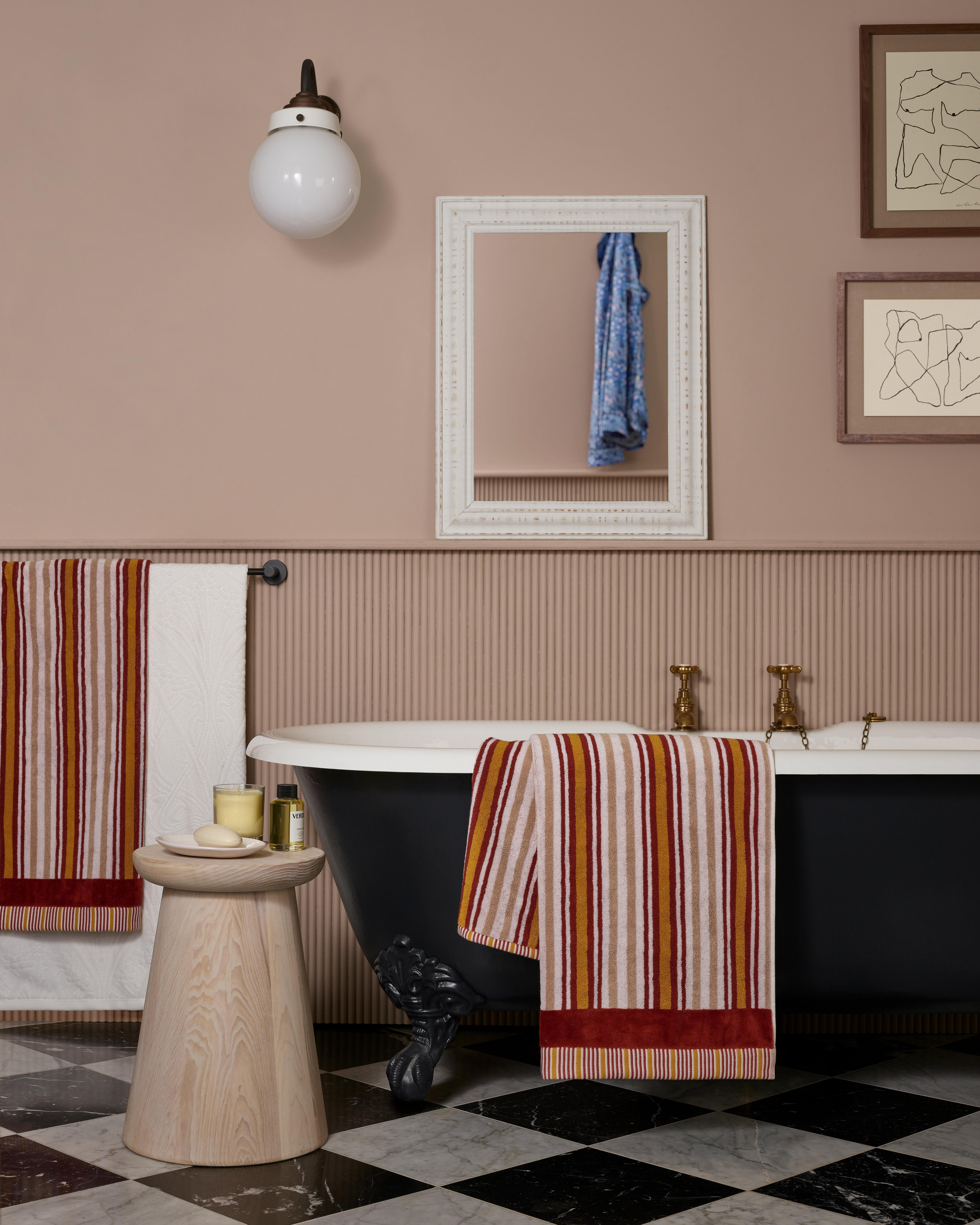 The first and most obvious step is upgrading your linens. This can be a new set of Liberty towels, a luxury bath mat or replacing a tired-looking shower curtain for something with more personality. Even something as simple as hanging a robe on the back of the door can make all the difference in injecting colour and print to an otherwise hard or clinical-looking space.
