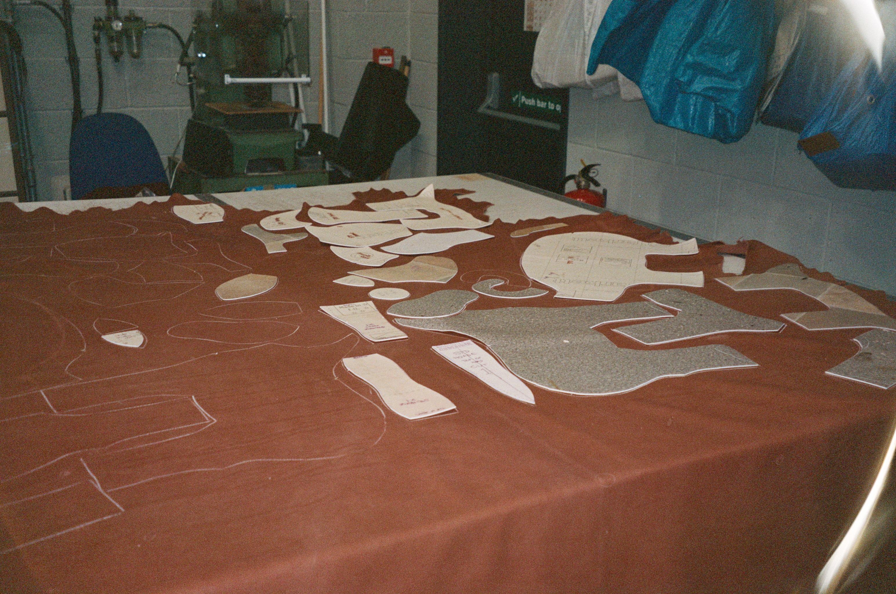 We start off with our leather, which is top grain cowhide leather. When we lay this out on our cutting table to mark out the pattern, we mirror the pattern alongside the backbone of the animal, as this allows the stretch to be even on both sides. After it's been marked out, it goes to our very experienced machinists, who have an incredibly wide range of skills. Sewing these pieces is a hard job to learn, and they have extreme knowledge under their belt.