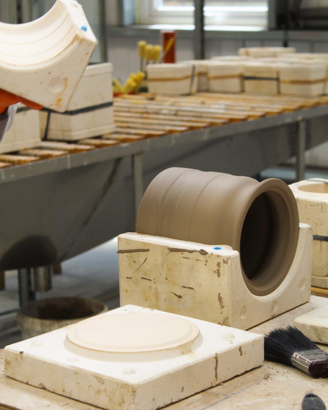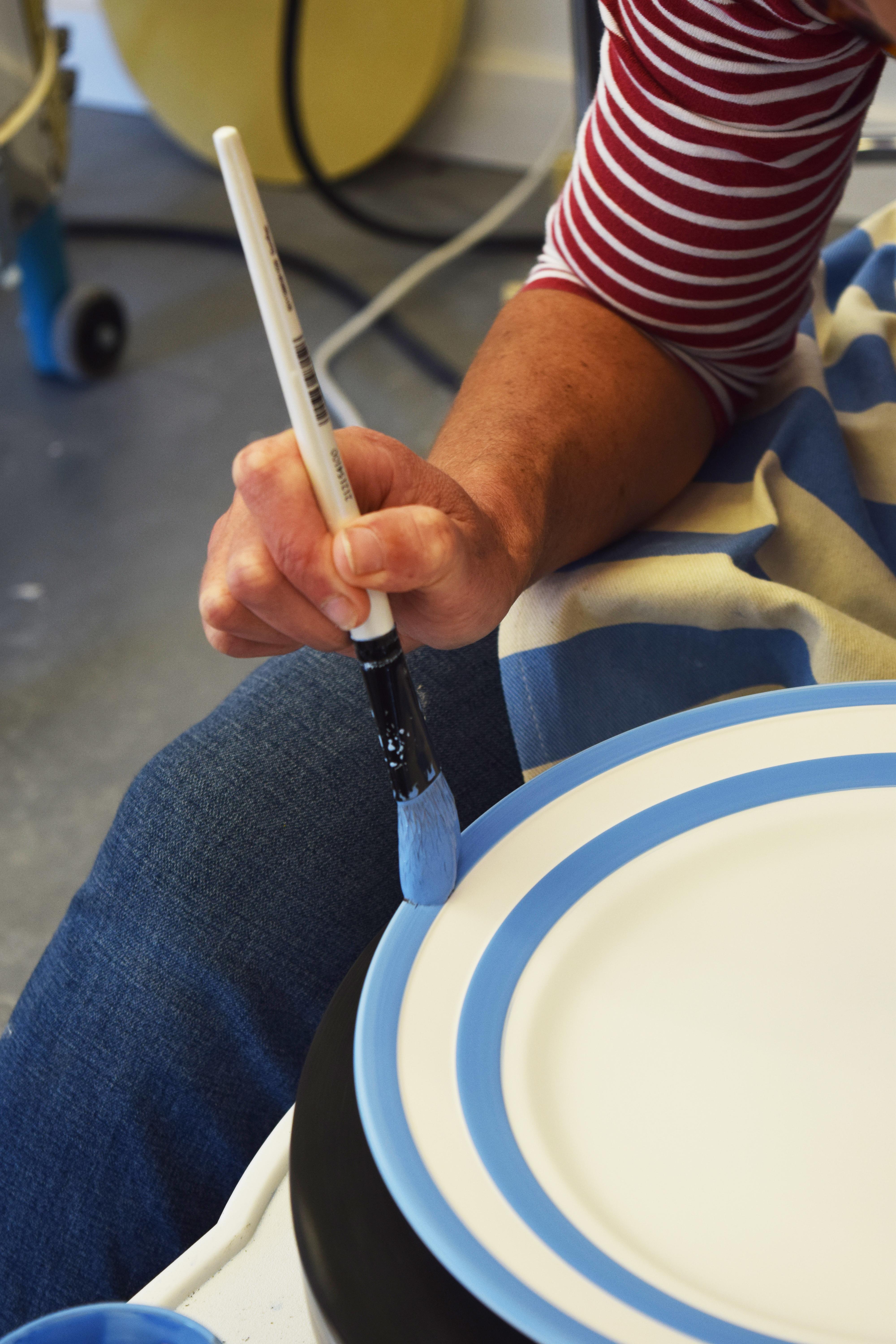 Rebecca: Over the last hundred years, processes have changed at Cornishware. I have this Cornishware history book on my bedside table, which is my bedtime reading! For the storage jars, they used to dip everything in blue paint and then carve away the stripes. But now we do a whole different process, so we paint onto the stripes. And if it's got a handle or a spout we go through a whole waxing process where we paint wax on the areas we want to keep white. We have a team of four decorators and they will paint on the stripes. It's a really really difficult skill to learn, it will take around a thousand items for them to get to a good standard, basically. So that's about three to four months of training.