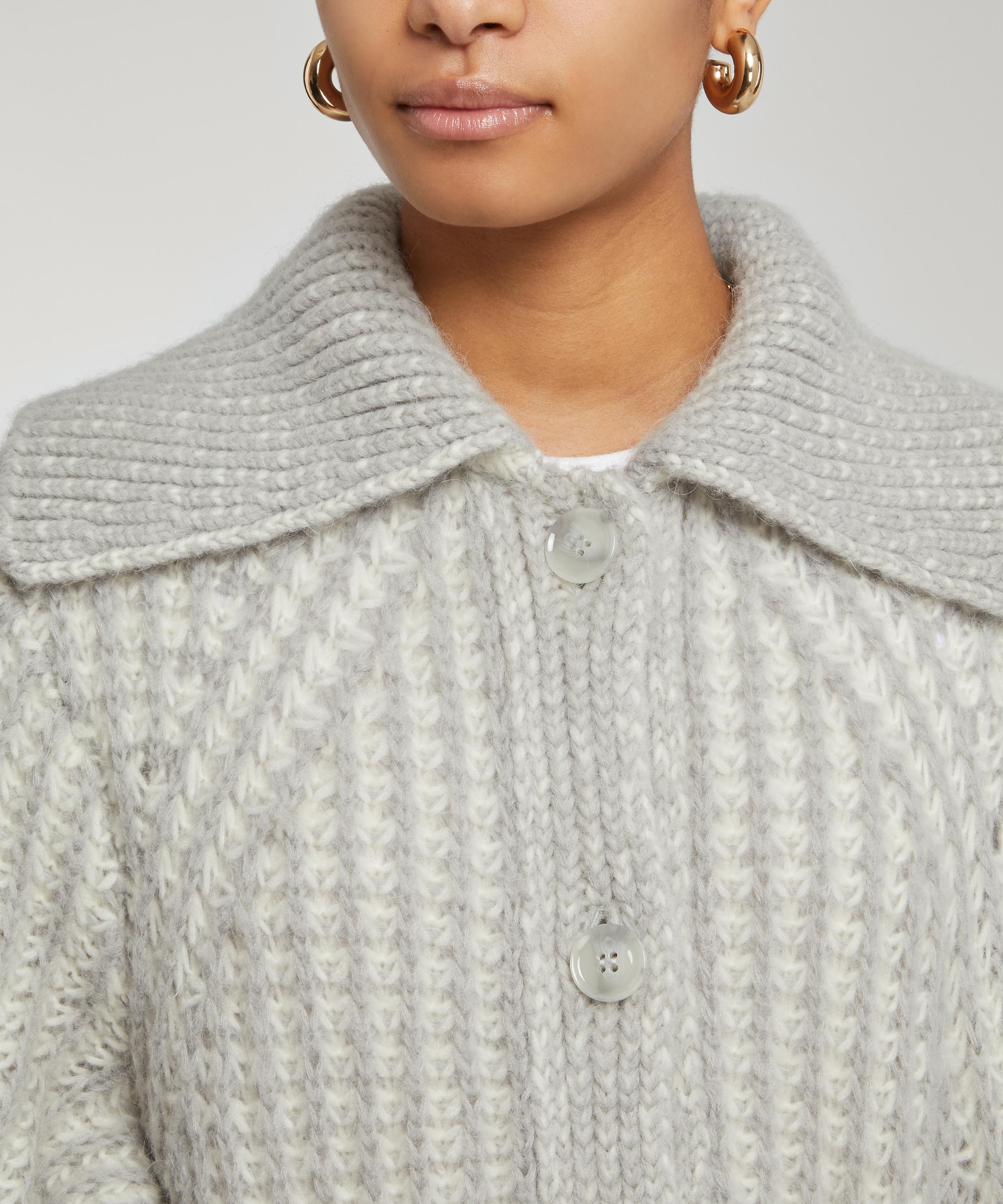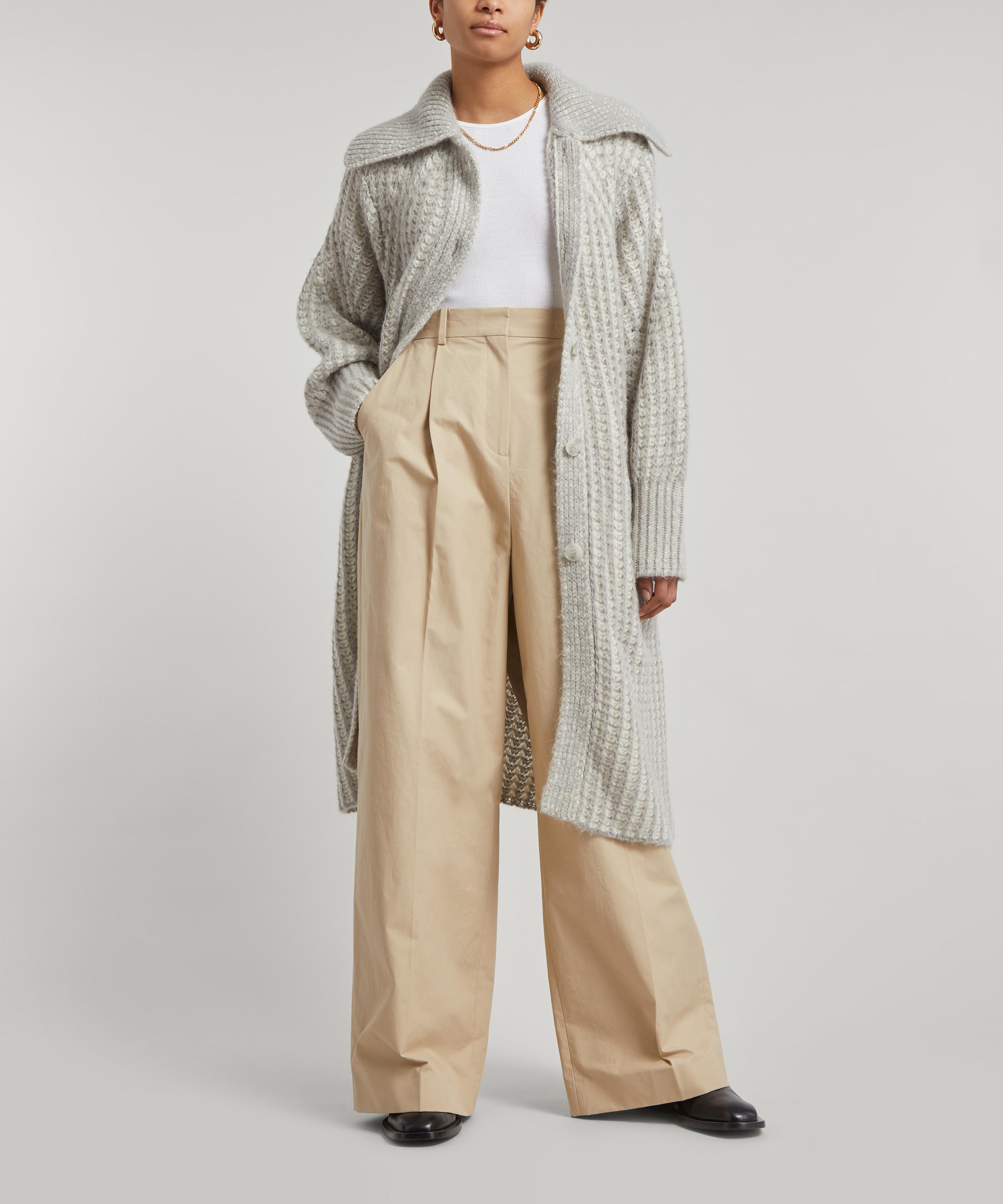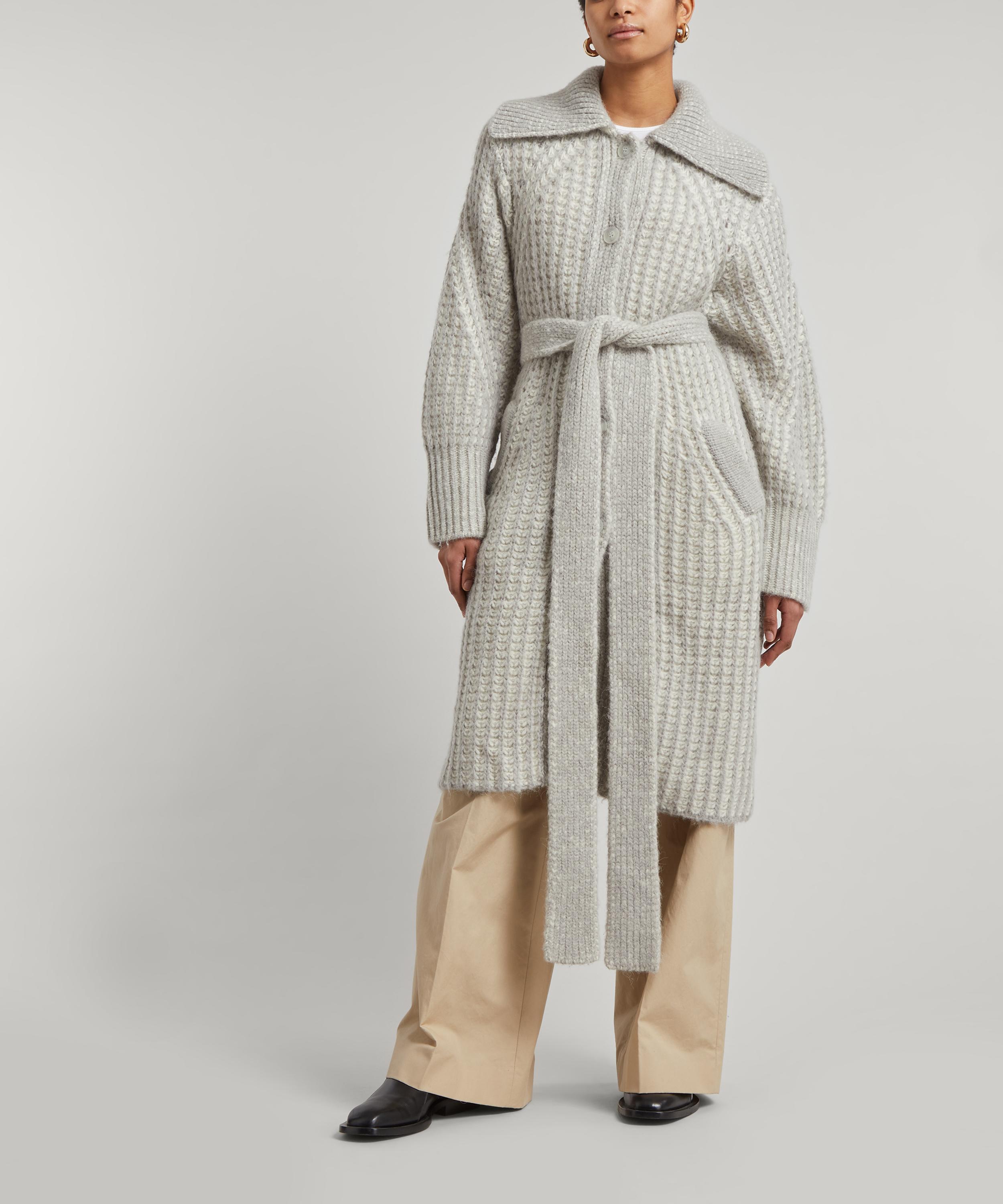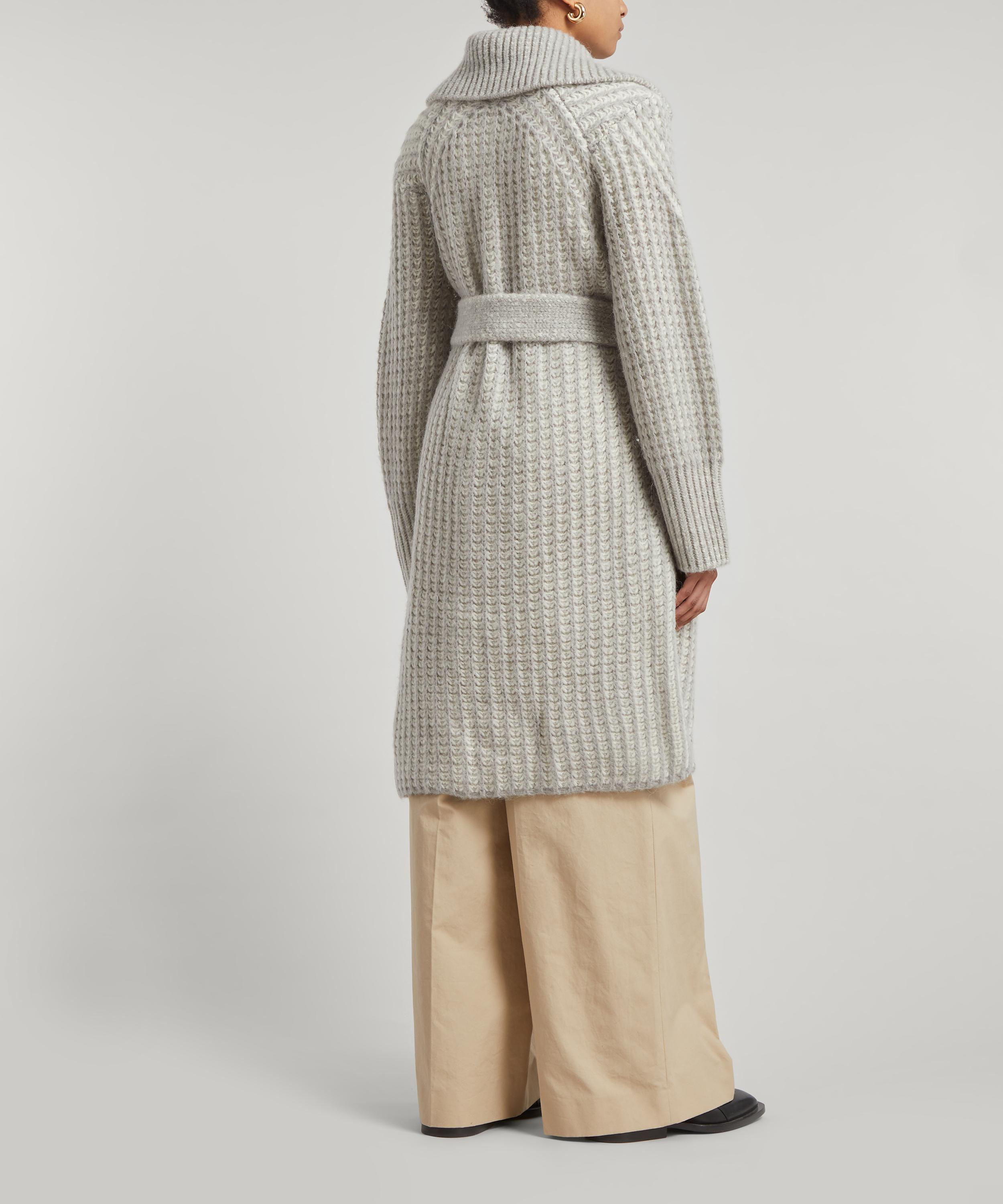 Crafted from a sumptuously soft alpaca-wool blend, this cardigan style coat is cut to a relaxed silhouette with a chunky knitted weave finish. Oversized, it has dropped shoulders with slouchy long-sleeves, and its button-down placket is complete with an adjustable knitted belt – perfect for nipping in the waist. Stylishly snug, it has an exaggerated turn-over collar with a ribbed finish. For a relaxed weekend edit, try pairing it under a plain white t-shirt with cream, wide-leg trousers for a refined look.