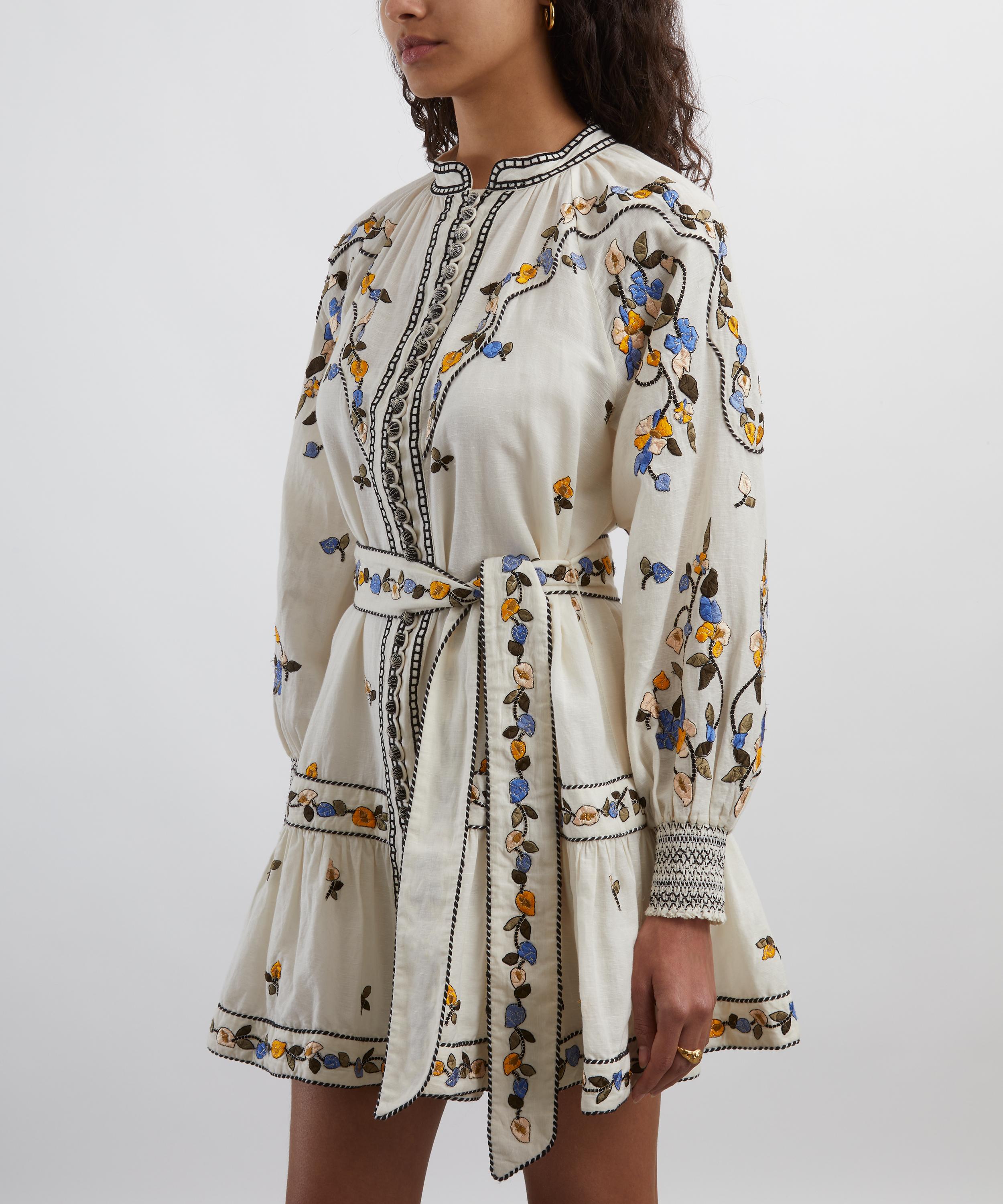 Crafted from a luxurious linen-cotton blend, the Fiucci dress embodies botanical elegance and refined craftsmanship. Adorned with floral embroidery in silk and lurex threads, it features a band collar, long sleeves with smocked cuffs, and a detachable fabric belt for a softly cinched silhouette.