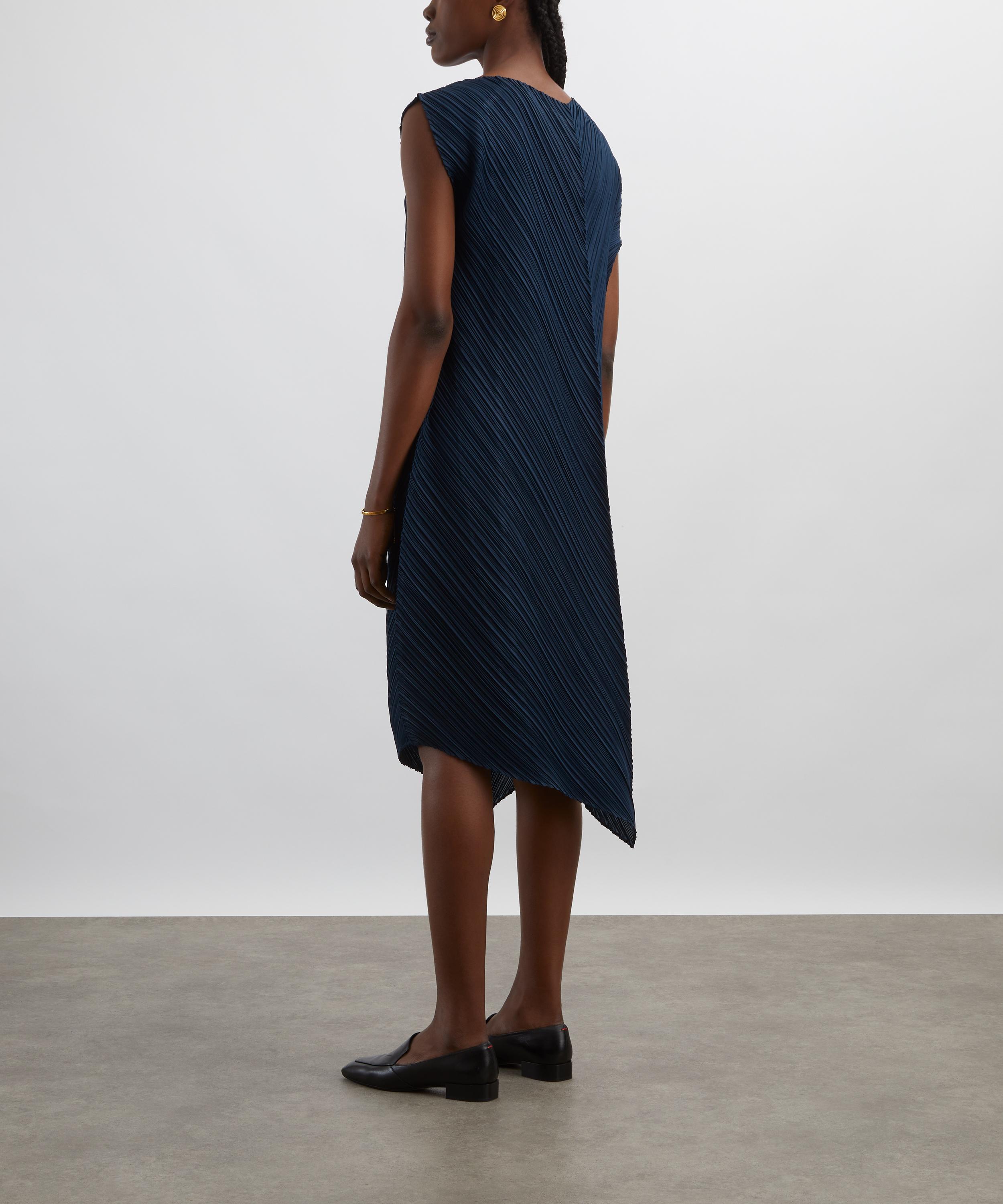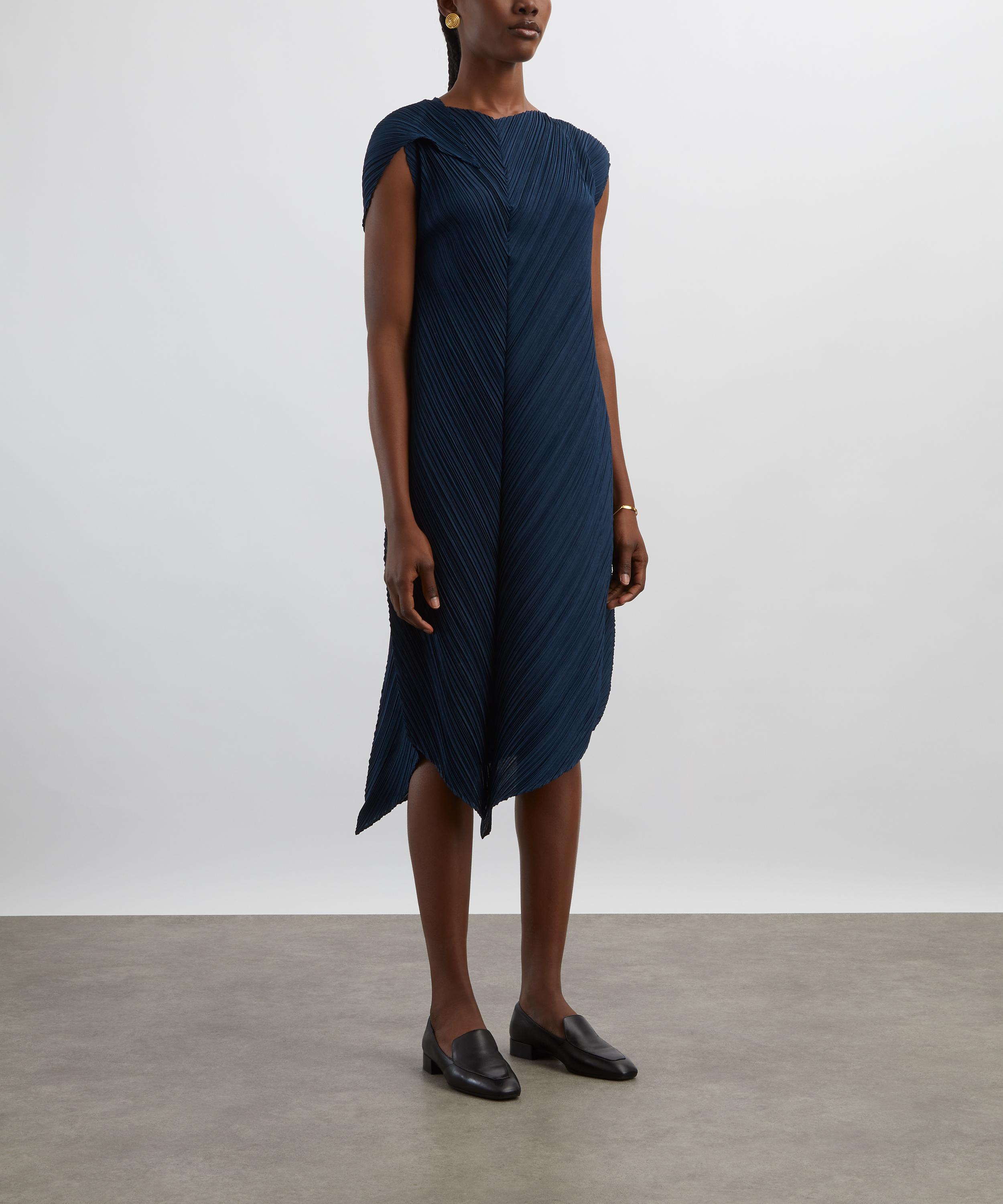 Part of the FLARE collection - characterised by distinctive fold lines and elegantly turned-up corners that reflect the refraction of light - this pleated midi dress features cap sleeves, an off-centre V-neckline, and an asymmetric hemline, creating a bold and contemporary silhouette.
