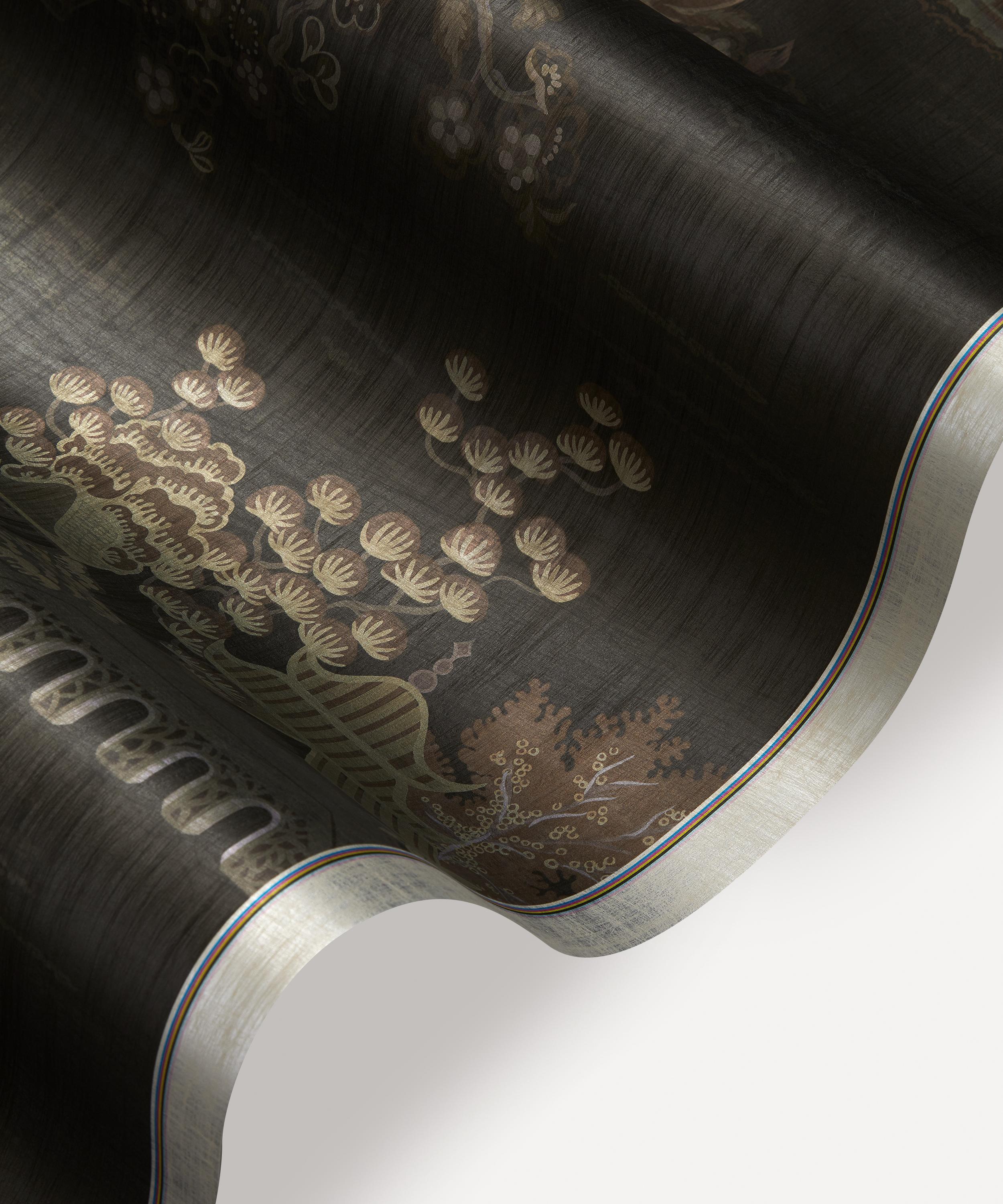 Floating Palace is a reimagined print from the 1970s. Originally a furnishing fabric, it now incorporates new stylistic elements and tonal palettes with intriguing islands filled with lush gardens, oversized lotus flowers, floating sampans, and birds in full flight. Inspired by traditional Chinoiserie wallpaper, it’s printed on a textural fibrous metallic base providing richness and depth reminiscent of antique lacquerware and delicate glass.