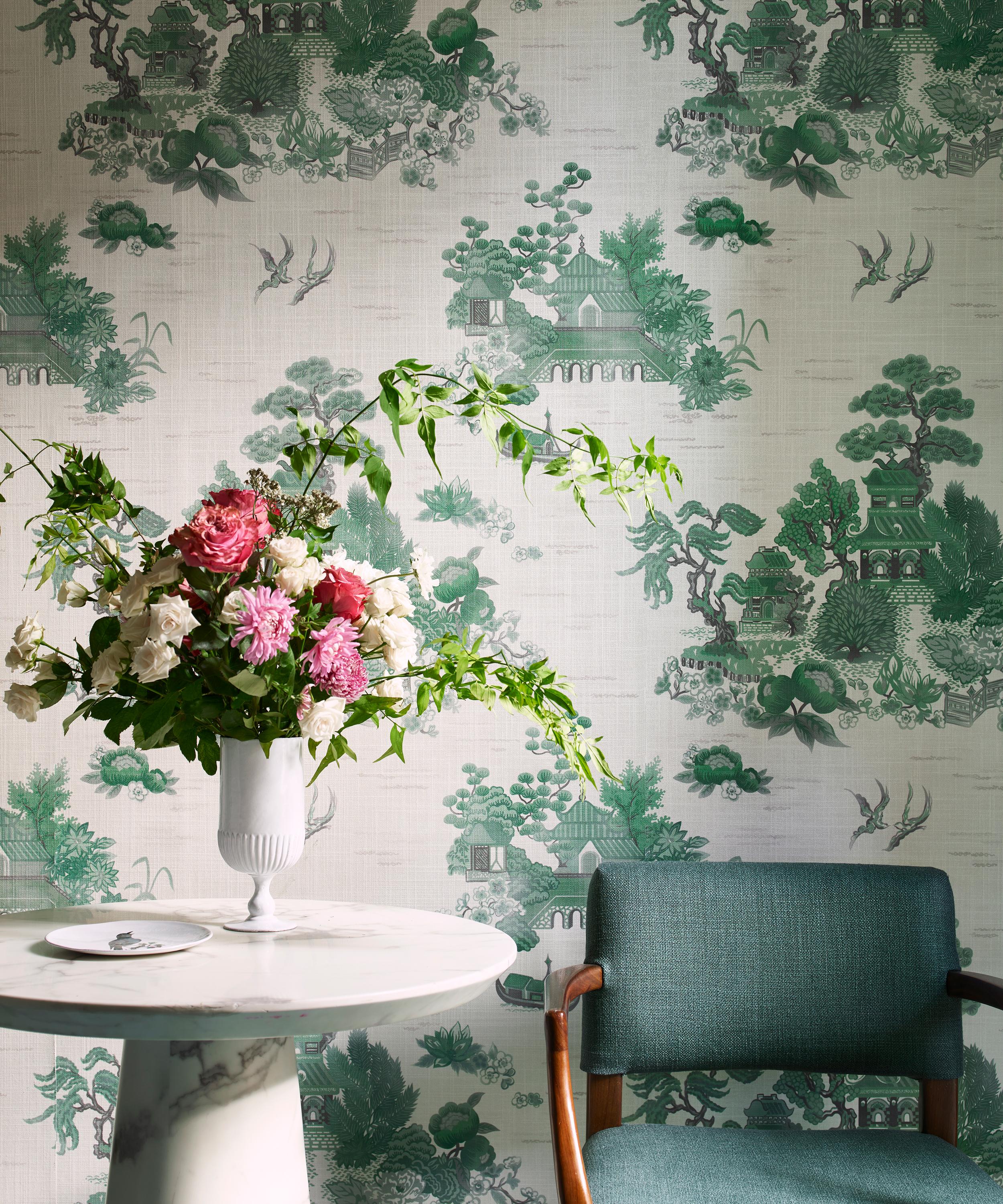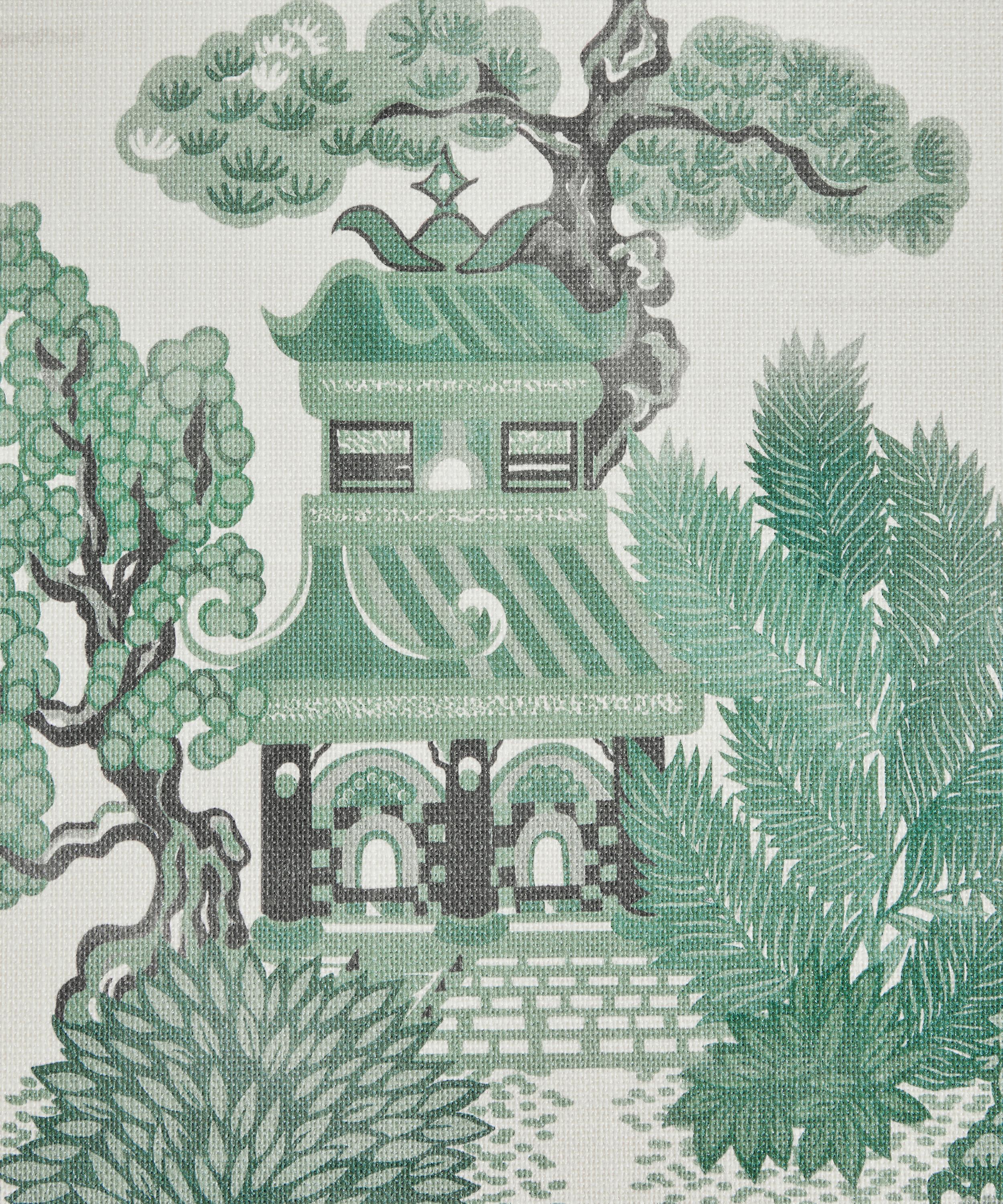 Floating Palace is a reimagined print from the 1970s. Originally a furnishing fabric, it now incorporates new stylistic elements and tonal palettes with intriguing islands filled with lush gardens, oversized lotus flowers, floating sampans, and birds in full flight. Inspired by traditional Chinoiserie wallpaper, it’s printed on paper backed linen providing a fresh, contemporary ground with jade tones.