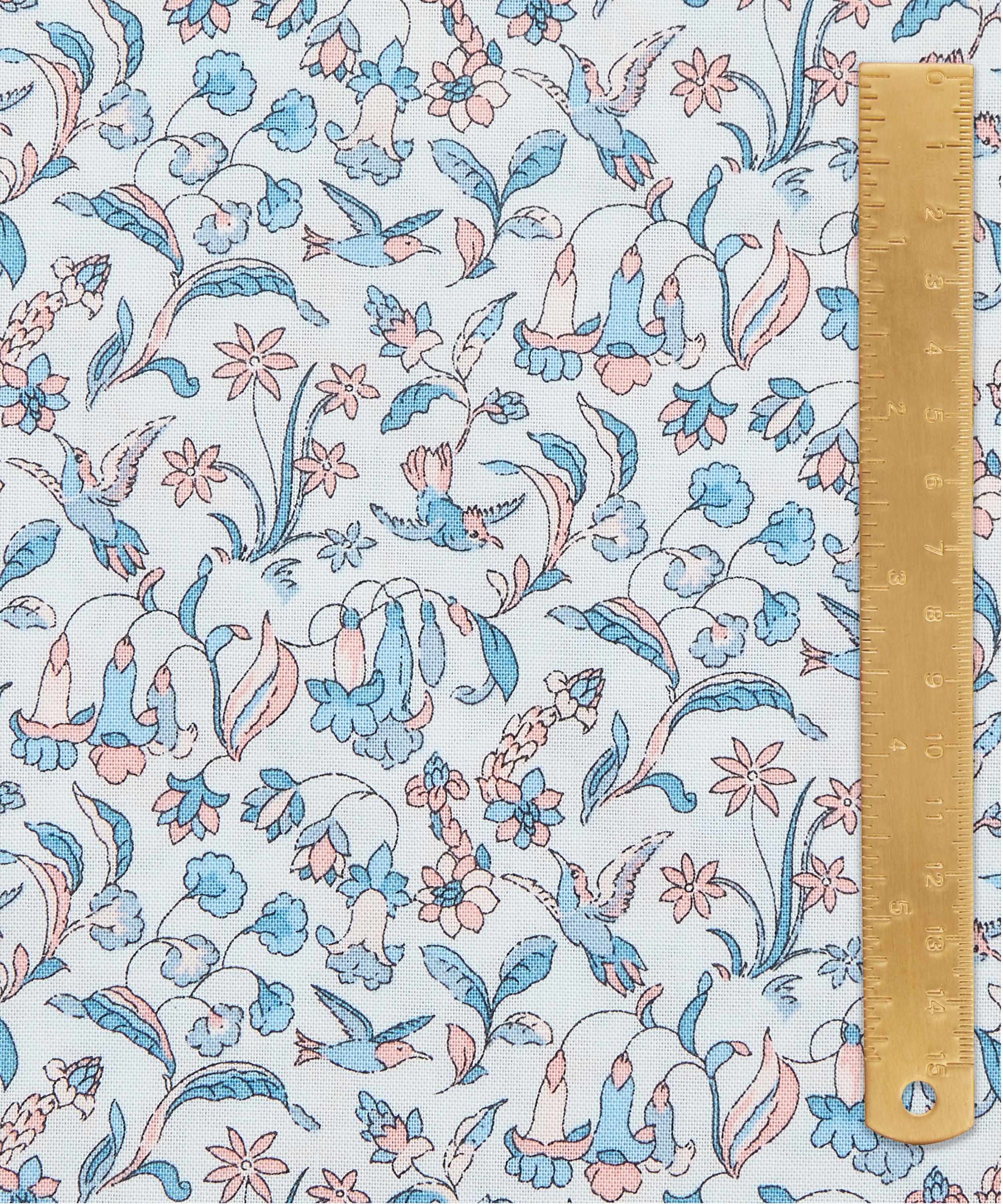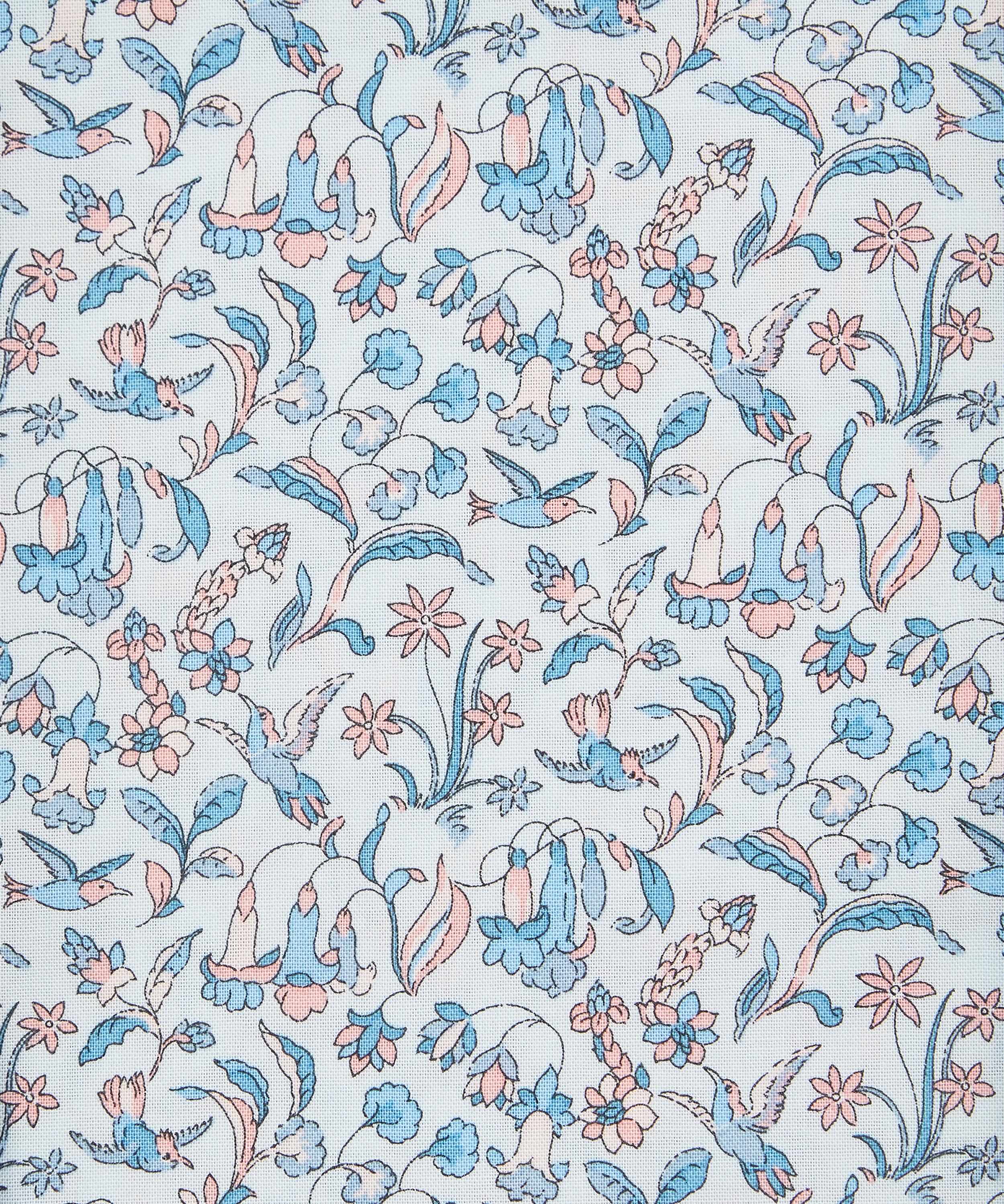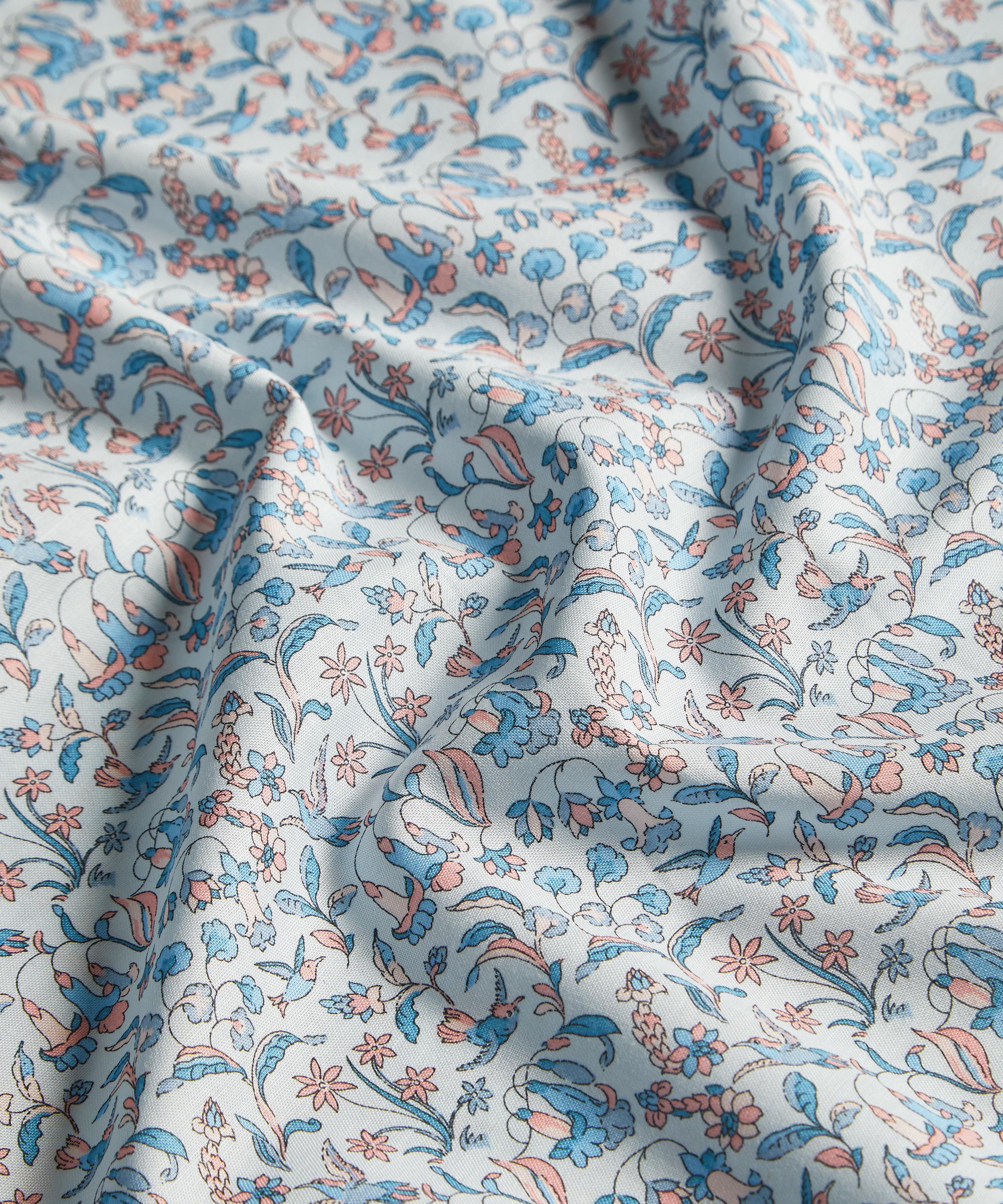 Based on a hand-painted artwork discovered in the Liberty archive, this charming conversational print features an array of elegant floral sprigs, surrounded by fleeting camouflaged birds. The soft blotted effect was translated from the original to achieve a subtle texture.