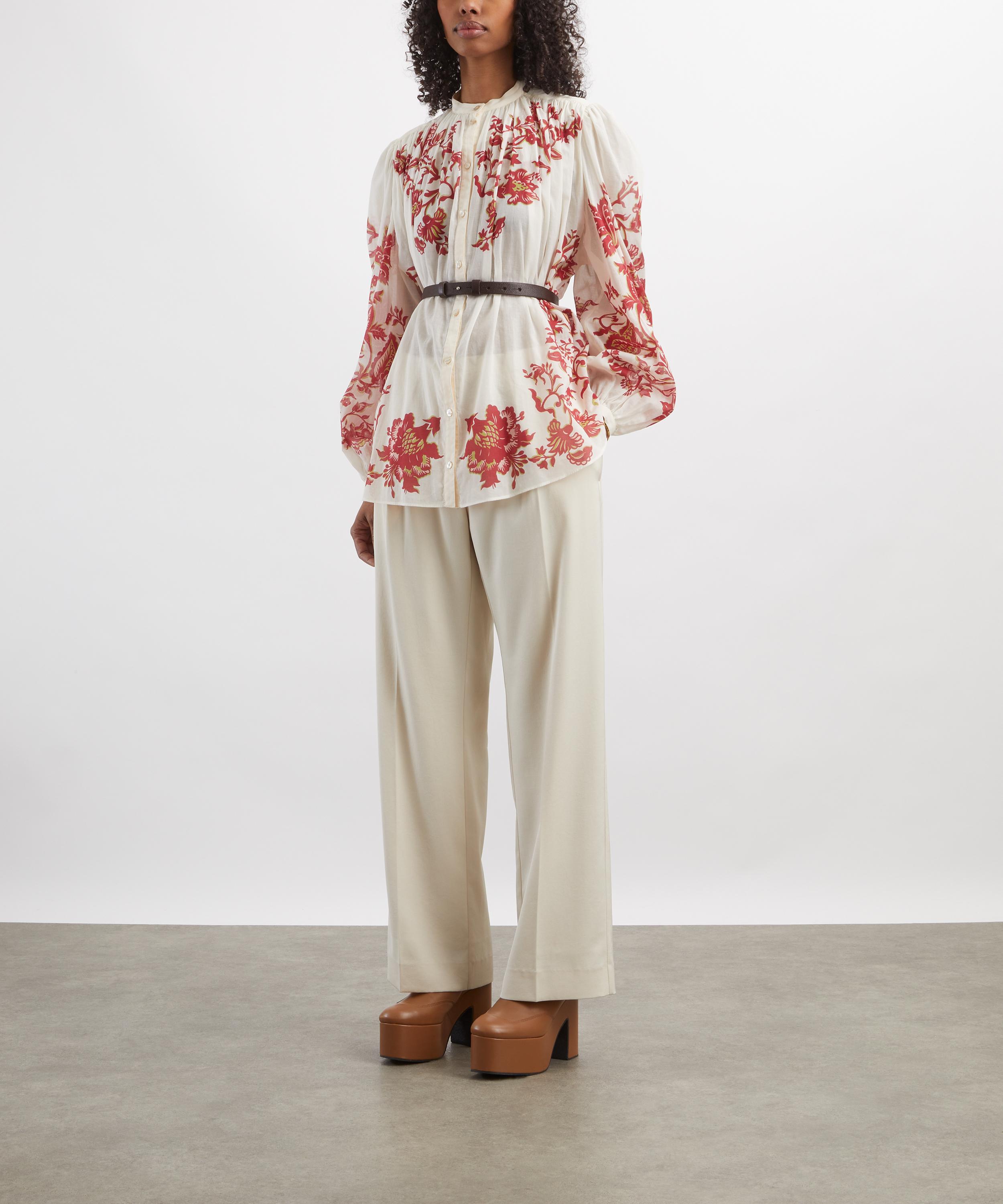 Expertly crafted in Italy from lightweight cotton voile adorned with charming red florals, this blouse is a true statement piece. It features voluminous long puff sleeves, a band collar, and a gathered neckline with a button placket for an elegant finish.