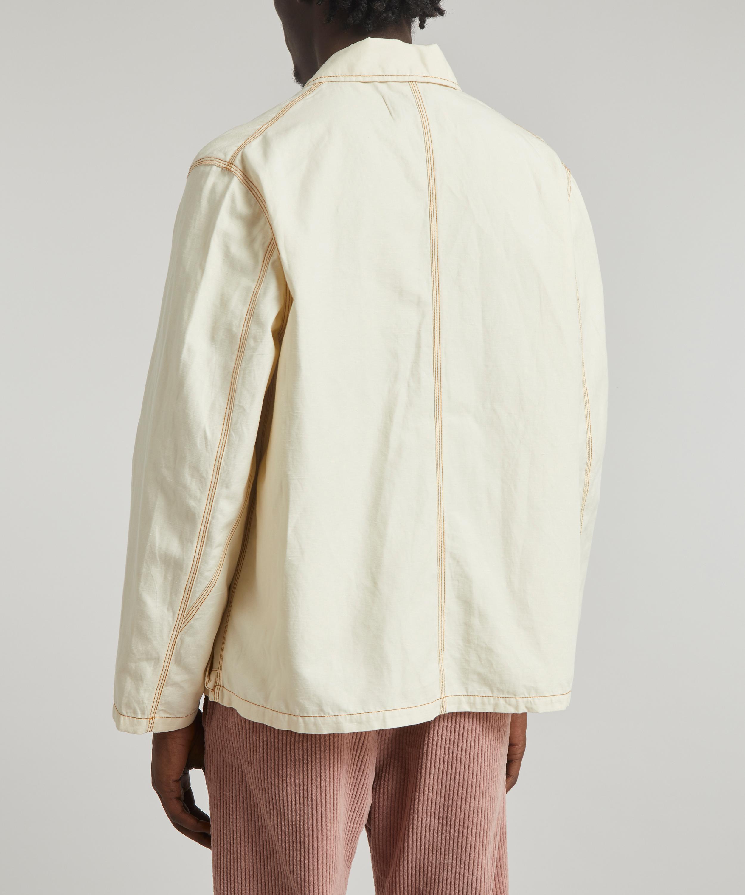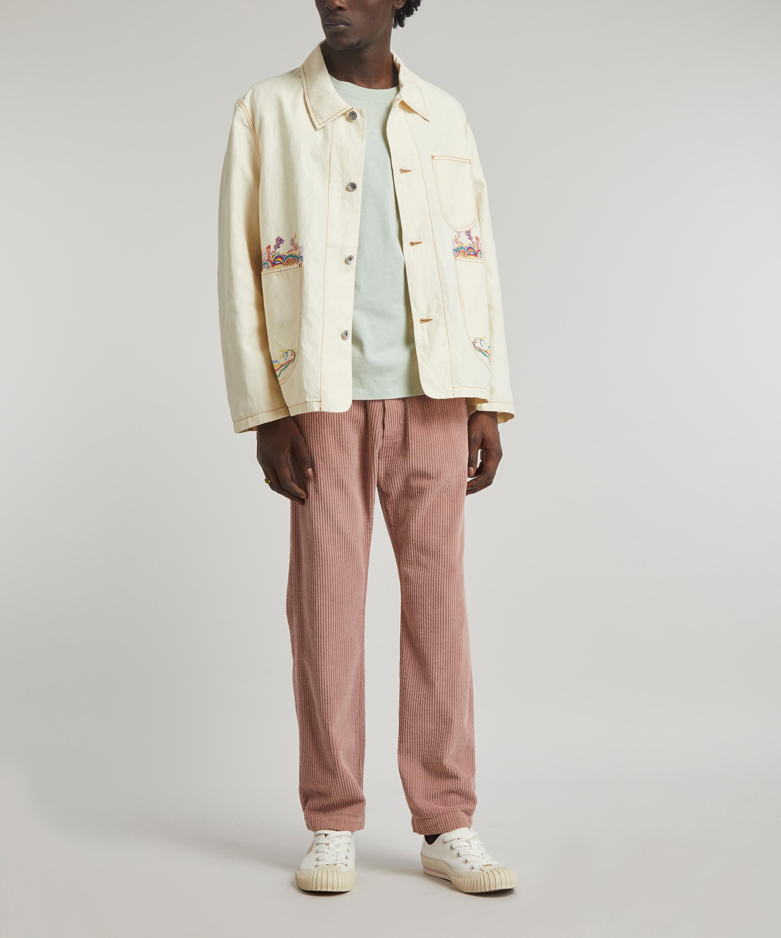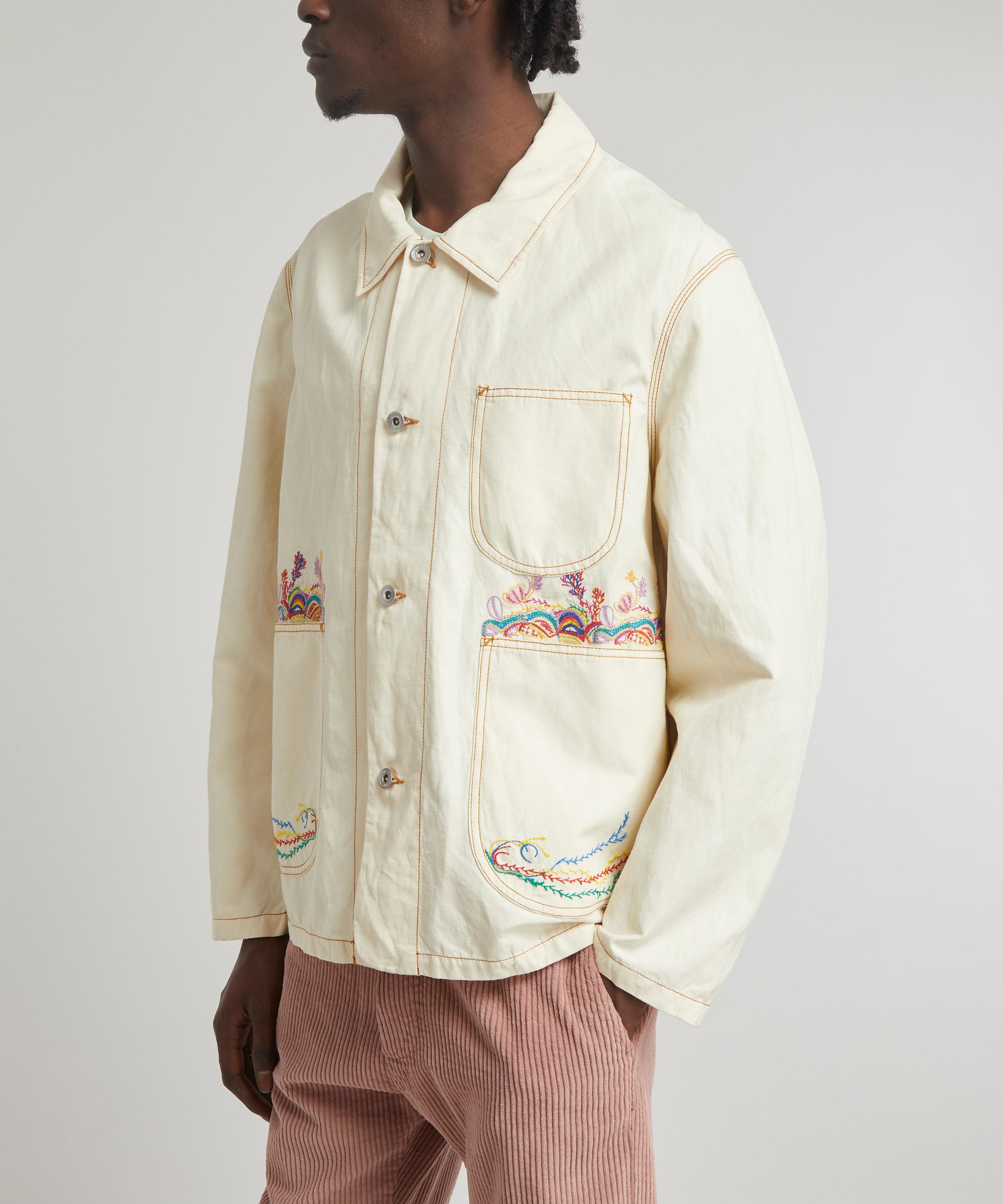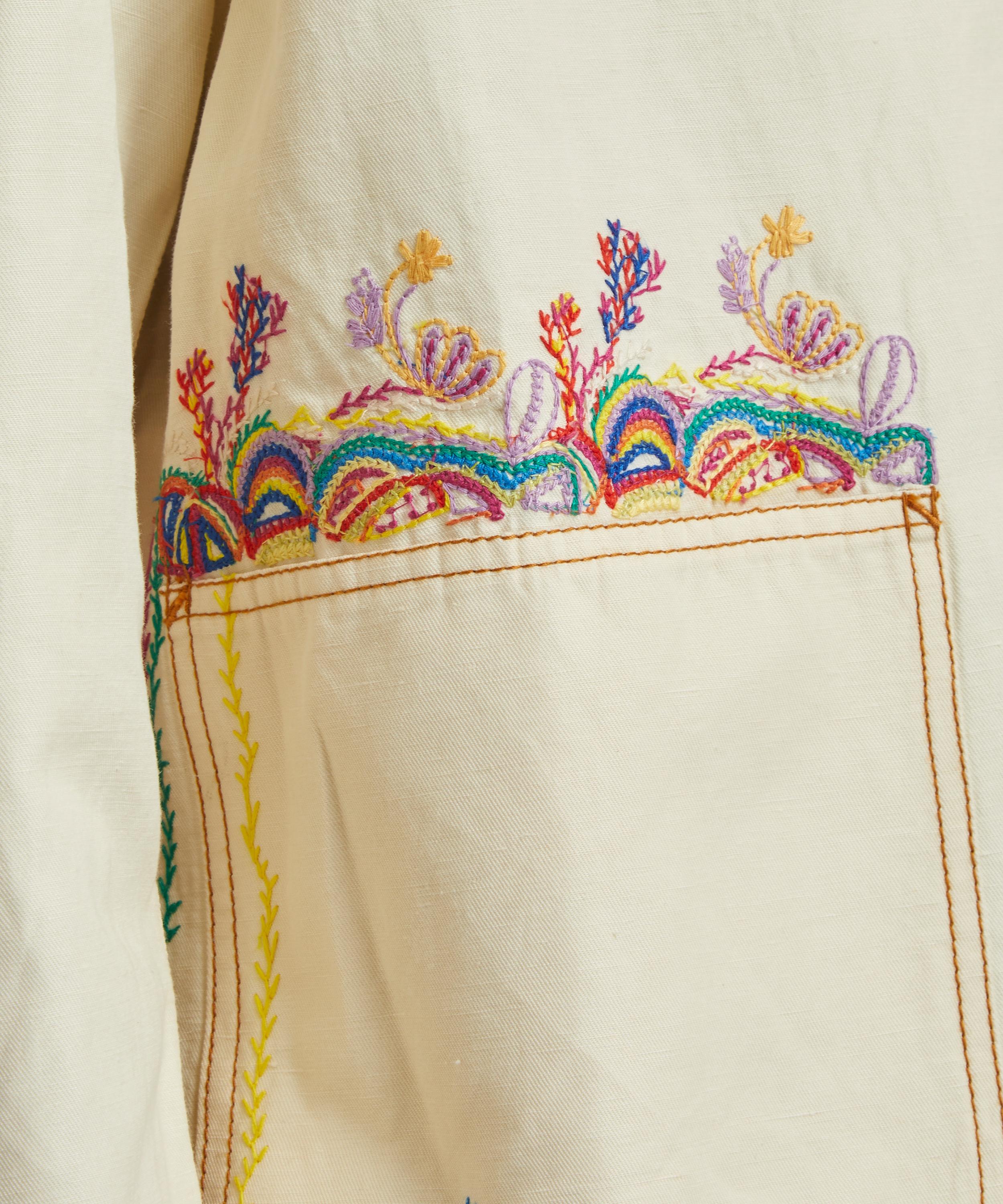 Luxuriously woven from a rich cotton and linen blend, this utilitarian-style jacket is inspired by French workwear and demonstrates the power of understated, high quality design. Garment washed and finished with intricate floral embroidery across its patch-pockets, this boxy-fitting jacket will effortlessly uplift your daily edit – we love it paired with pastel hues for a considered look.