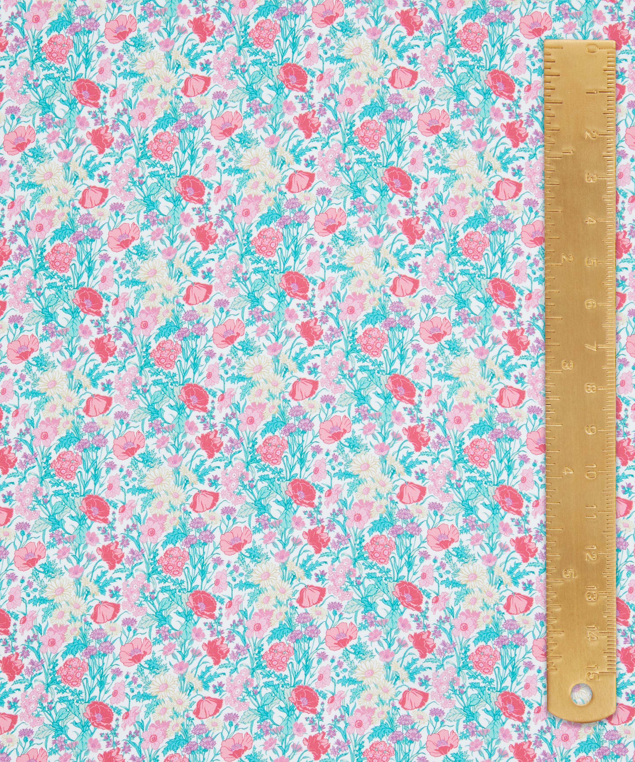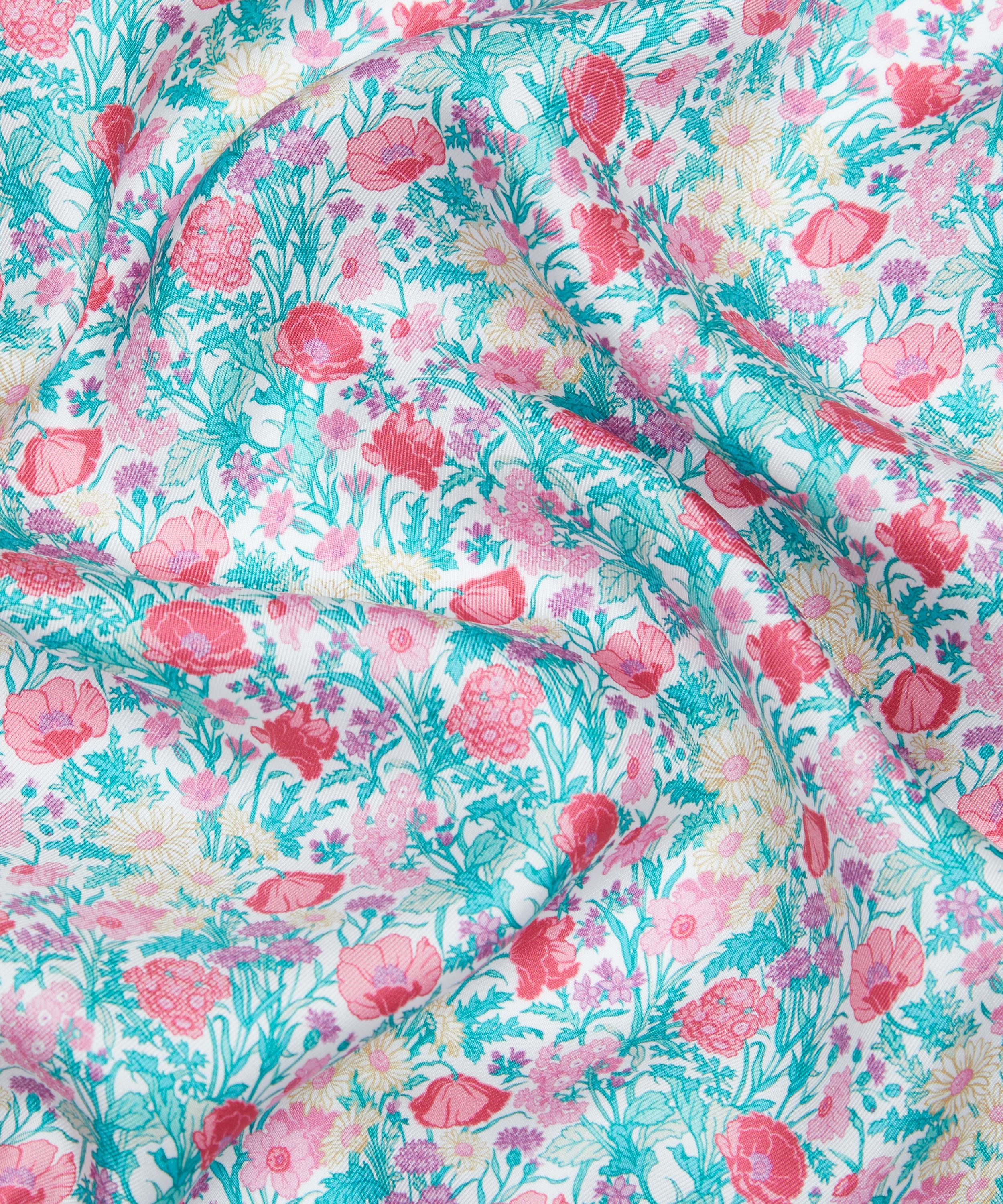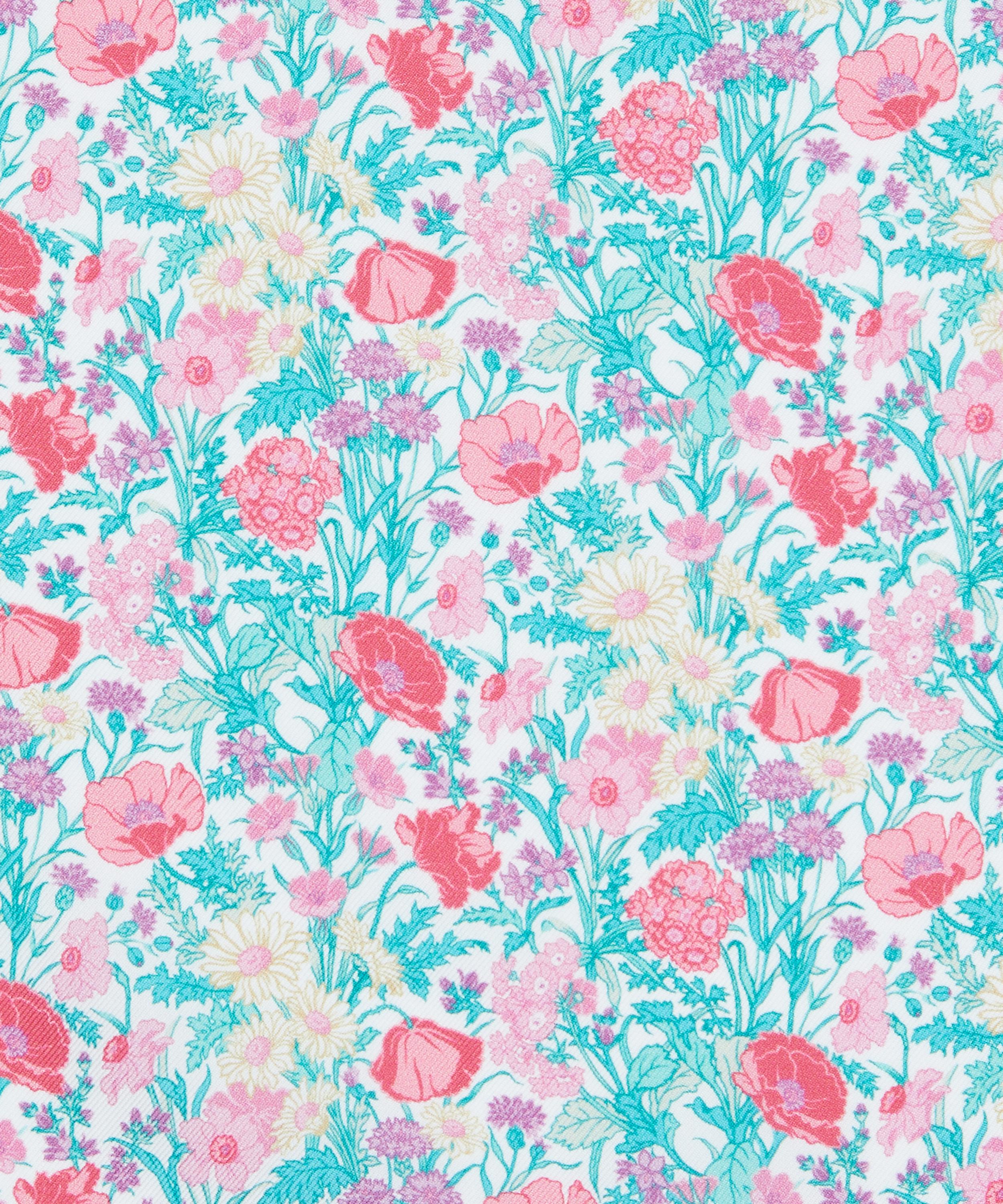 Based on a hand-painted artwork discovered in the Liberty archive, Florence May features a plethora of wild flowers typically growing in the English countryside. Elegant poppies, daisies, daffodils, primroses, pinks, corn flowers and forget-me-nots follow a subtle trailing pattern, conjuring up images of long walks through dazzling spring meadows.