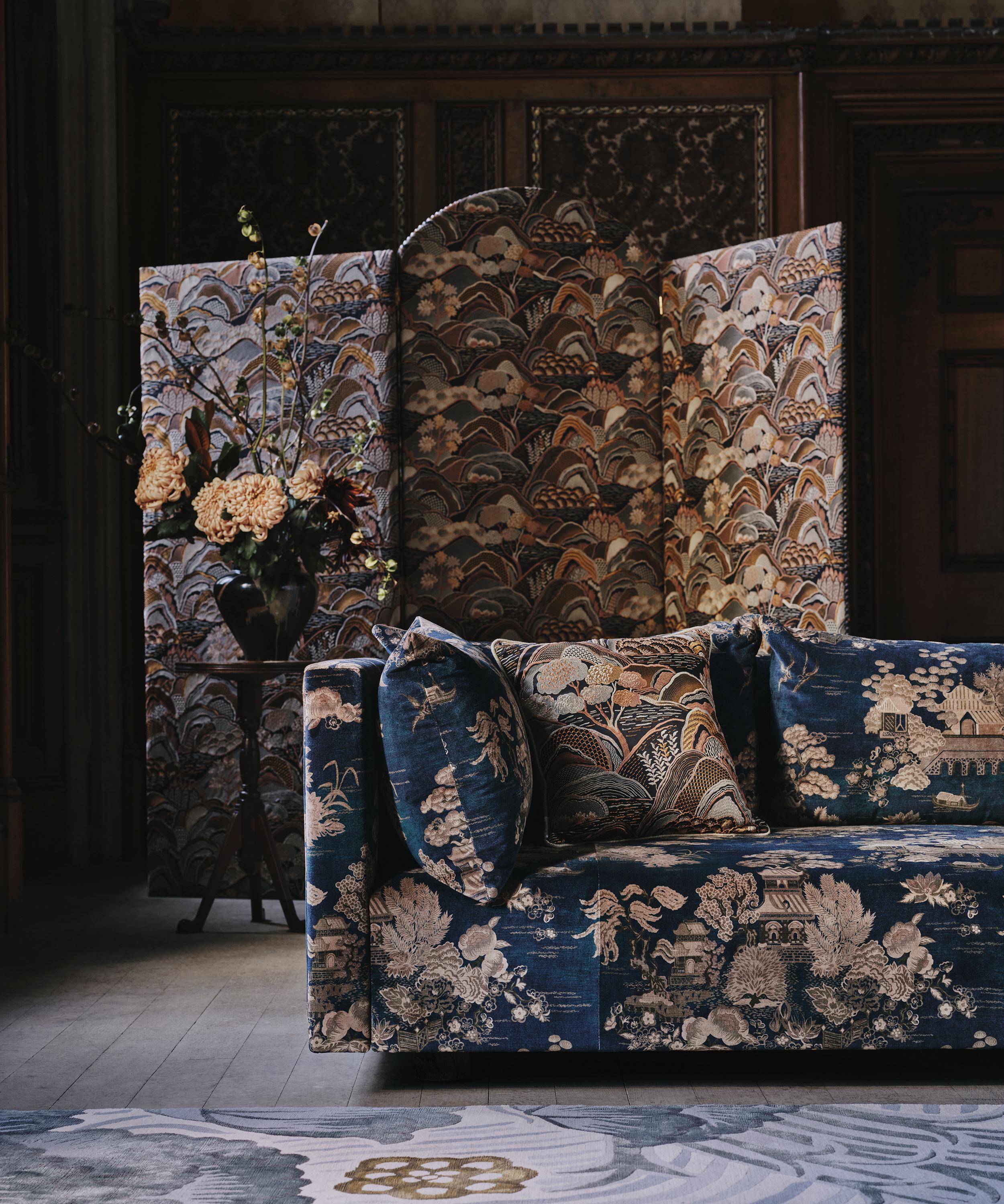 The Botanical Atlas fabric collection celebrates our historic lineage of craftsmanship and design through a cross-pollination of styles and visual narratives. Richly layered embroideries, opulent textured weaves, and contemporary printed velvets and linens are juxtaposed with a selection of elegant stripes and mesmerising geometrics - expertly crafted using traditional and cutting-edge techniques in Italy, Belgium, and India. Based on a fabric swatch found in the Liberty archive, Forest Hills is reminiscent of traditional Japanese woodblock prints and embraces the aesthetic and characteristics of a Zen Garden.