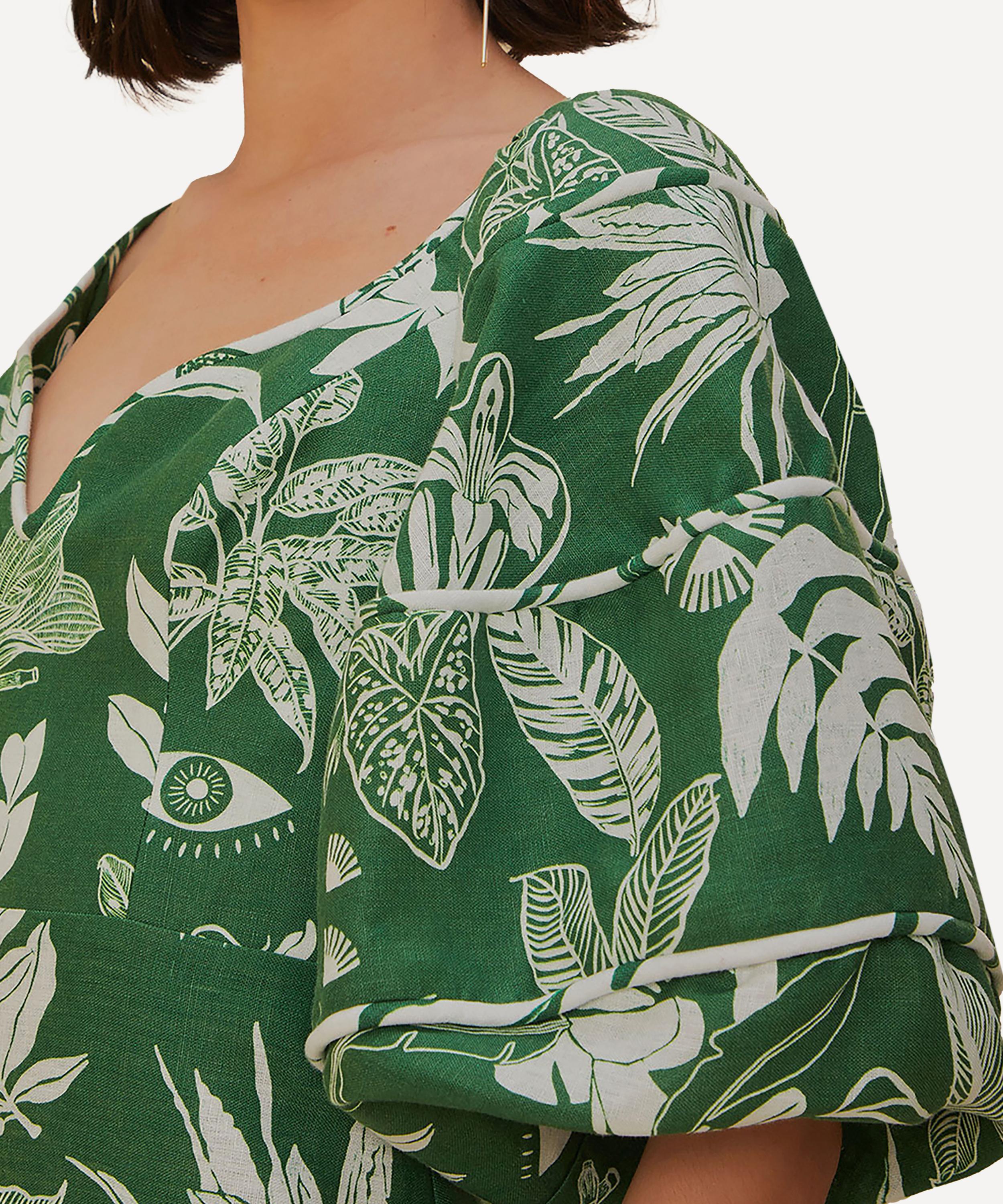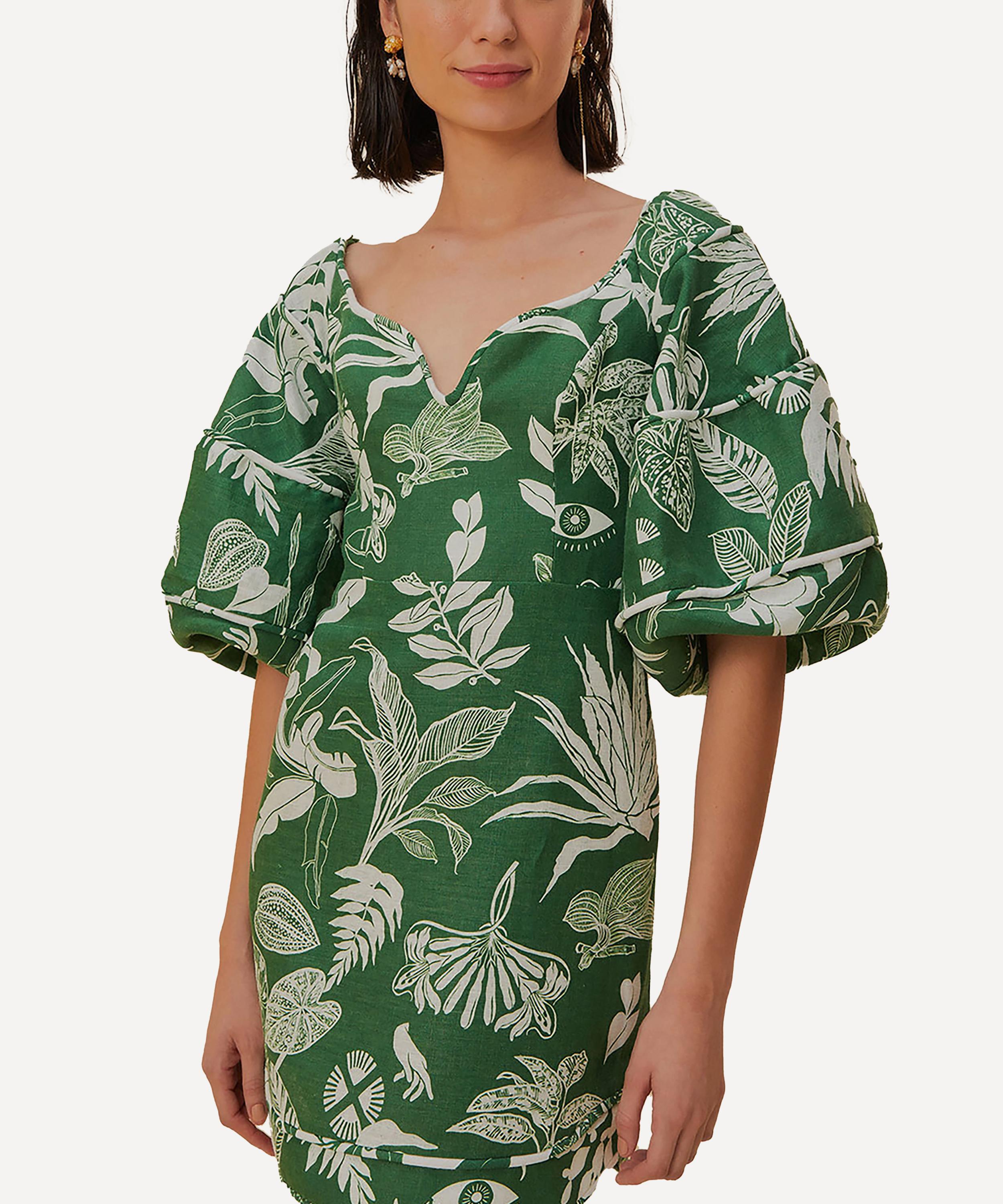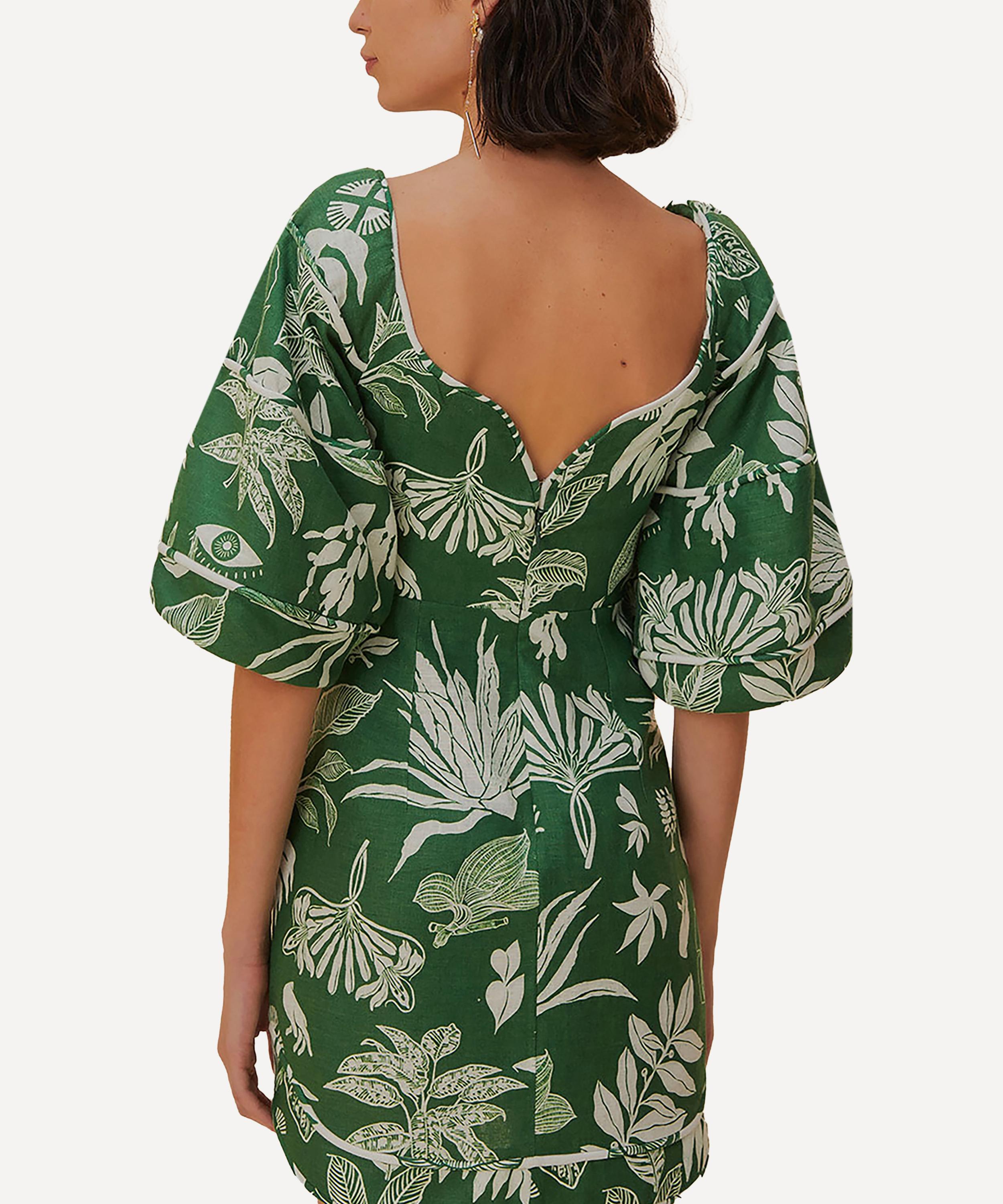 Adorned all-over in the bold and blooming Forest Soul print, this playfully-short linen mini-dress is the ultimate summer piece with its wide V-neckline, and voluminous puff-sleeves.
