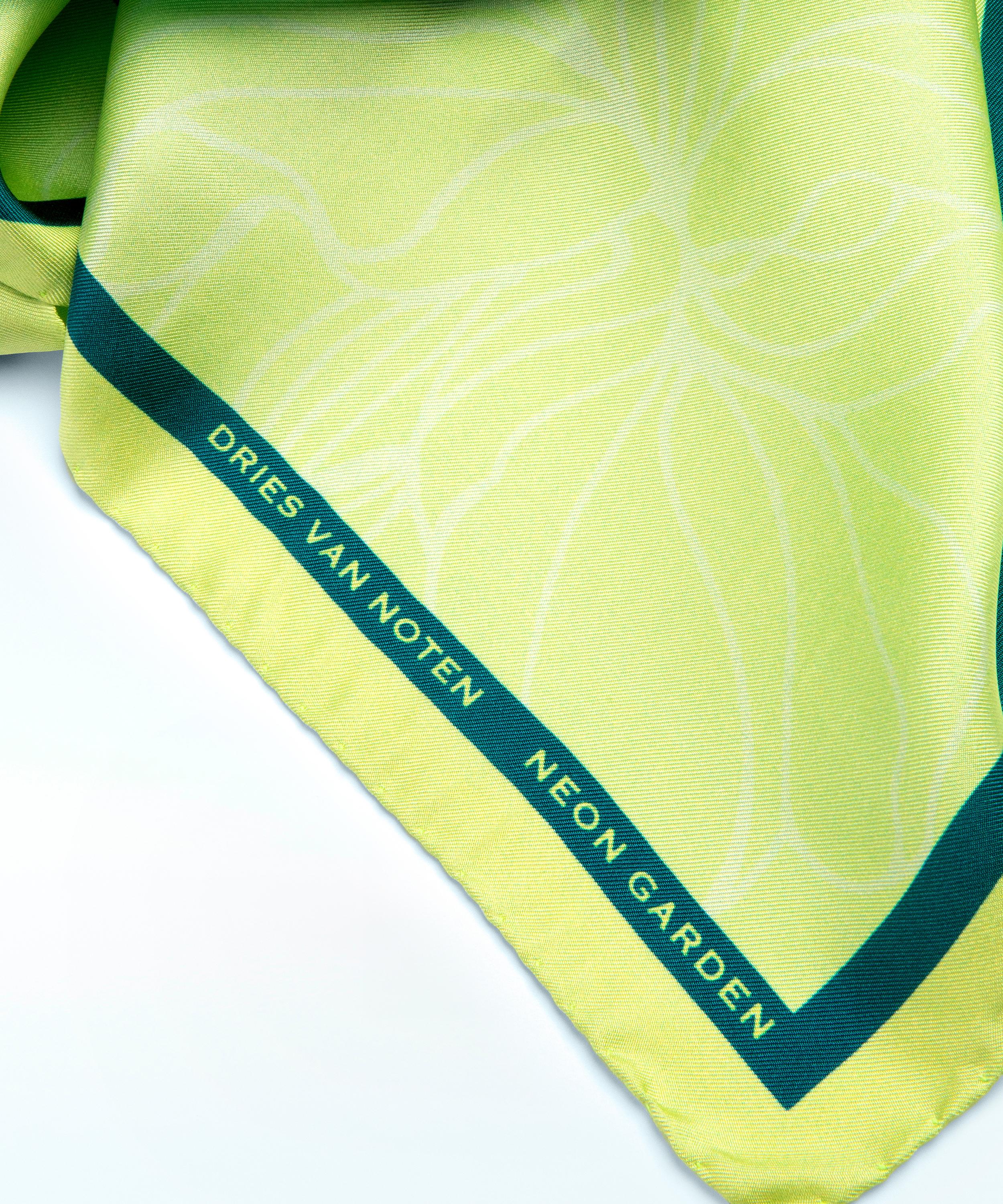 A captivating addition to your repertoire, Dries Van Noten’s Foulard Neon Garden Silk Scarf is inspired by their Eau de Parfum collection, reimagining its essence in a dreamy palette of ocean blue and lime green.