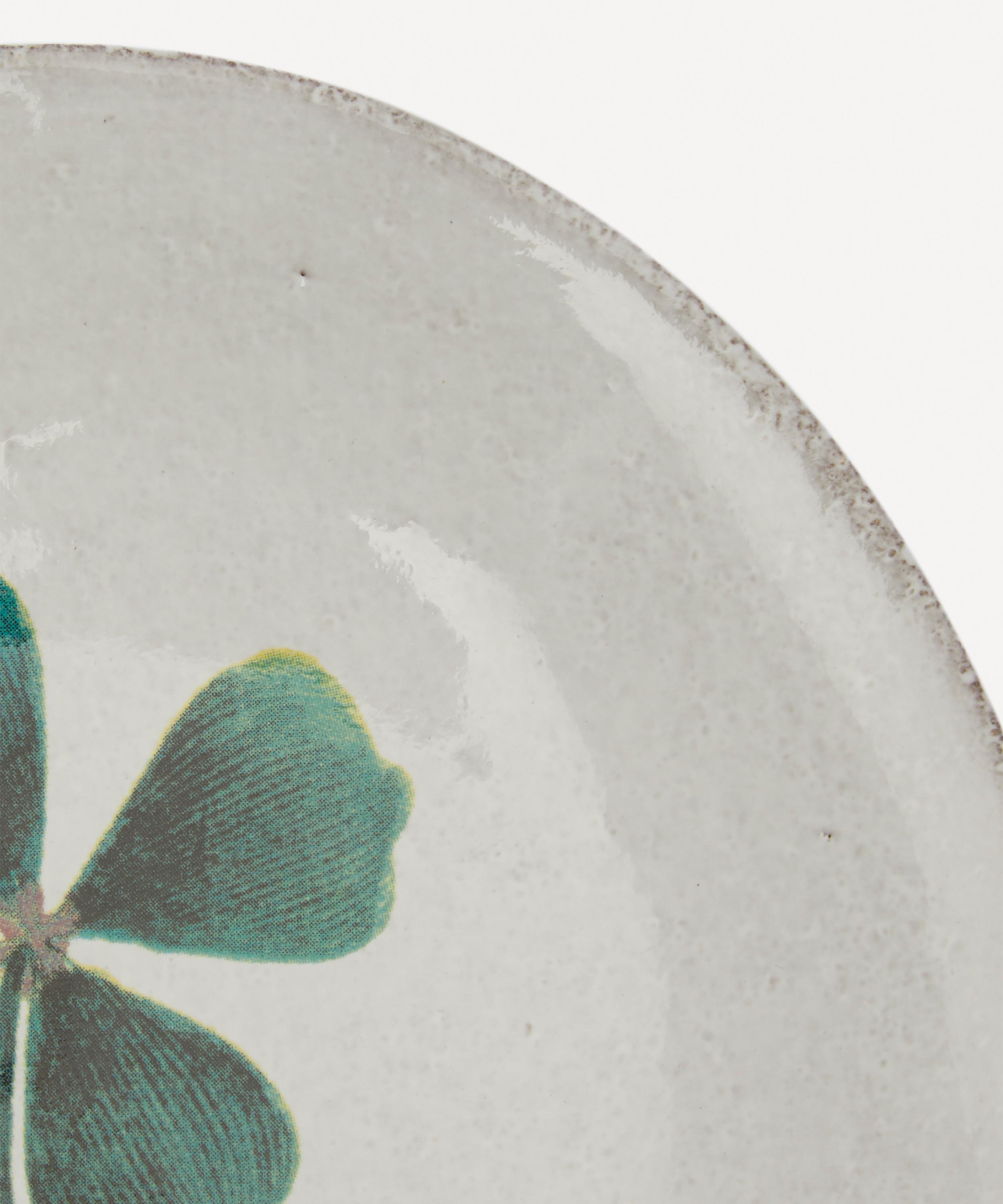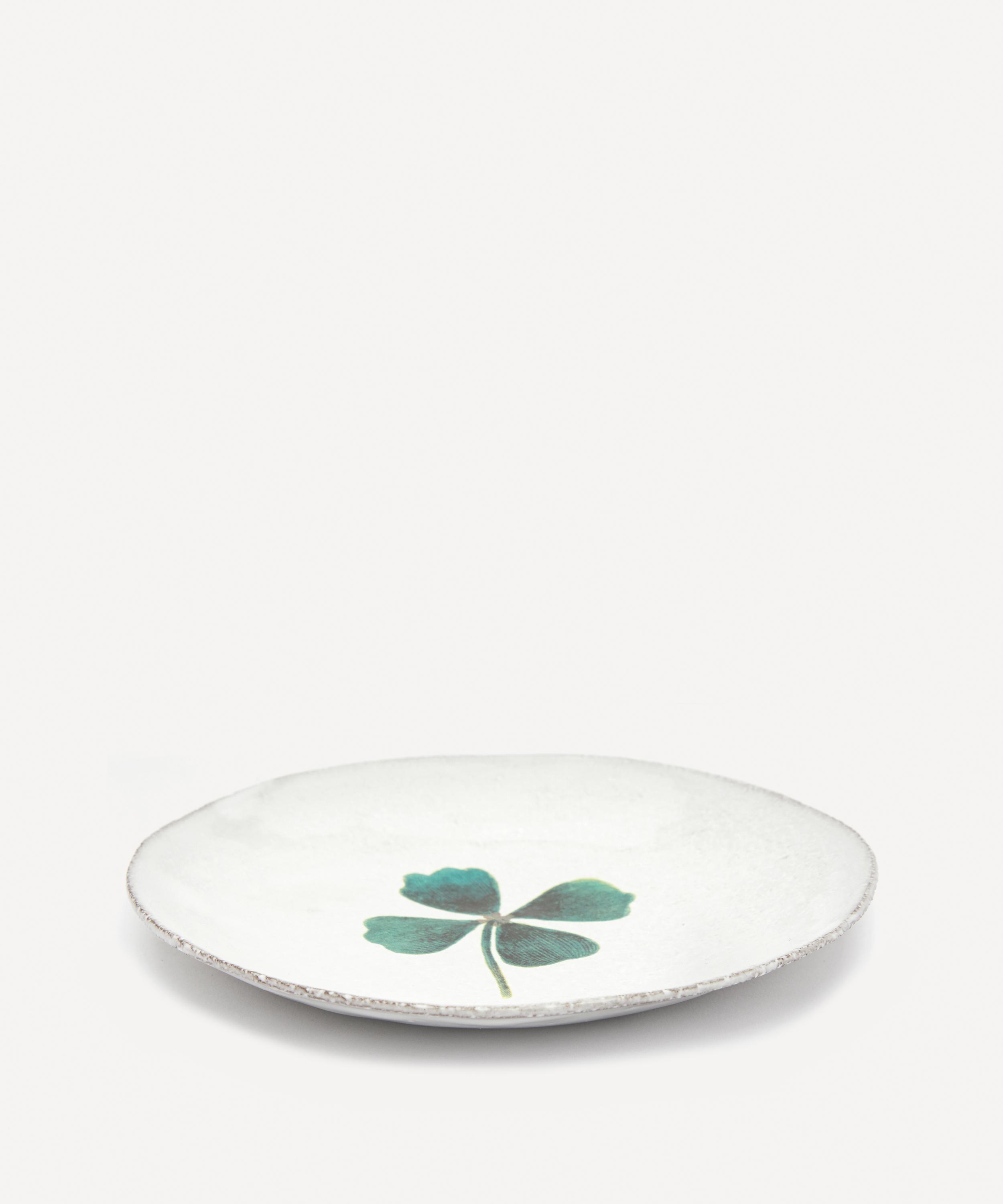 Votary of pre-industrial fabrication, Astier de Villatte is celebrated for being the one and only studio in Paris to hold and harbour the traditions of artisanal ceramic production. Restoring the ancestral systems of moulding and stamping, the Clover saucer is made using techniques from the Middle Ages which involve moulding a sheet of handmade clay, double firing the ‘biscuit’ piece and glazing the product in white enamel – a lengthy process that requires a drying time of up to one month. Characterised by John Derian’s four-leaf clover découpage, the saucer is engraved with the brand’s signature crest - depicting an interlacing A & V - alongside the collaborator's name in block captials. Each handmade piece tells a beautiful story, it romances and imparts a sense of nostalgia into its owner. Pair with other saucers from the John Derian collection for a coordinated decorative approach.