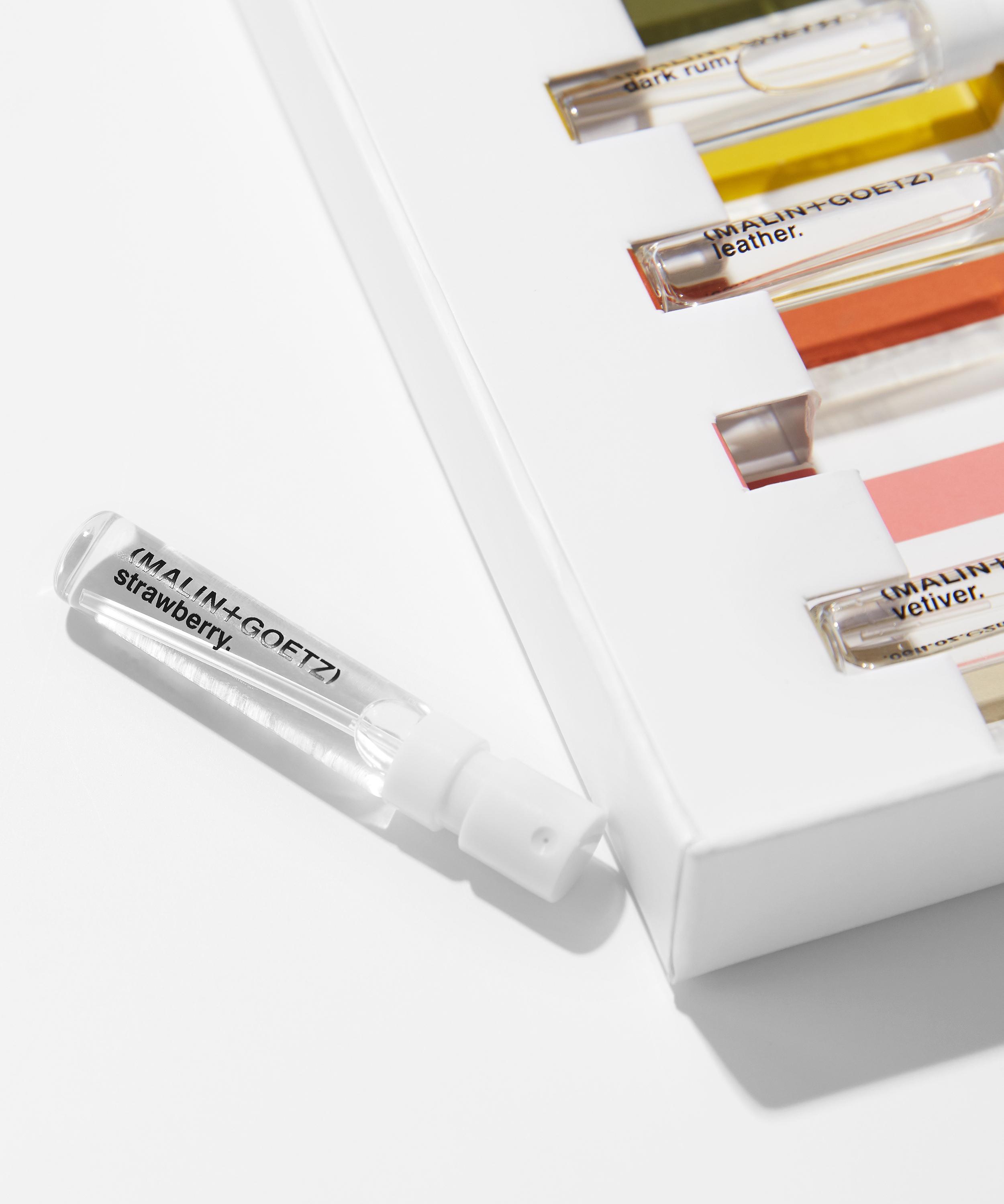 - Fragrance set contains: Bergamot Eau de Parfum 2ml, Cannabis Eau de Parfum 2ml, Dark Rum Eau de Parfum 2ml, Leather Eau de Parfum, Strawberry Eau de Parfum 2ml, Vetiver Eau de Parfum 2ml