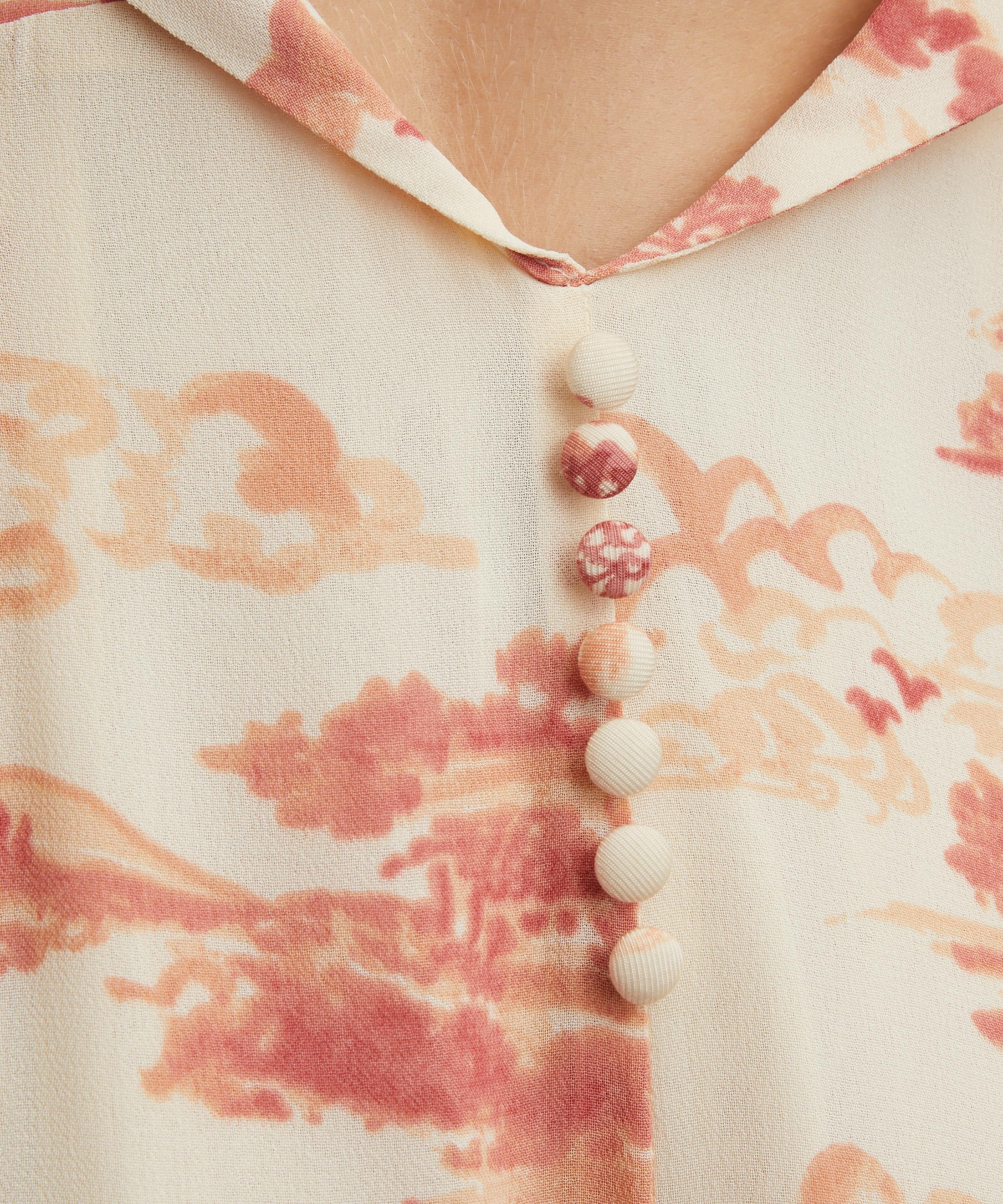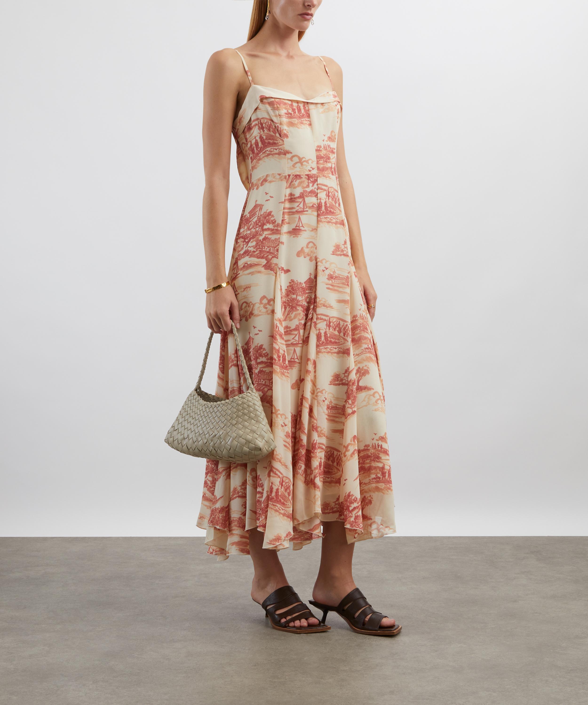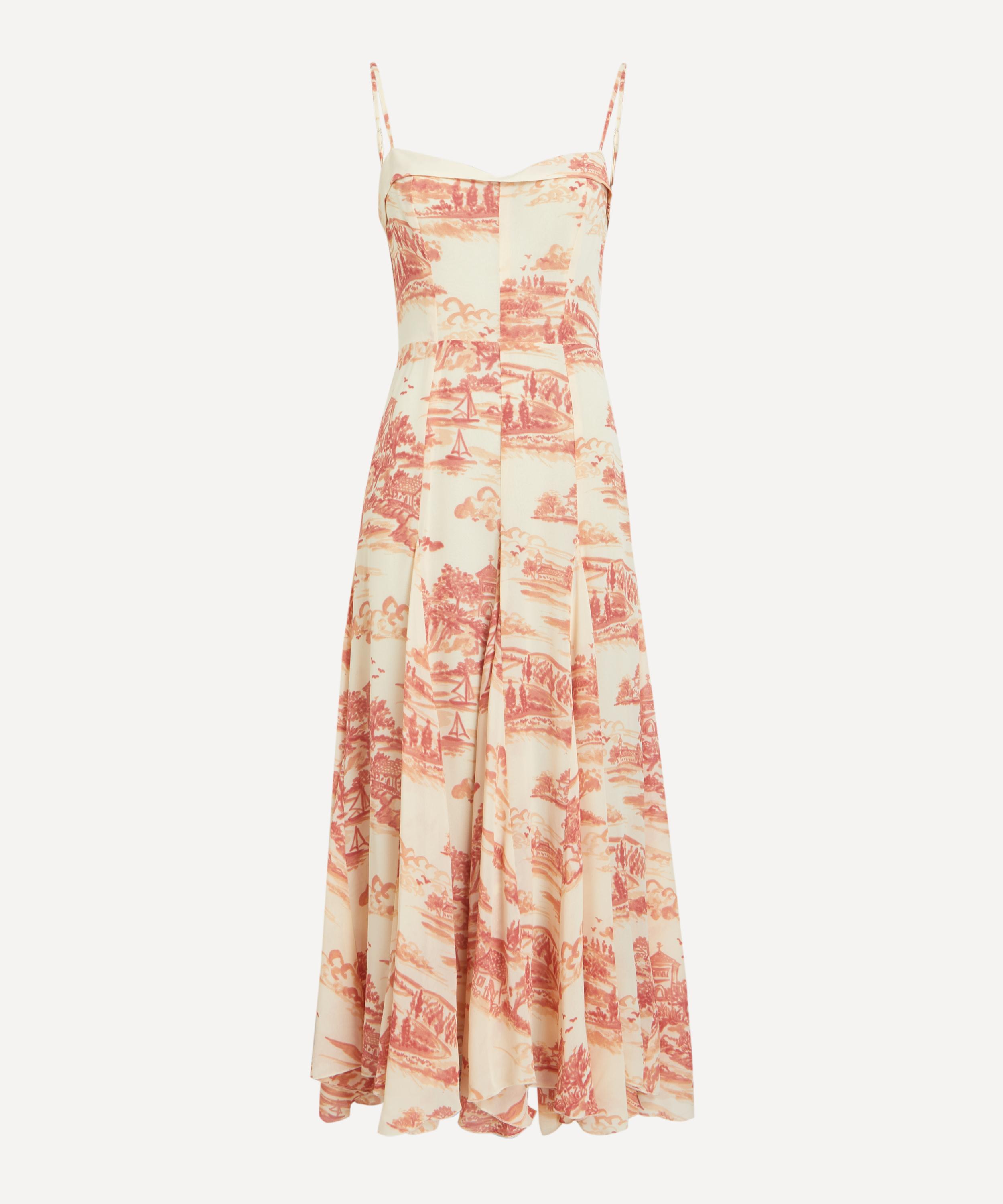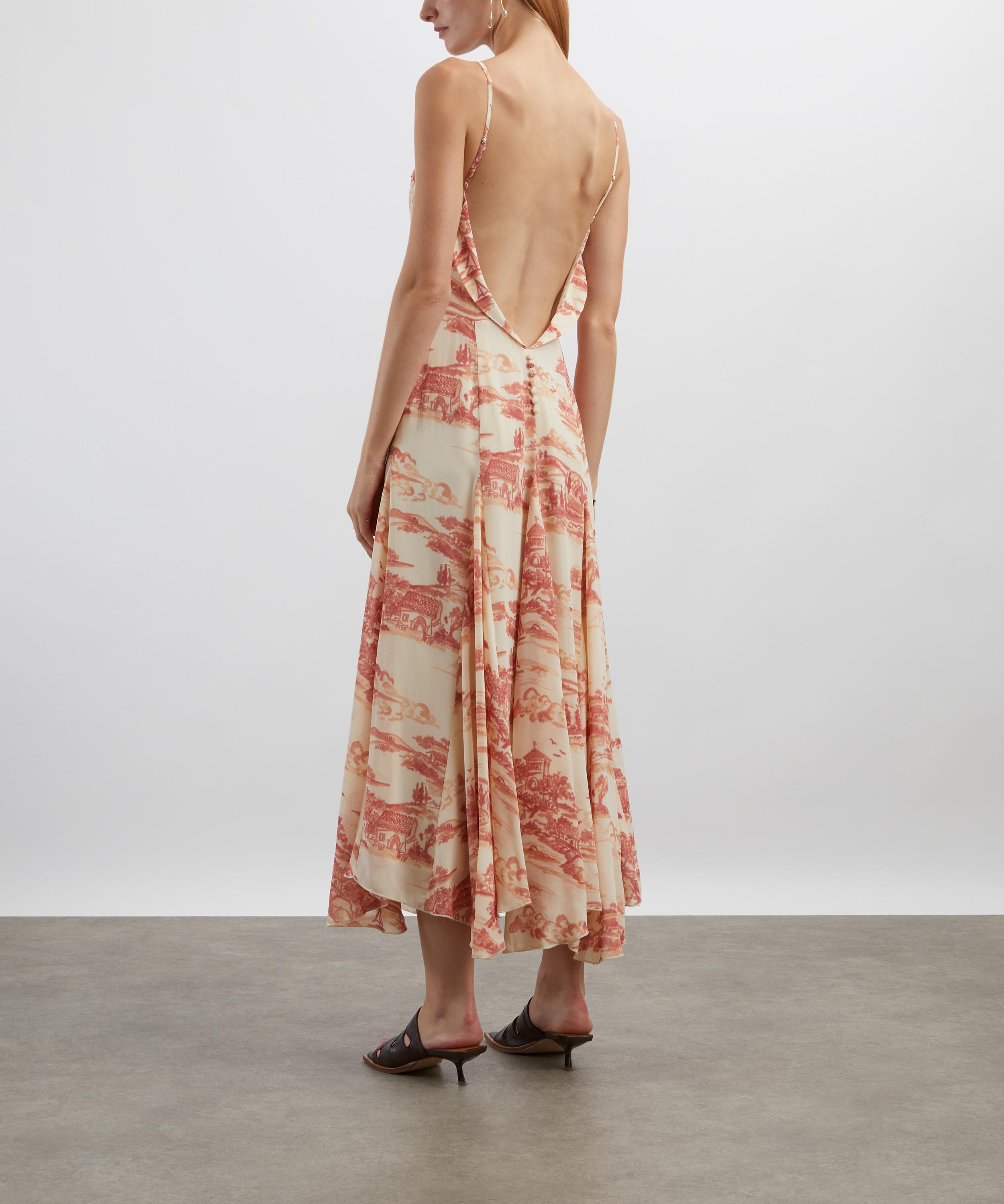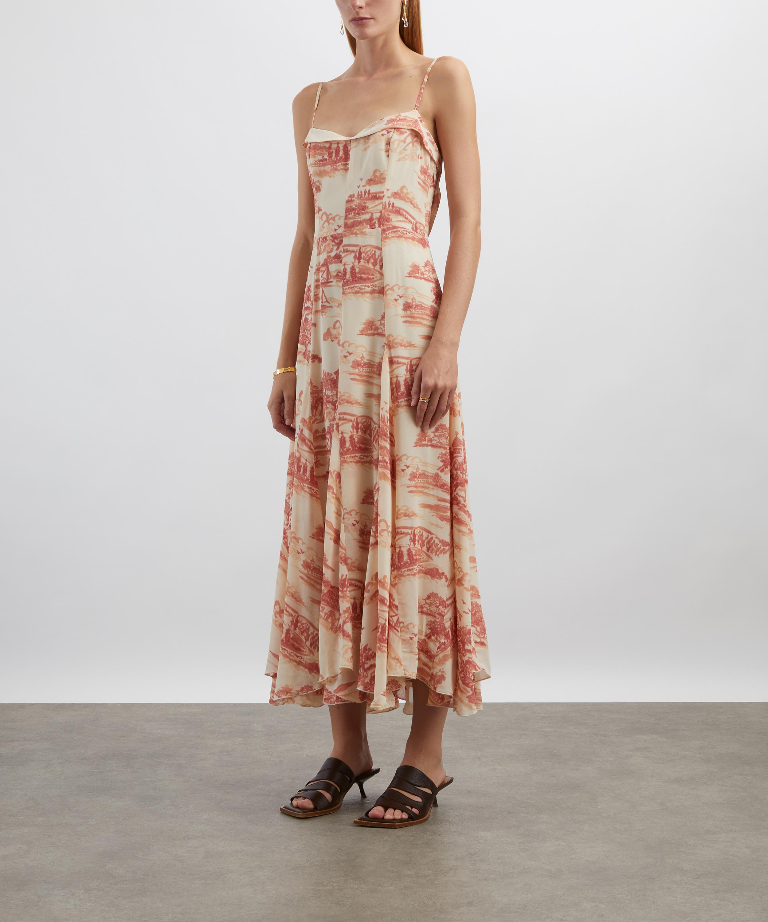 Crafted from lightweight georgette with a classic toile de jouy print, this elegant midi dress features a fitted bodice, draped sweetheart neckline, and delicate spaghetti straps. Finished with an open back and a flowing A-line skirt, it offers a timeless, feminine silhouette.