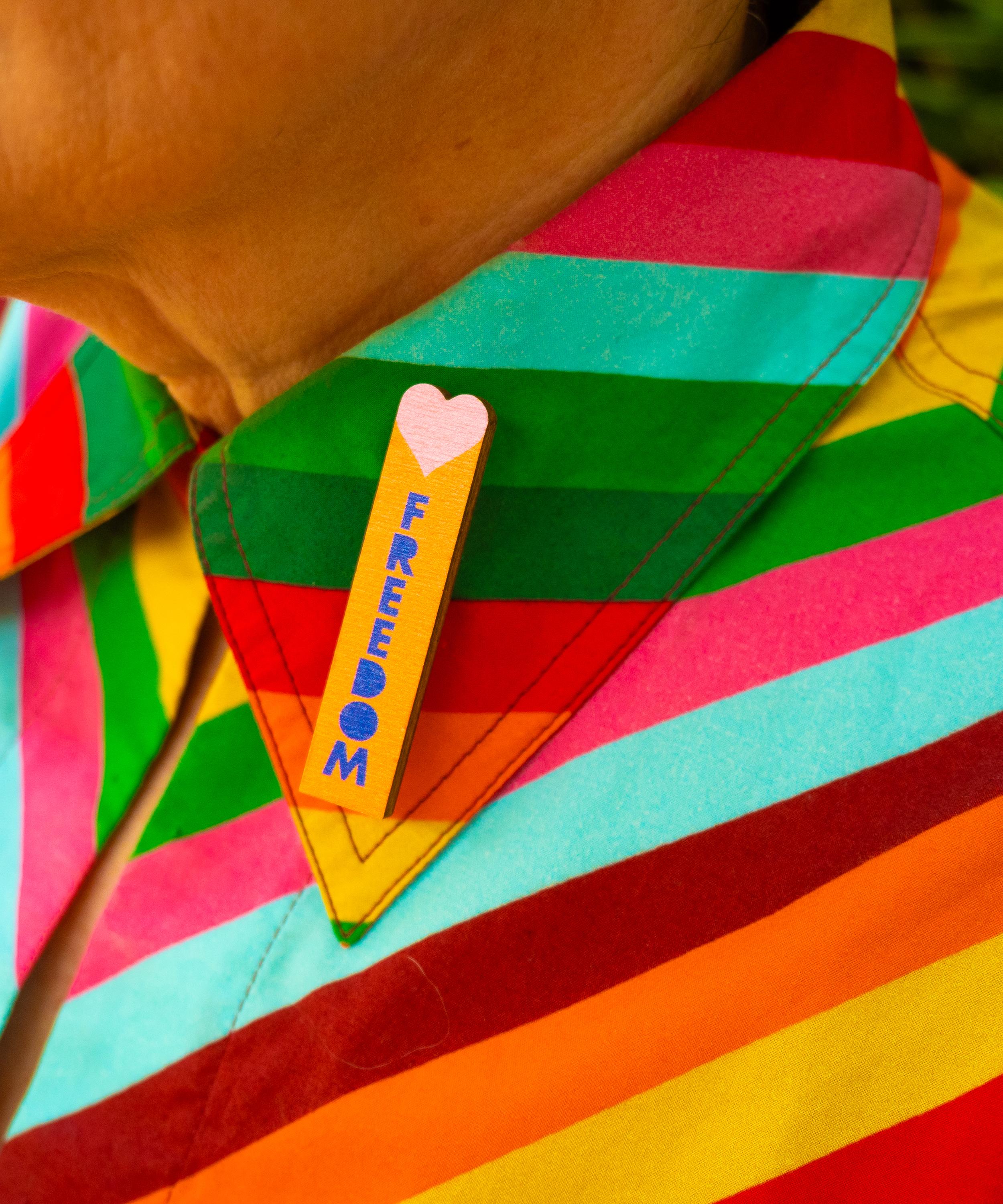 Meticulously crafted into a lapel pin design, this wearable piece of art has been laser cut from birch plywood and digitally printed with a graphic pink hearts and blue text, reading ‘FREEDOM’. Add it to the lapels of a favourite blazer or denim jacket for a decorative flourish.