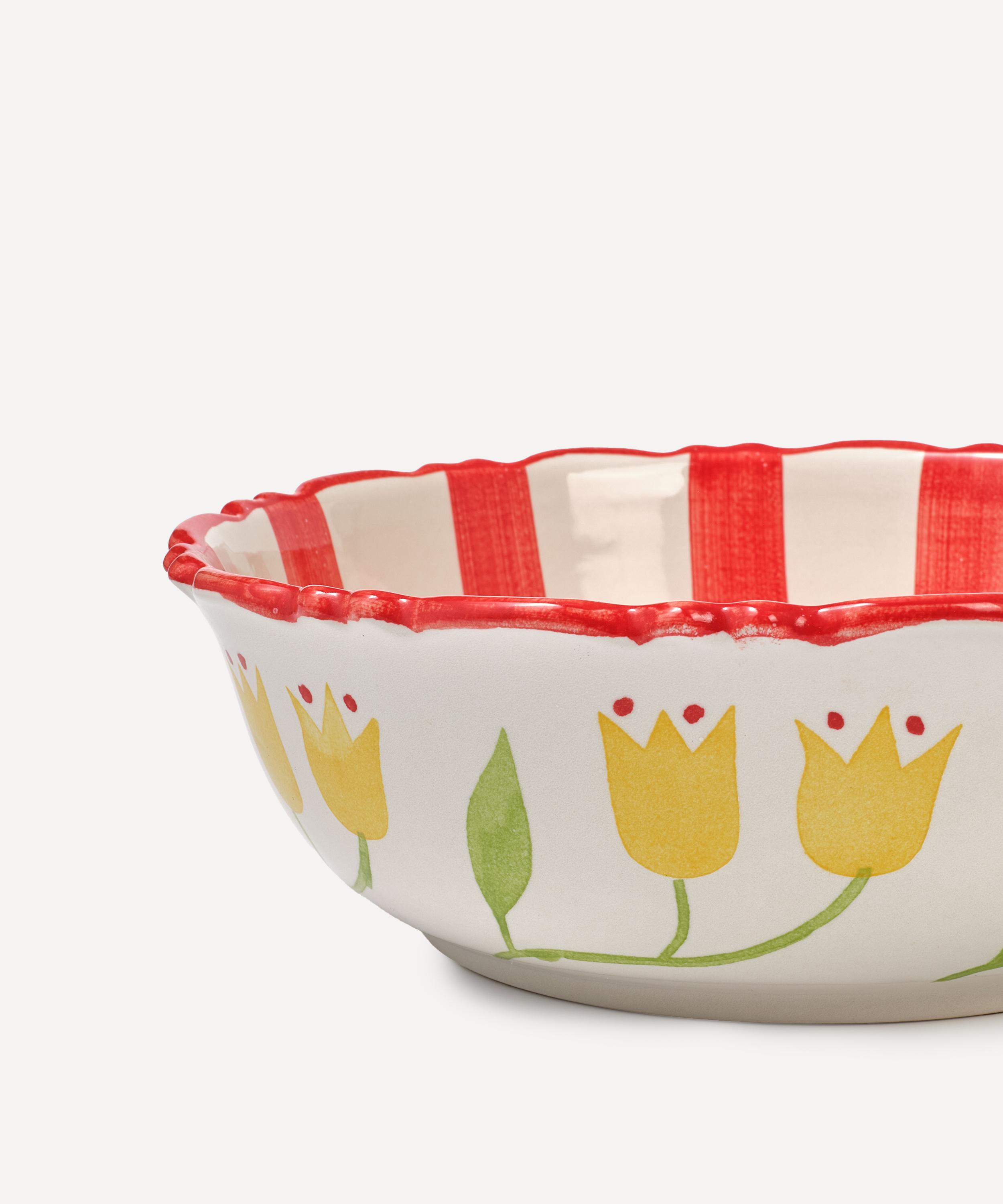 A celebration of all things Summer this bowl features a vintage-inspired bold red stripe with tulips wrapping the outside - hand painted for true whimsical charm. Presenting a generous silhouette and complete with a frill edge, use to serve seasonal salads when entertaining family and friends.About Damson Madder