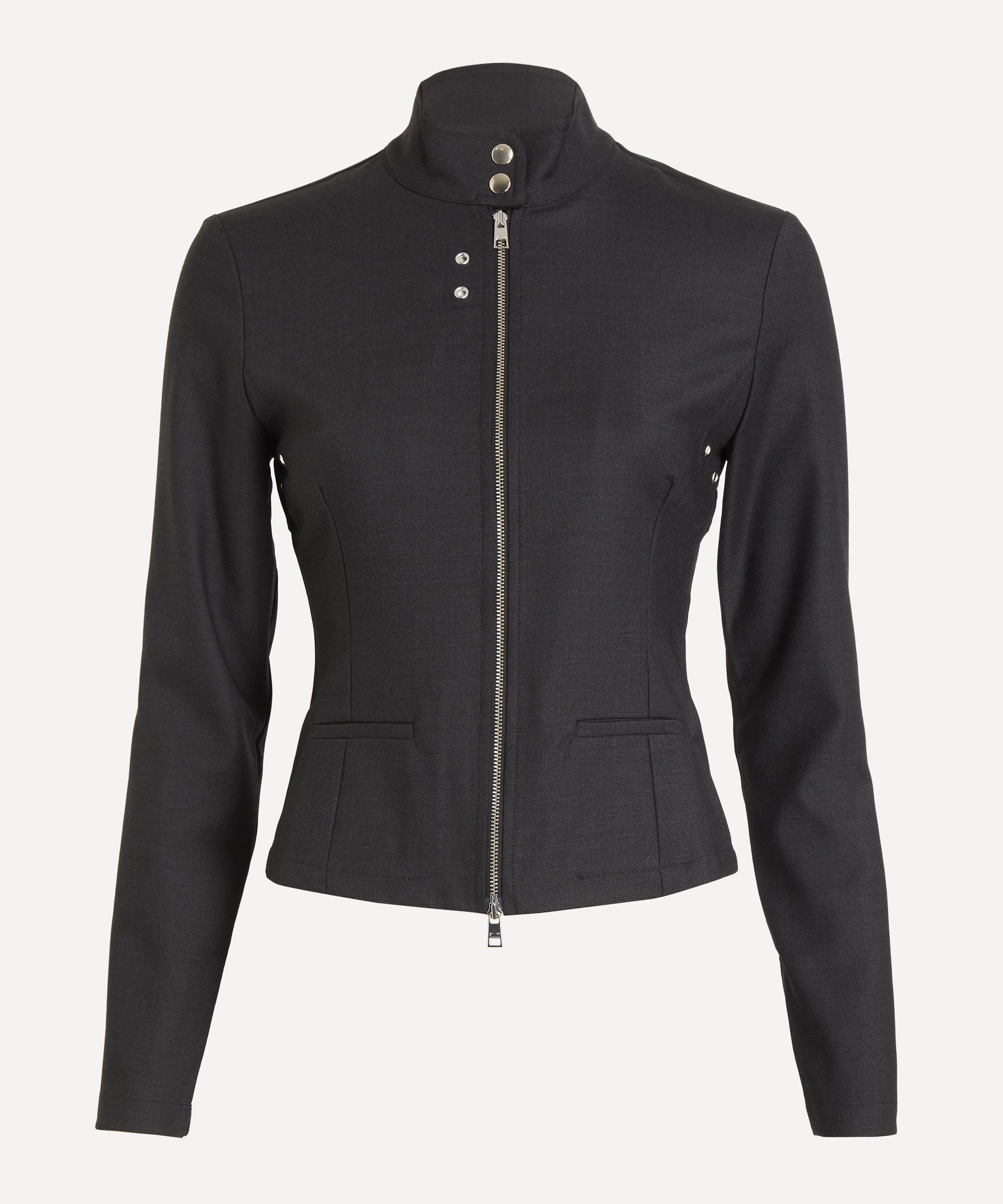 Cut from wool to a slim-fitting silhouette, it features a funnel neckline, a two-way zip fastening and two welt pockets. Style it with tailored trousers for a sharp, streamlined finish.