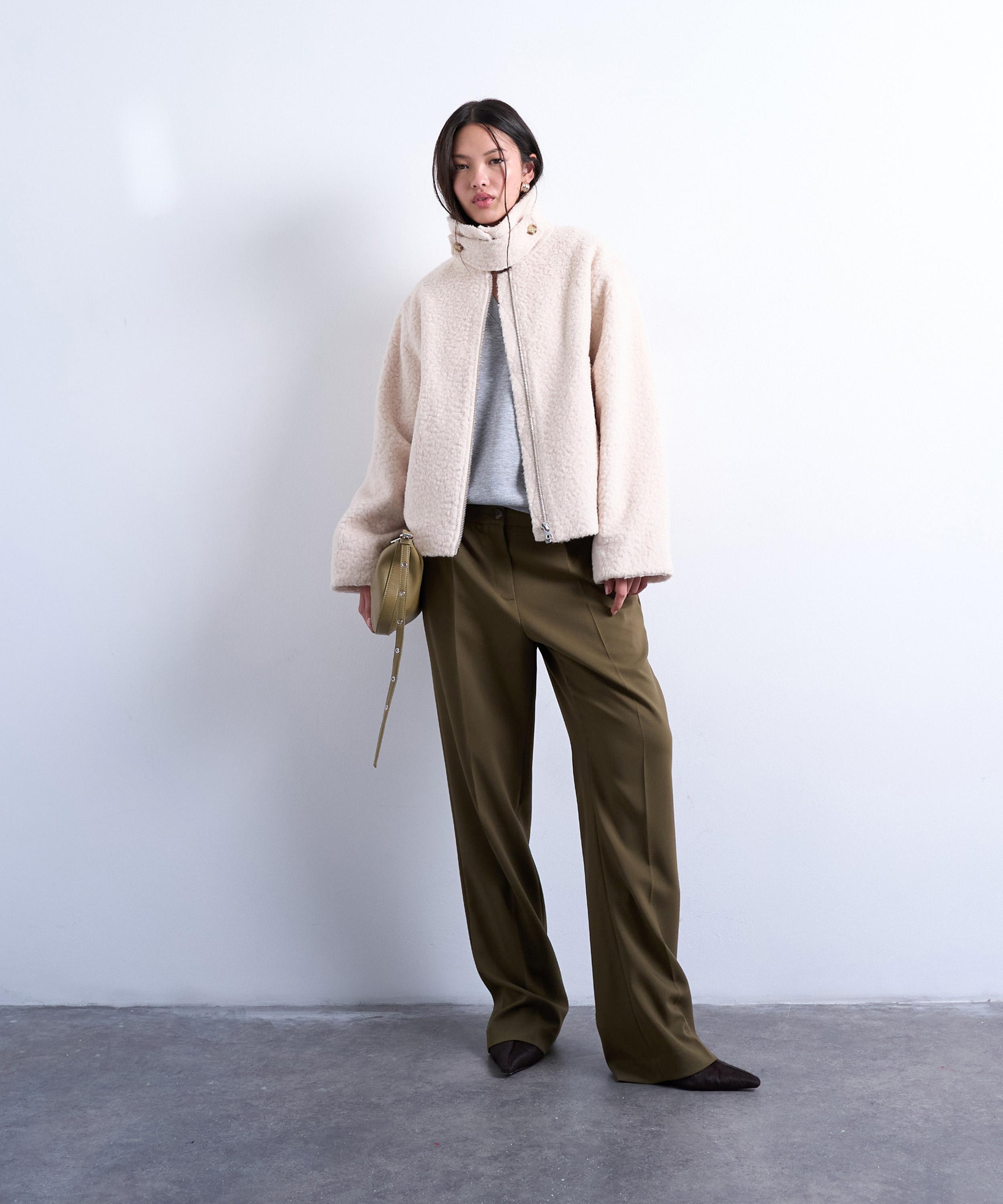 Crafted from a soft textured boucle fabric in a delicate, creamy white hue, this stylish bomber jacket has been cut for a boxy fit and features a tab collar, a zip-front closure, and full lining on the inside for added warmth and comfort.