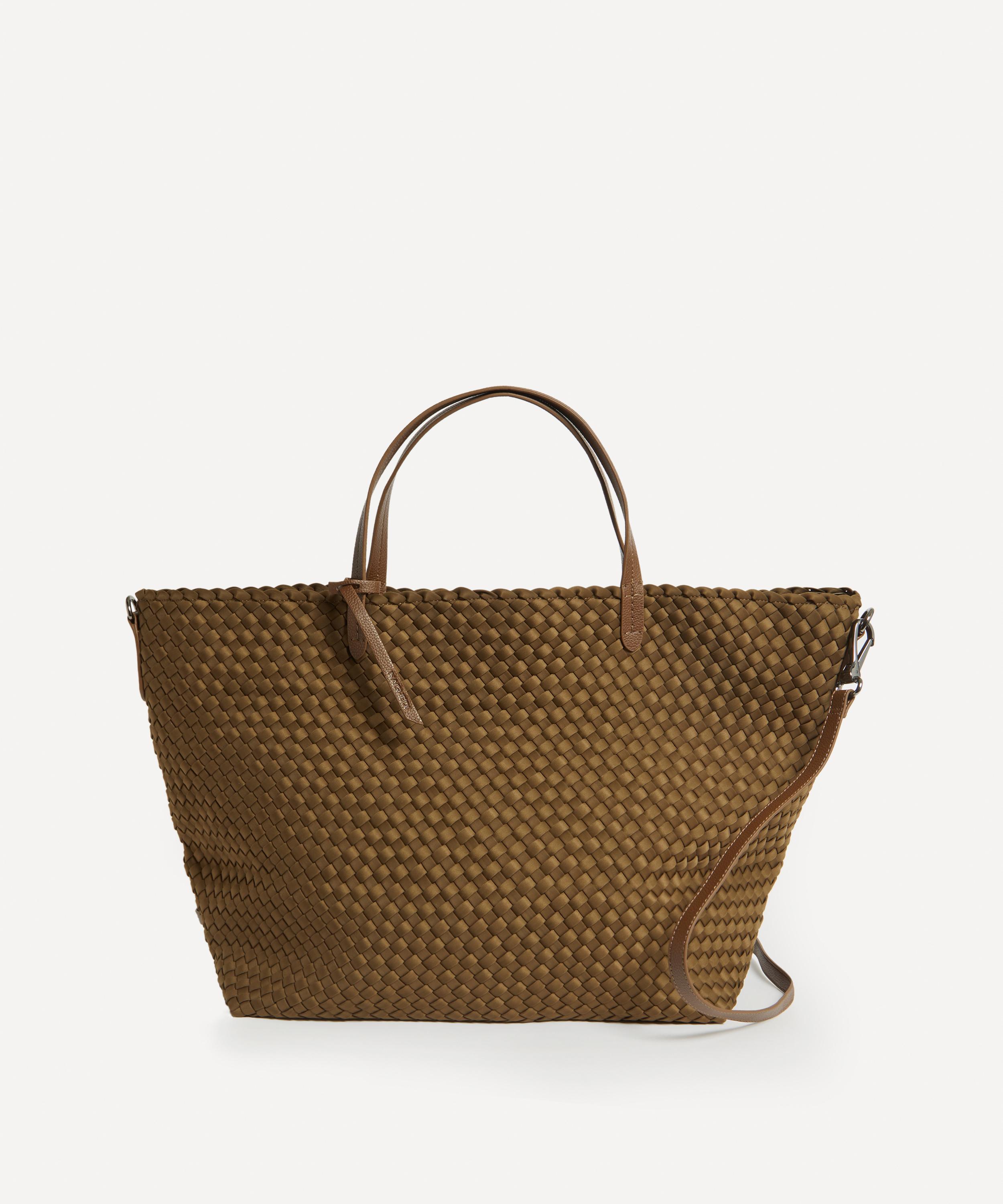 The Geneva Weekender tote bag is hand-woven from durable neoprene fabric by New York-based accessories brand Naghedi. Crafted by skilled weavers, this bag features a structured base with a spacious main compartment, interior pockets, and a zip closure to keep your essentials secure - complete with two top handles and a removable strap it’s set to become your new favourite travel companion, for this season and beyond.