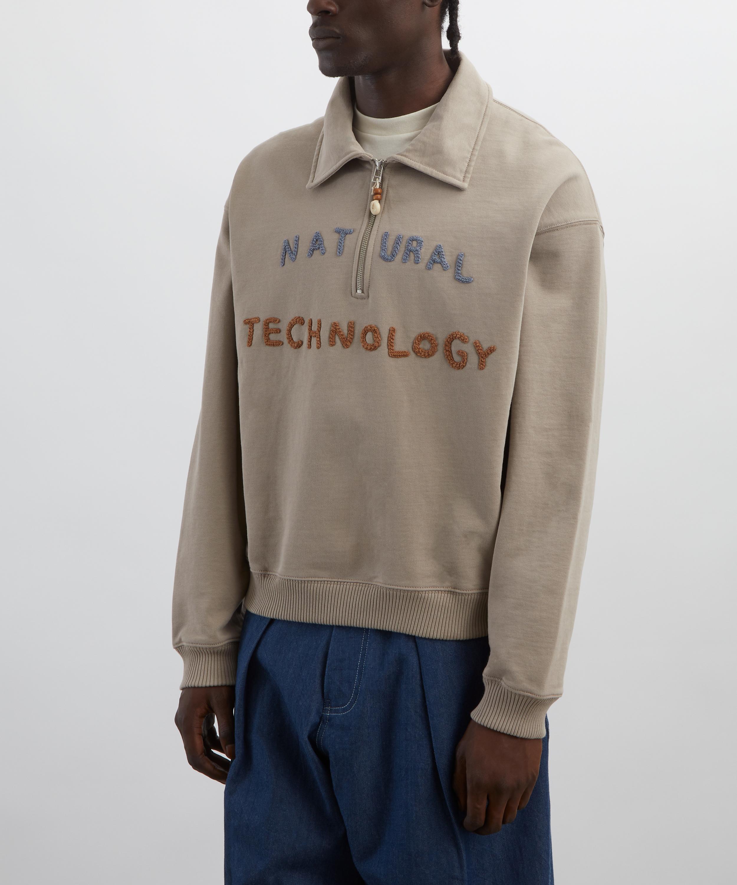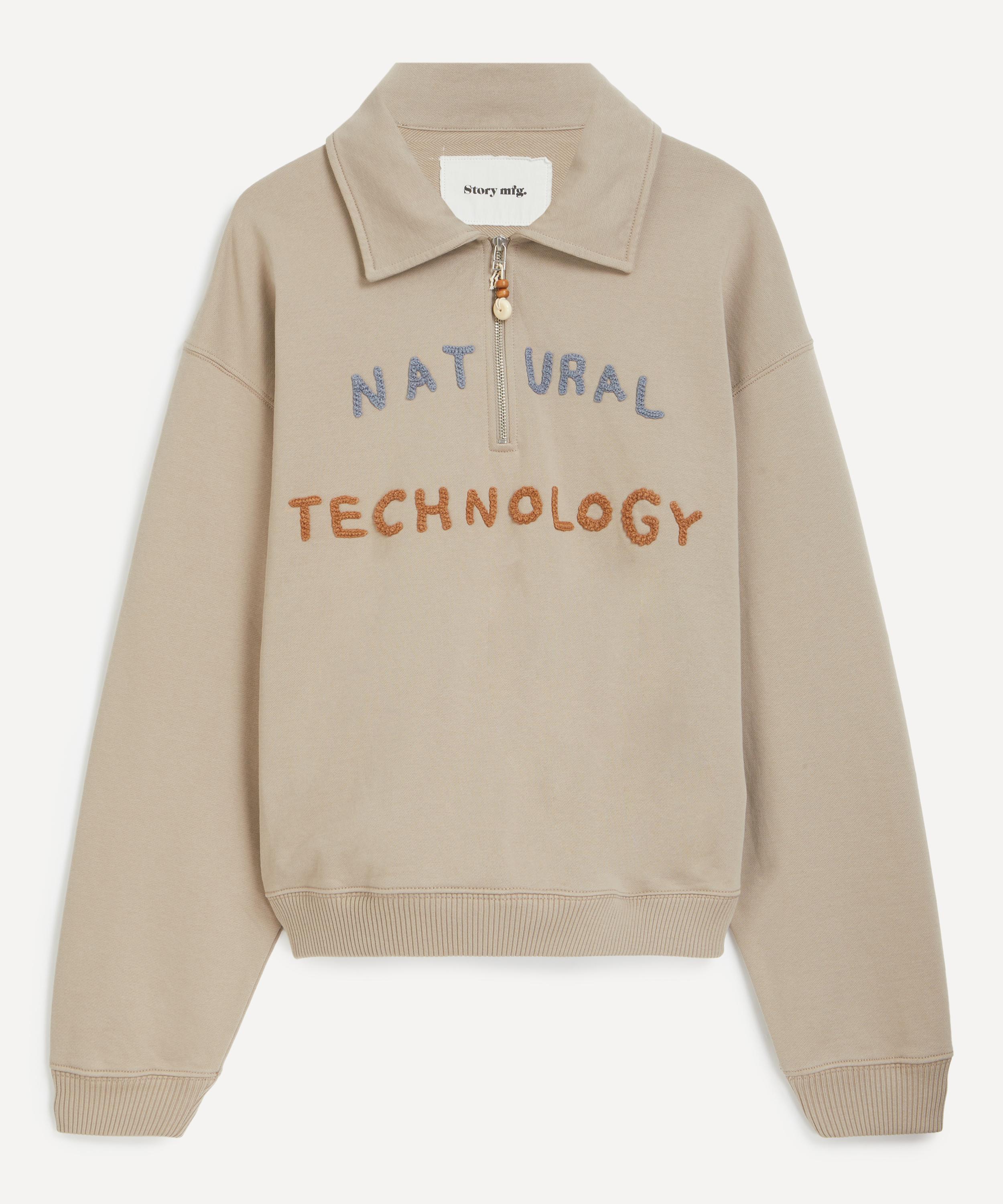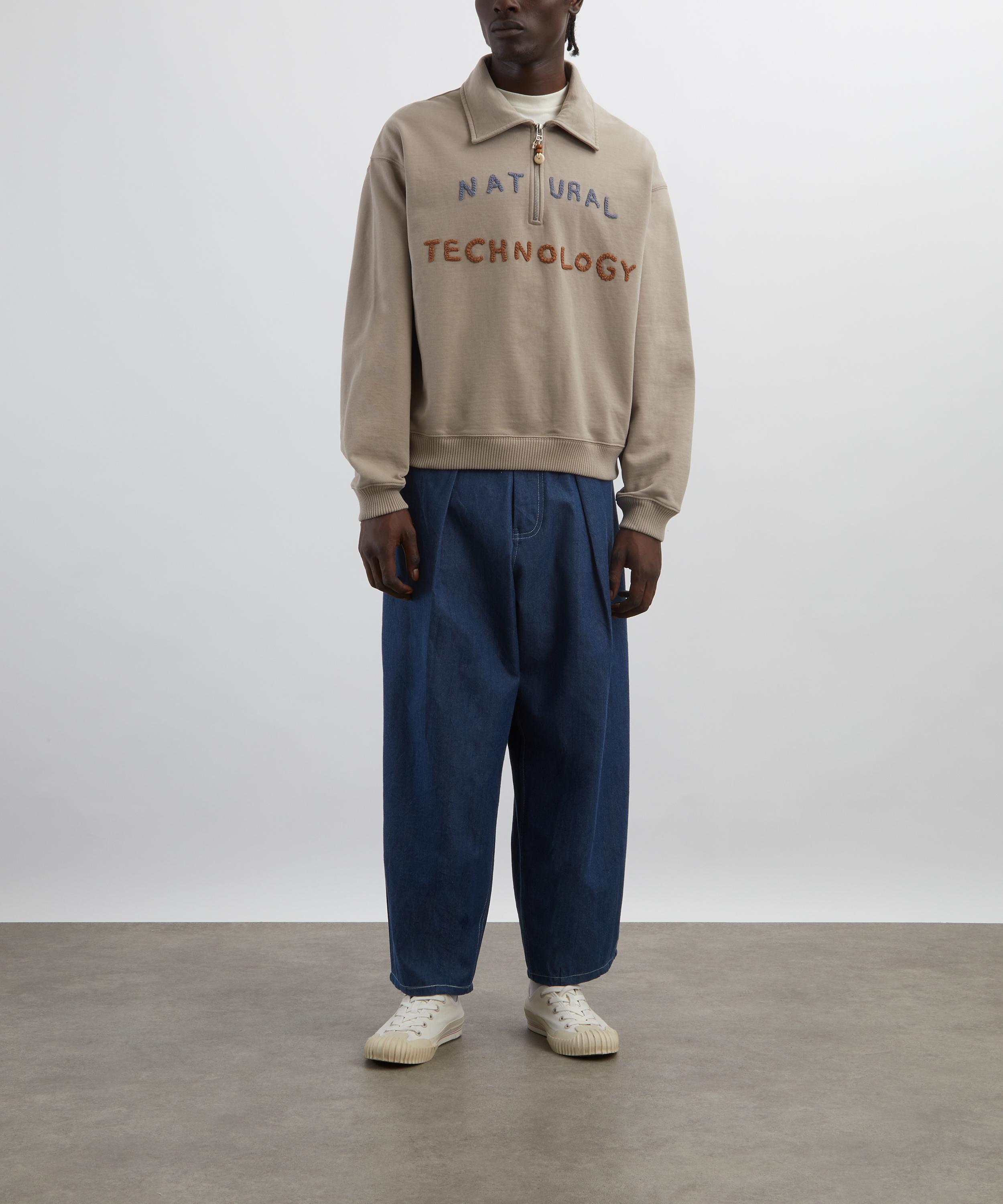 Made from heavyweight cotton jersey, the Geo Pullover features a boxy, slightly cropped fit with a spread collar, partial zip, and hand-crochet lettering across the front.