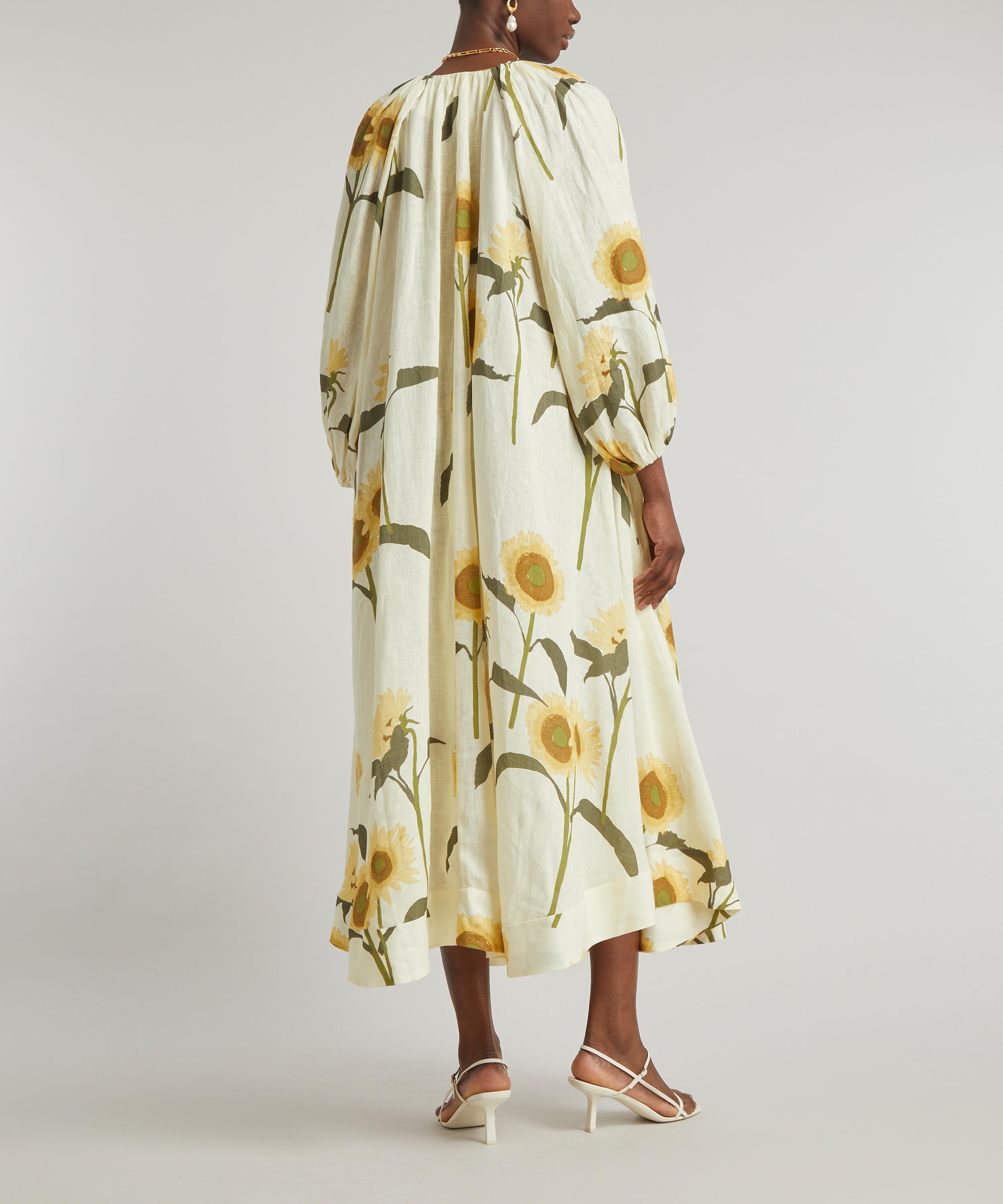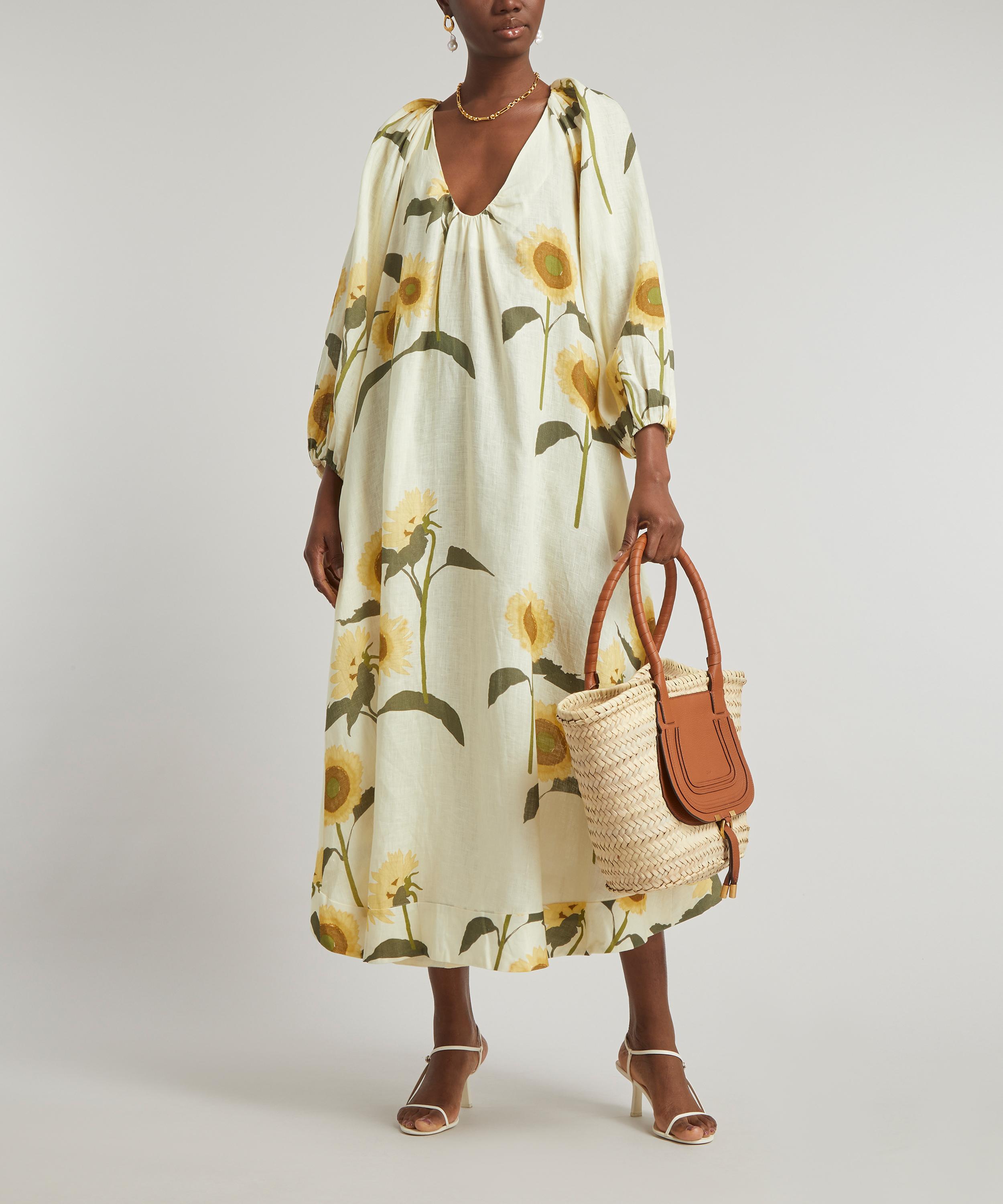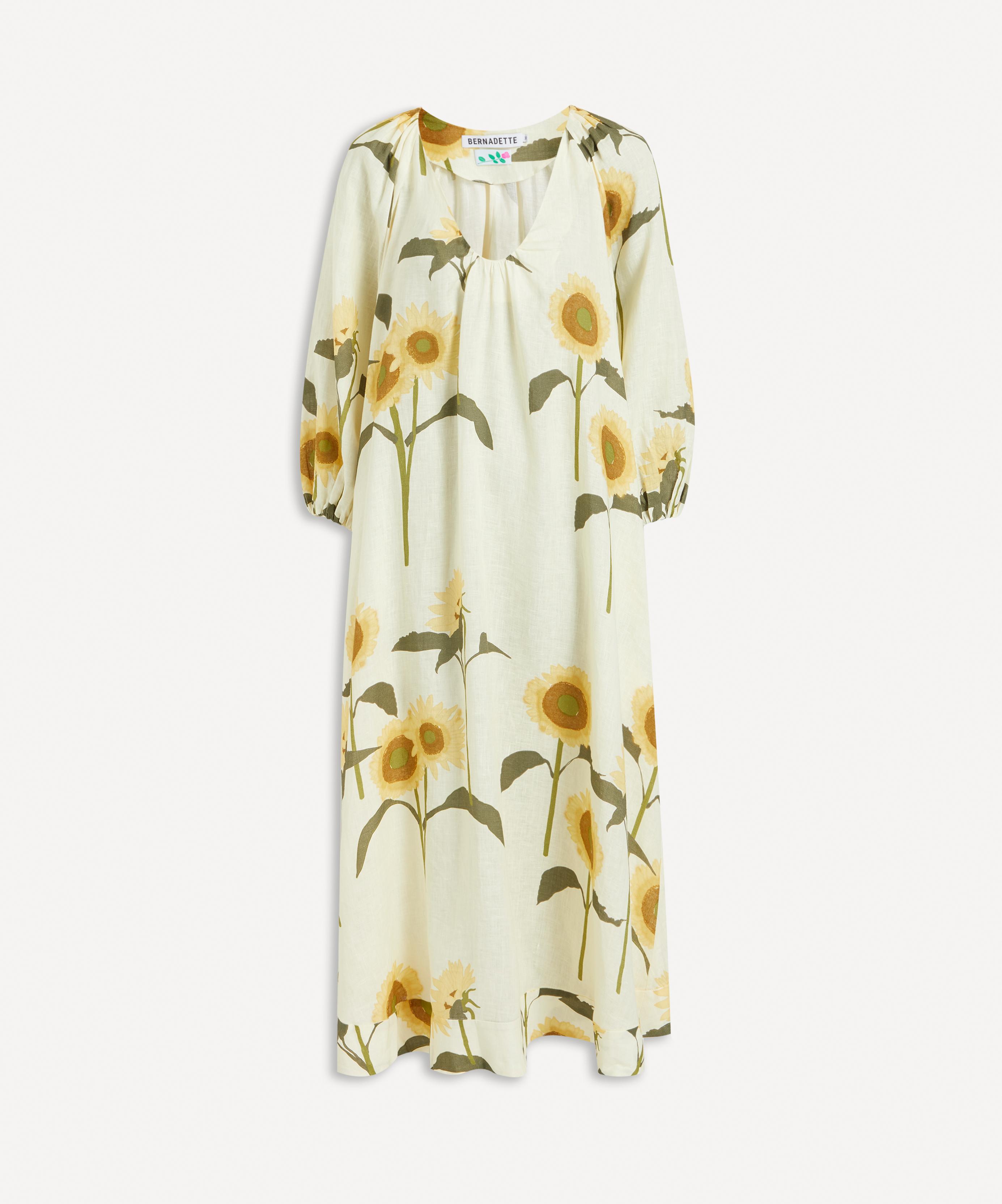 Bold and breezy in lightweight linen, the Georgette maxi-dress from Bernadette hints at the Antwerp-based brand’s classical and botanical influences with its uplifting sunflower motif.